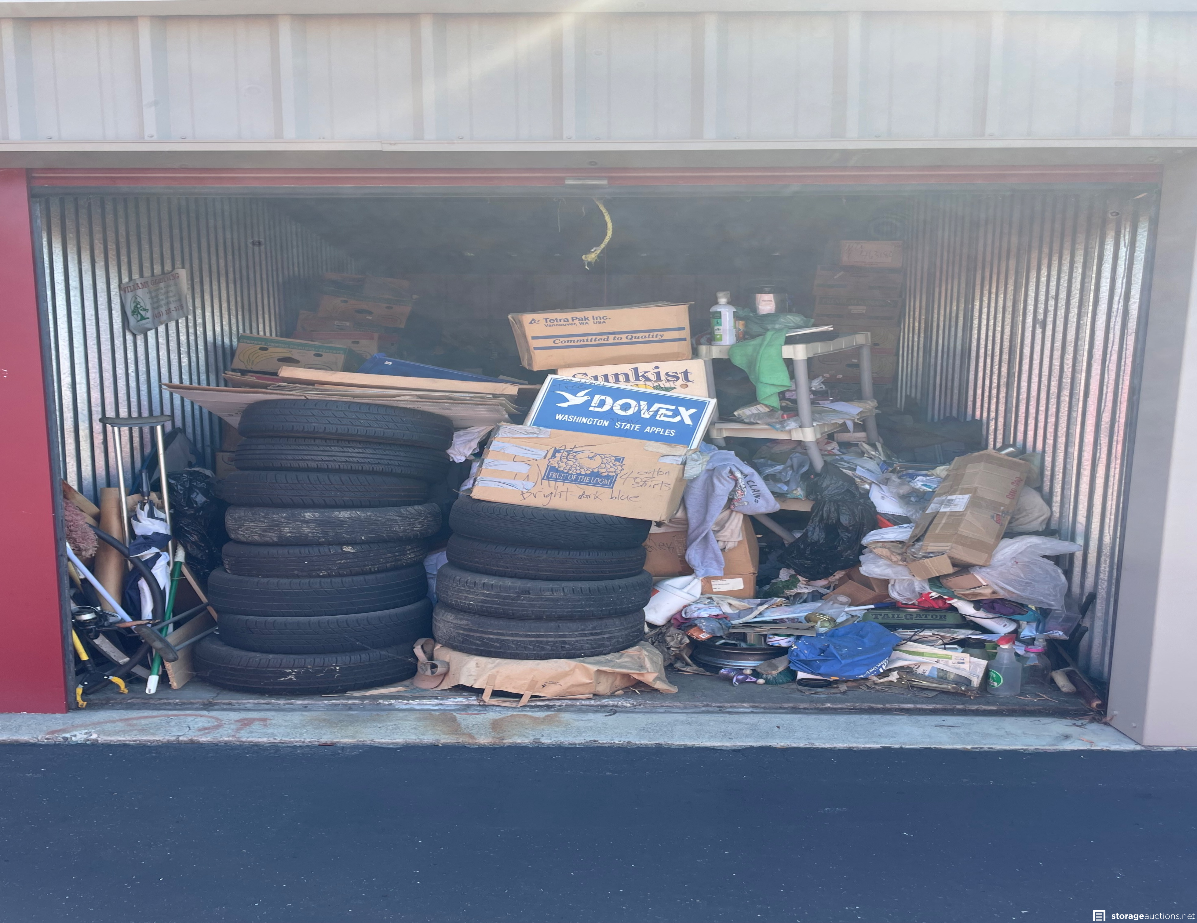 Random household items. Tires. Boxes of clothes. Random tools/sporting equipment.