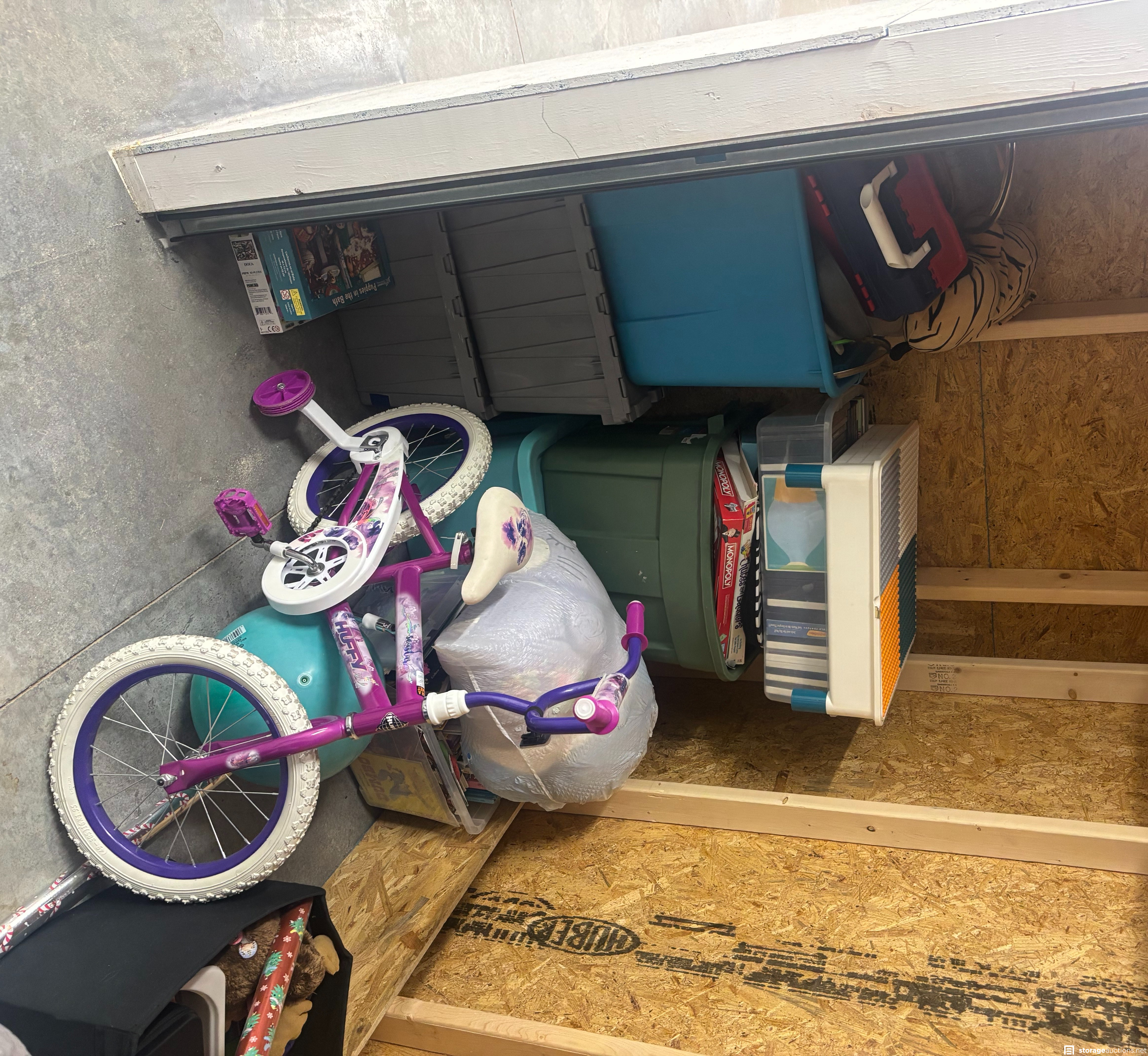 This storage unit contains a variety of household items, children’s toys, and storage bins. Visible contents include multiple heavy-duty plastic totes filled with assorted items, a small children’s bicycle with training wheels, board games (including recognizable titles), books/media, and a large quantity of bagged soft goods such as clothing, blankets, or plush toys.
