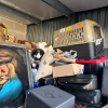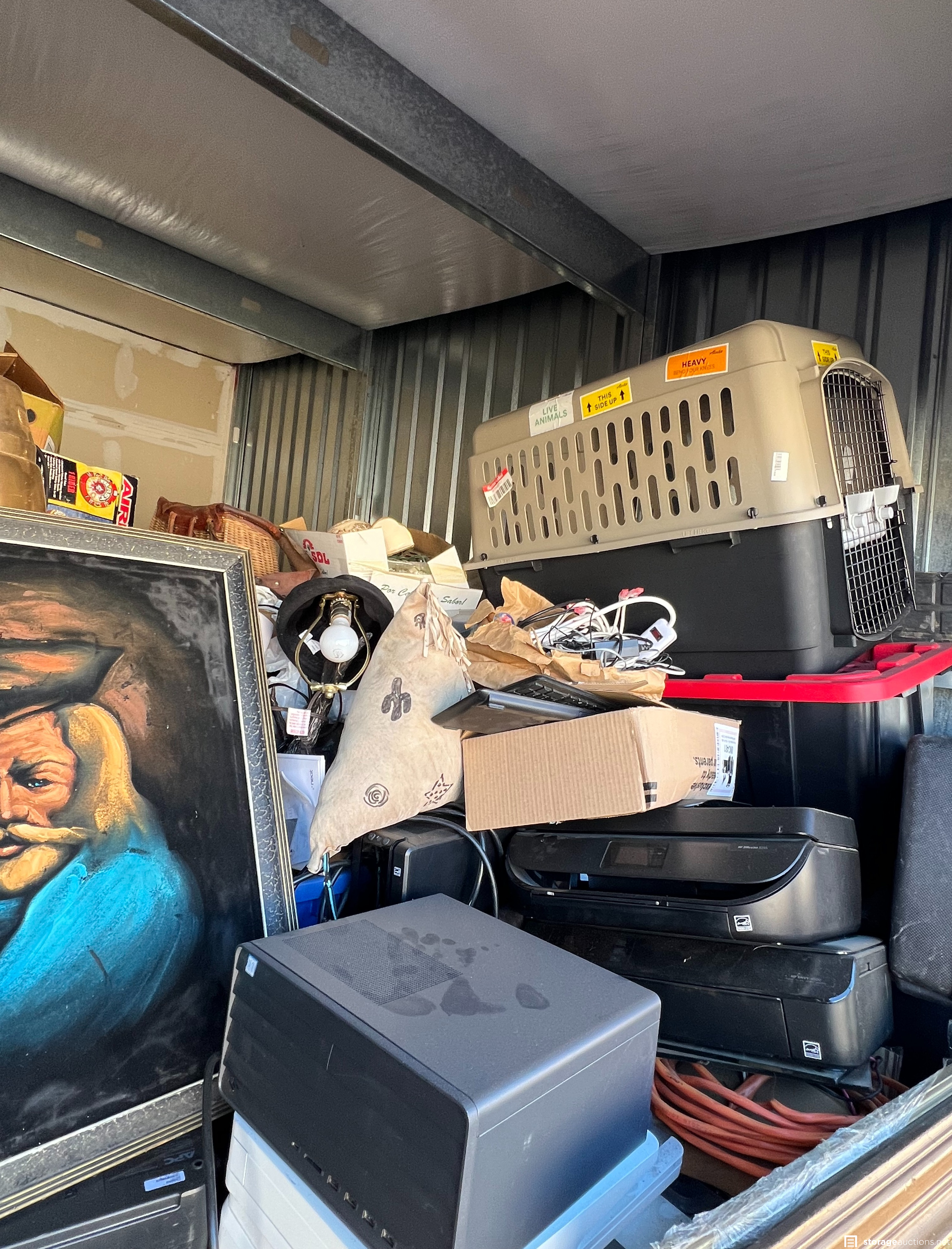 There appears to be art, pet carrier, metal file cabinet, tile, printers, computer stuff, antique fishing creel, job box, drink dispenser, stool, suitcase, air hose, extension cord, extension ladder, mini fridge, dresser, jack stands, fishing pole, neon sign, vacuum, wooden chairs, lamp, mannequin, books, and other misc. items.