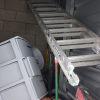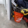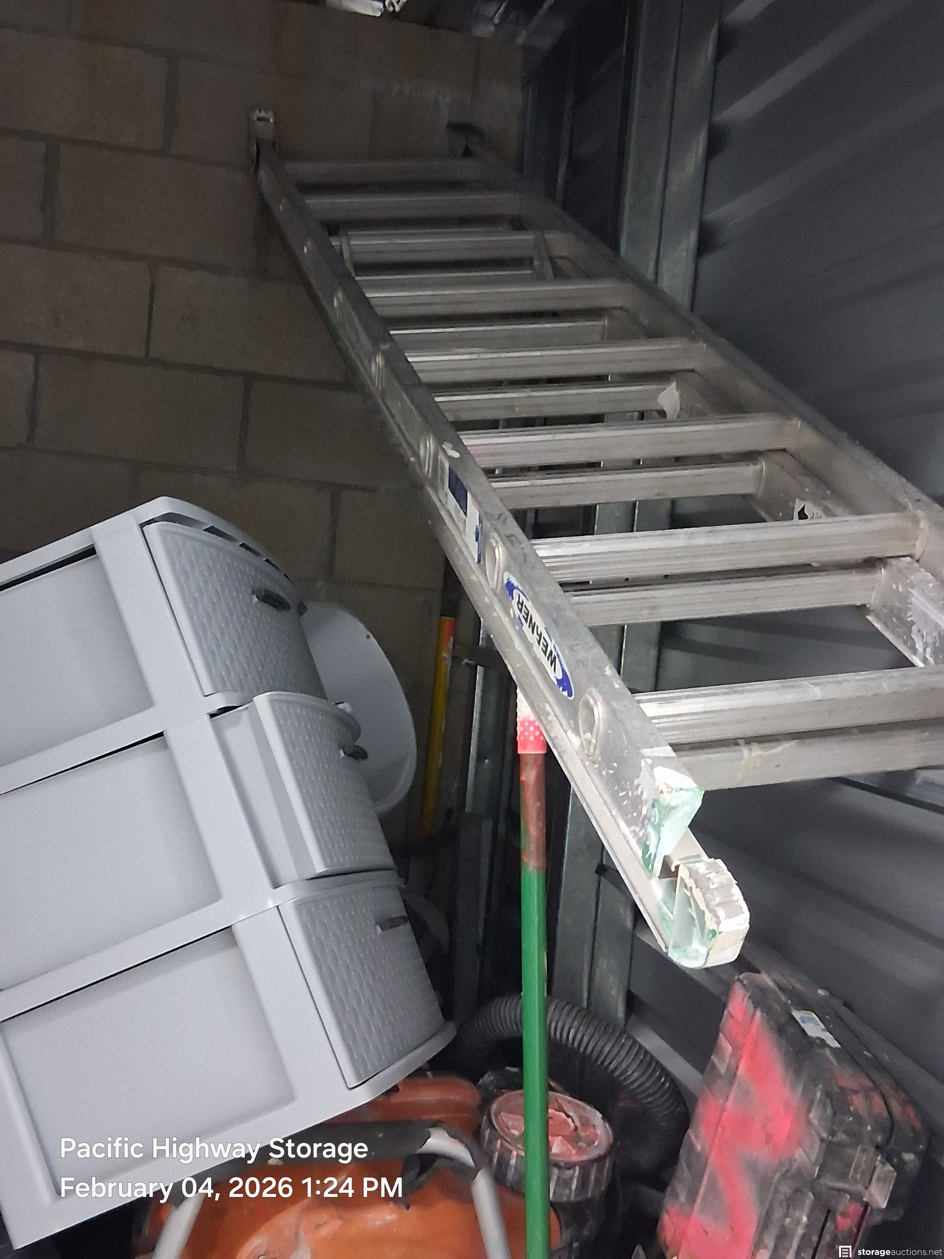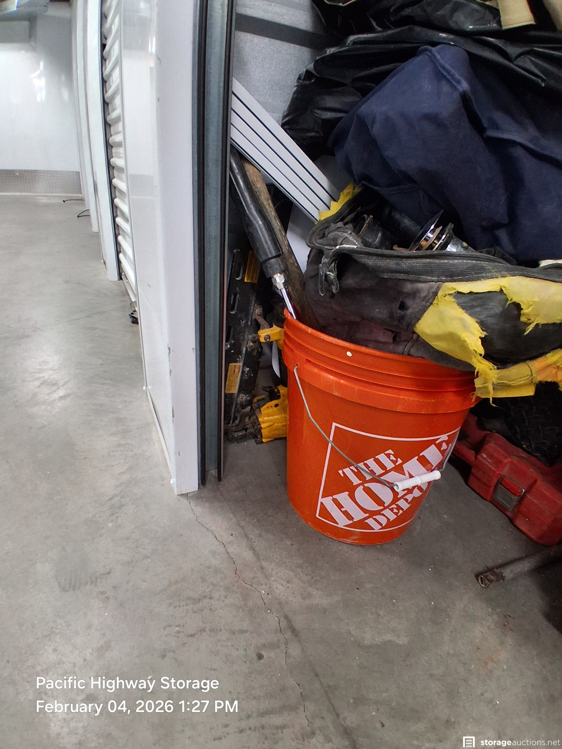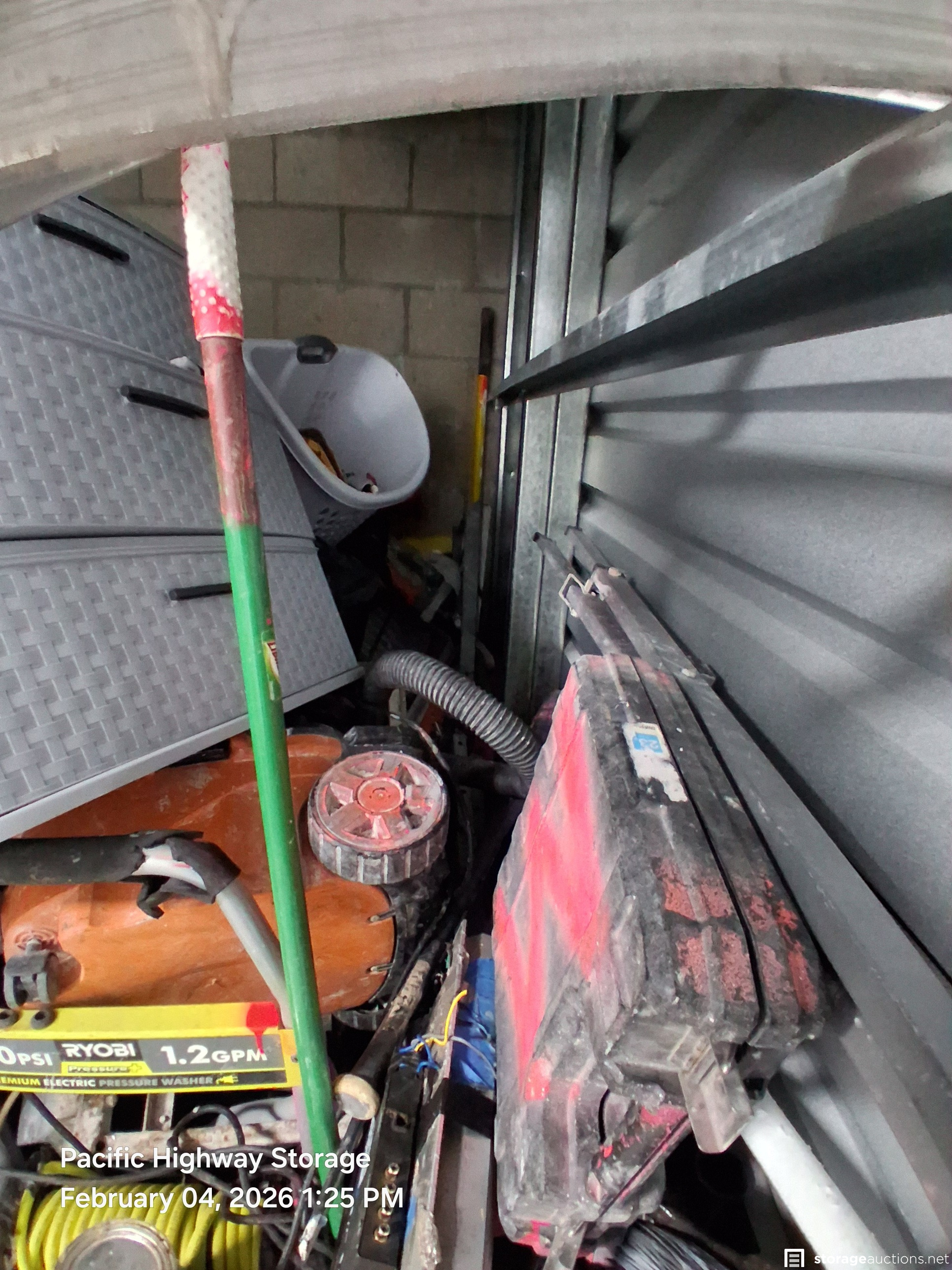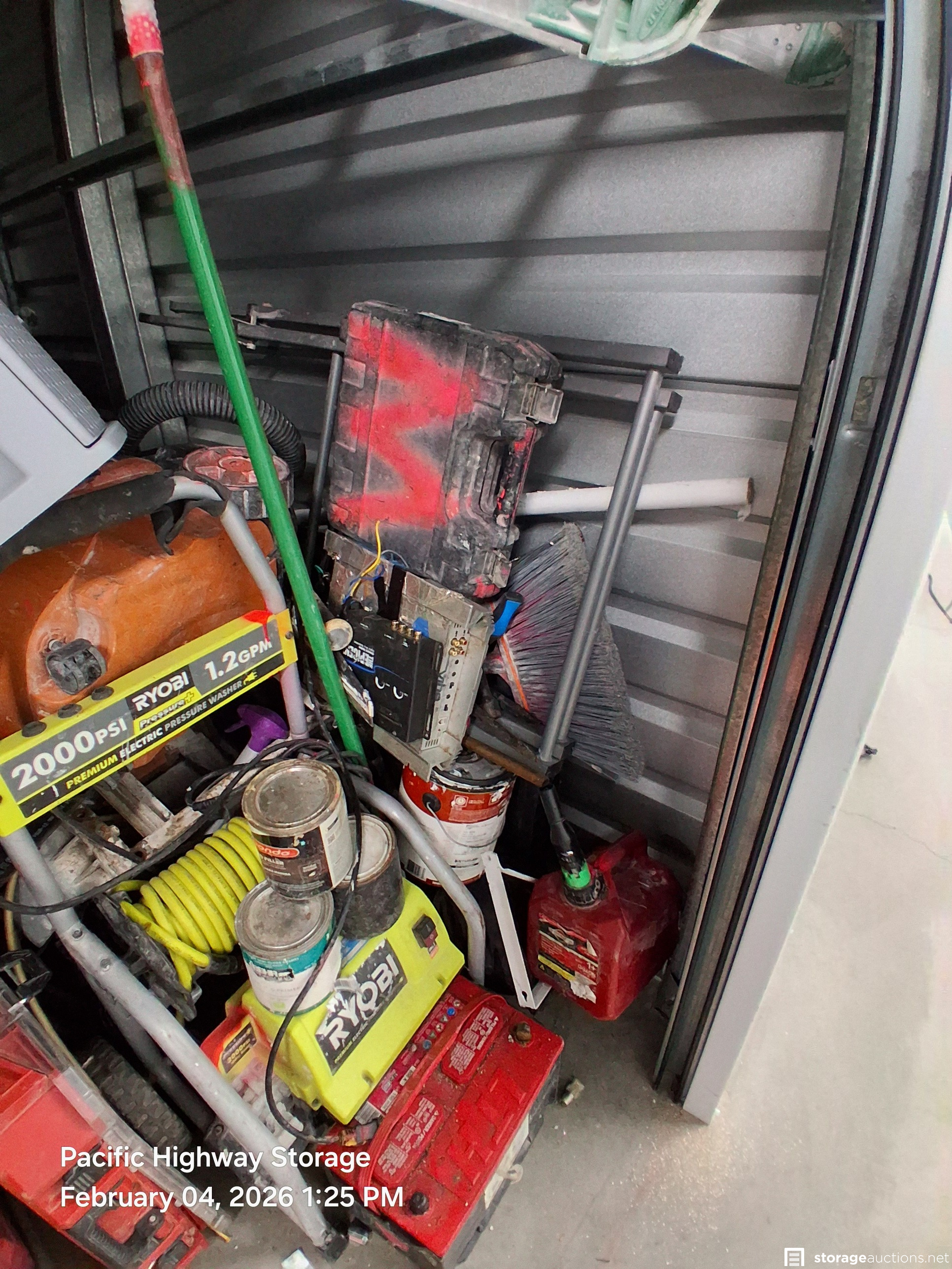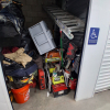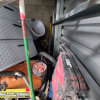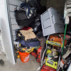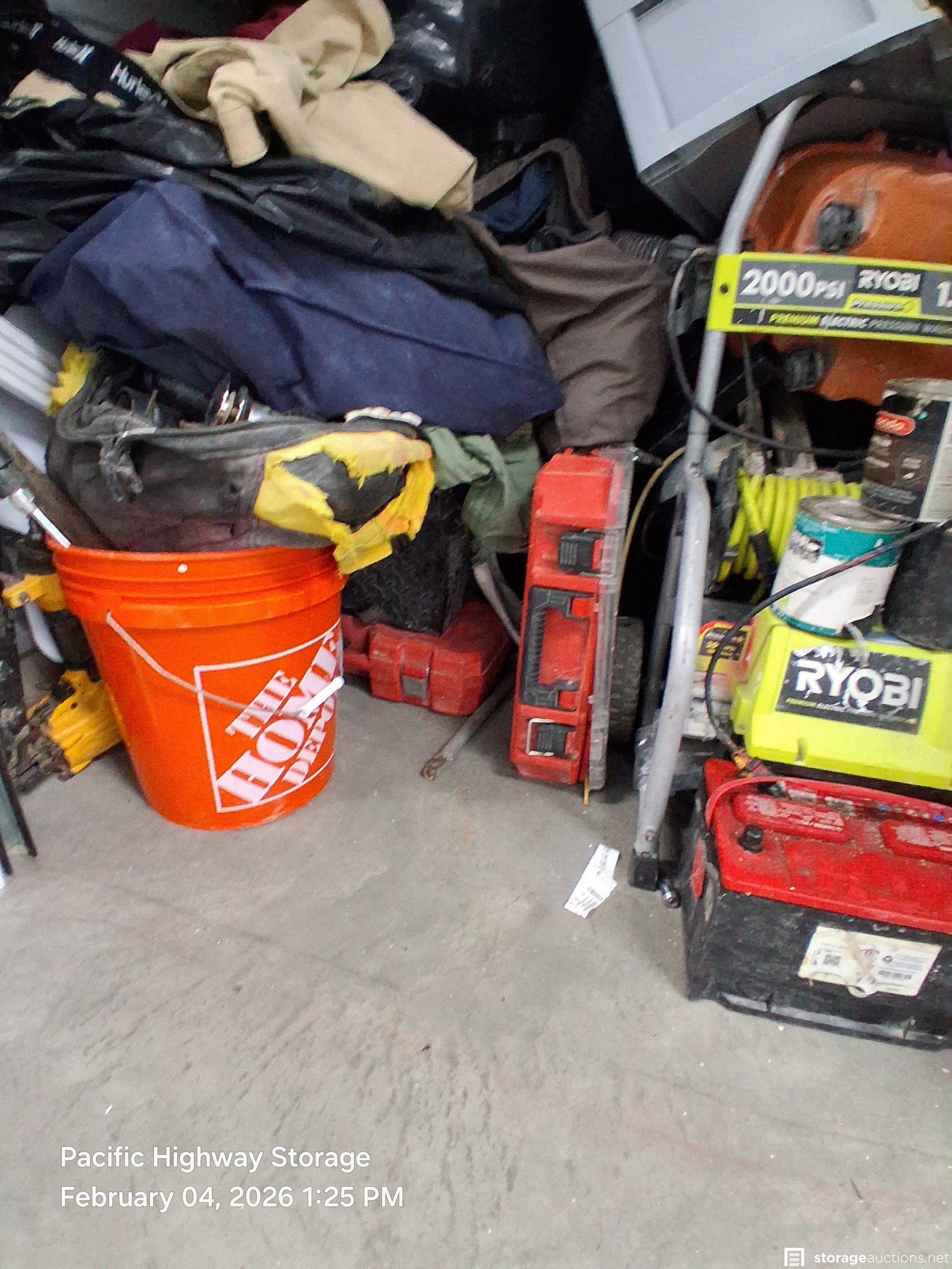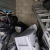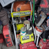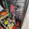 Ladder, wet/dry vacuum, pressure washer, nail gun, misc tools, gas canister, clothes, plastic drawers, speaker parts