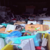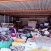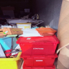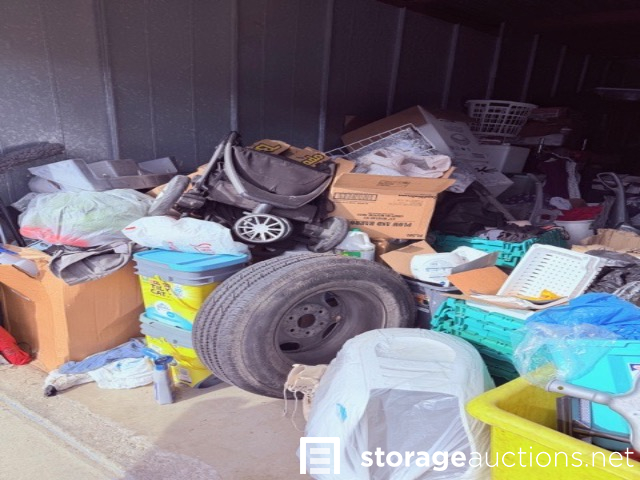 Stroller, car tire, fan, carpet, shoes, hamper, cabinet, bike, plastic container, 2 cabinets, vhs tapes, scooter,
