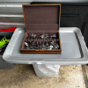 silverware, propane tank, books and games