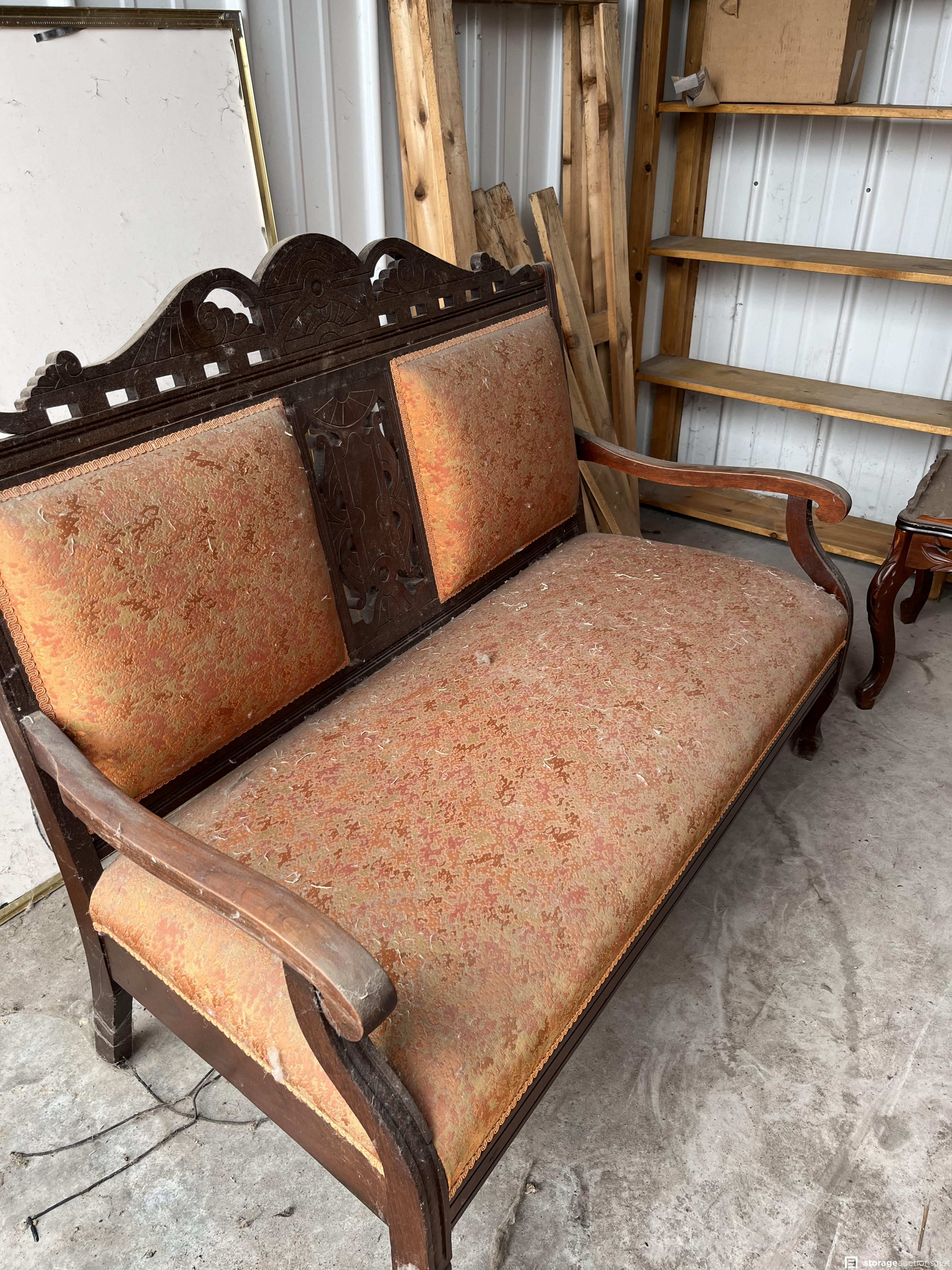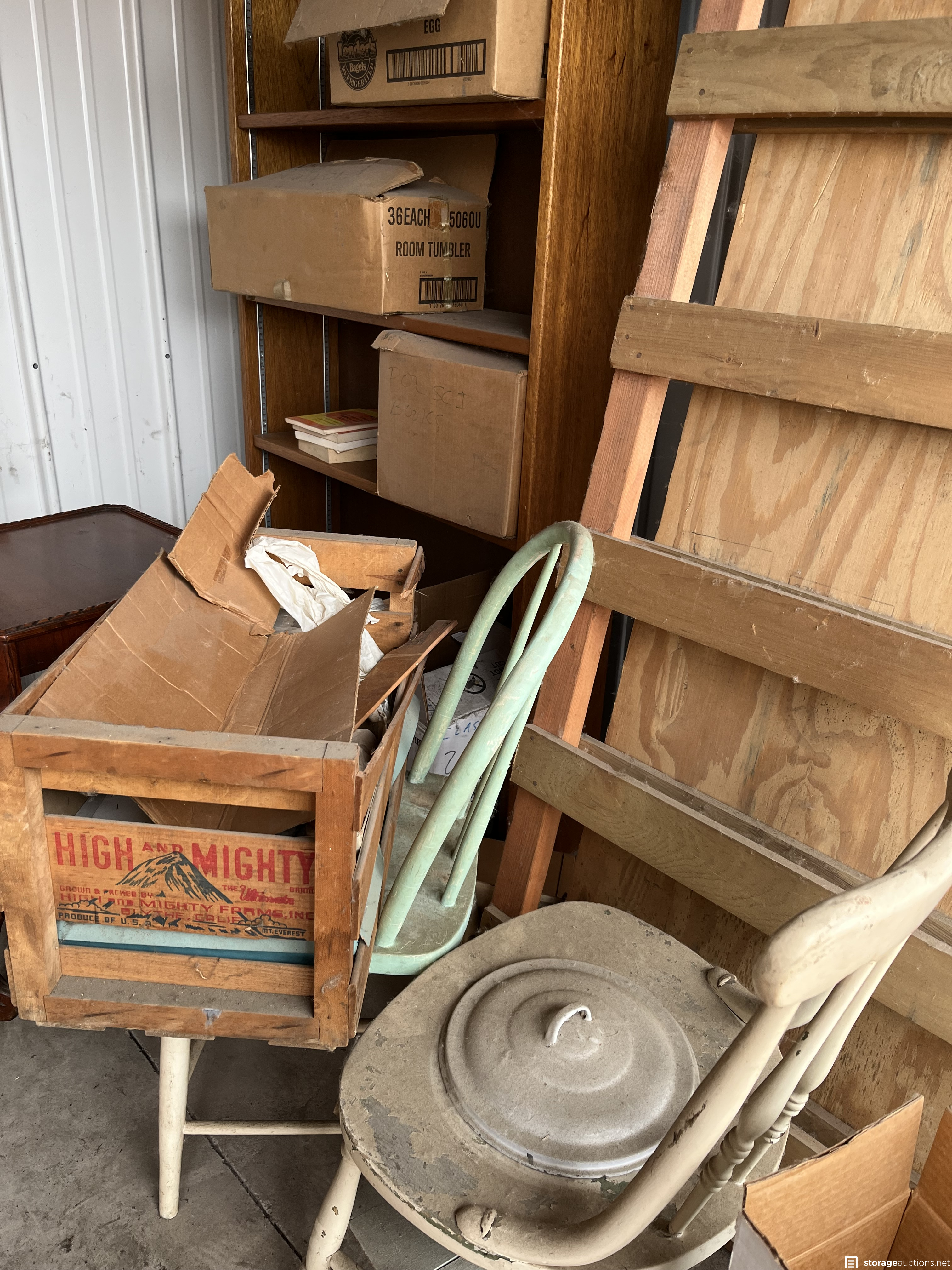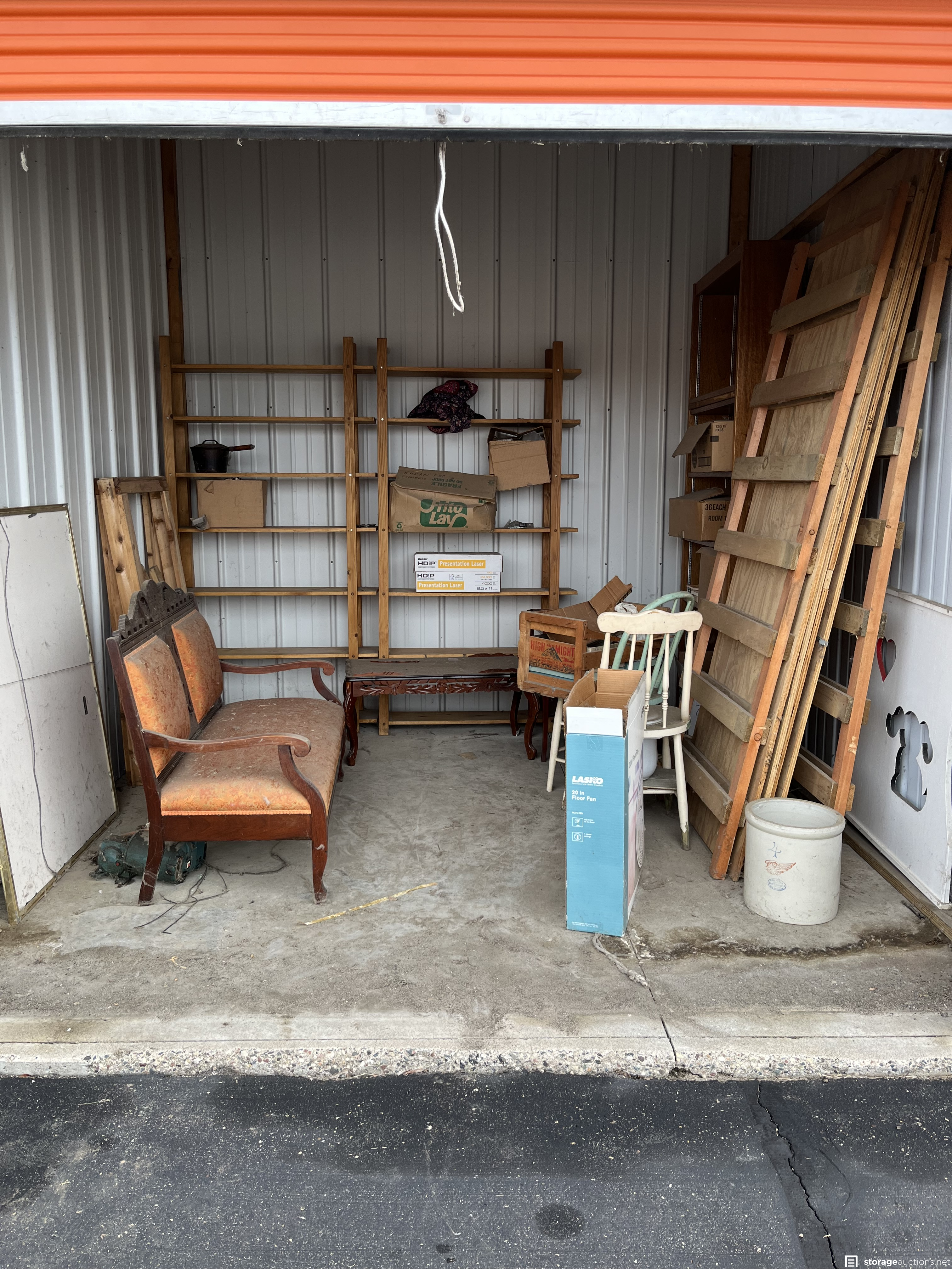 This unit appears to contain Antique couch, wood shelves, fan, coffee table and matching side table, 45 records, old books, 2 old chairs, #4 Redwing pottery, white board, cast iron pot, dishes