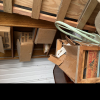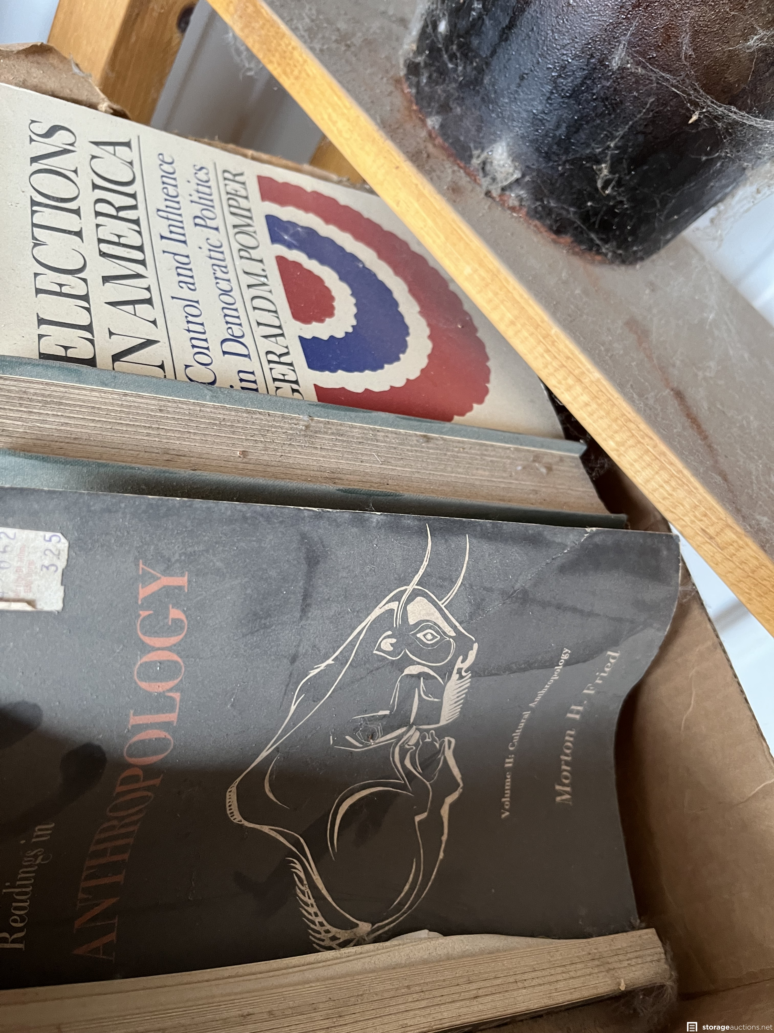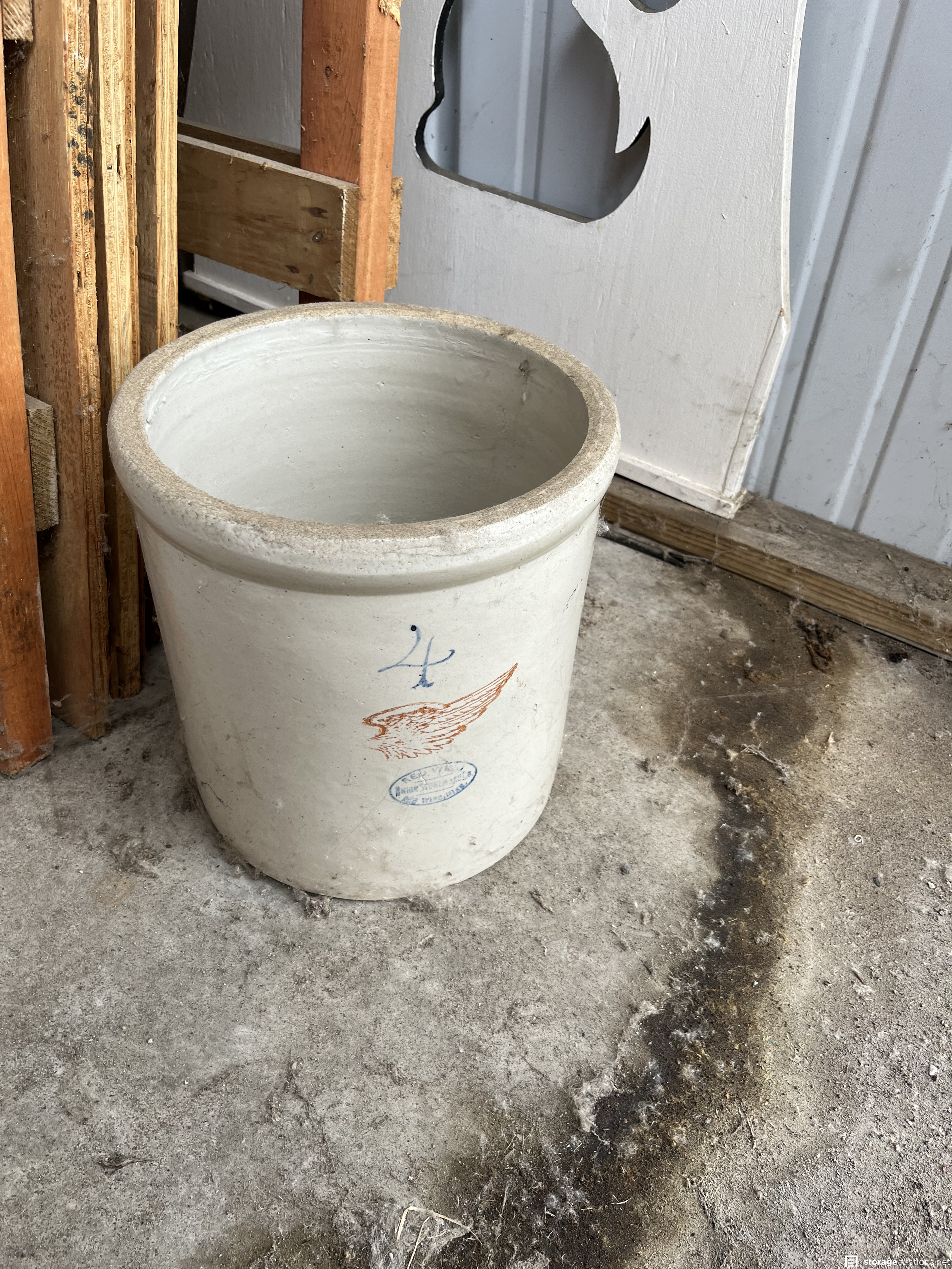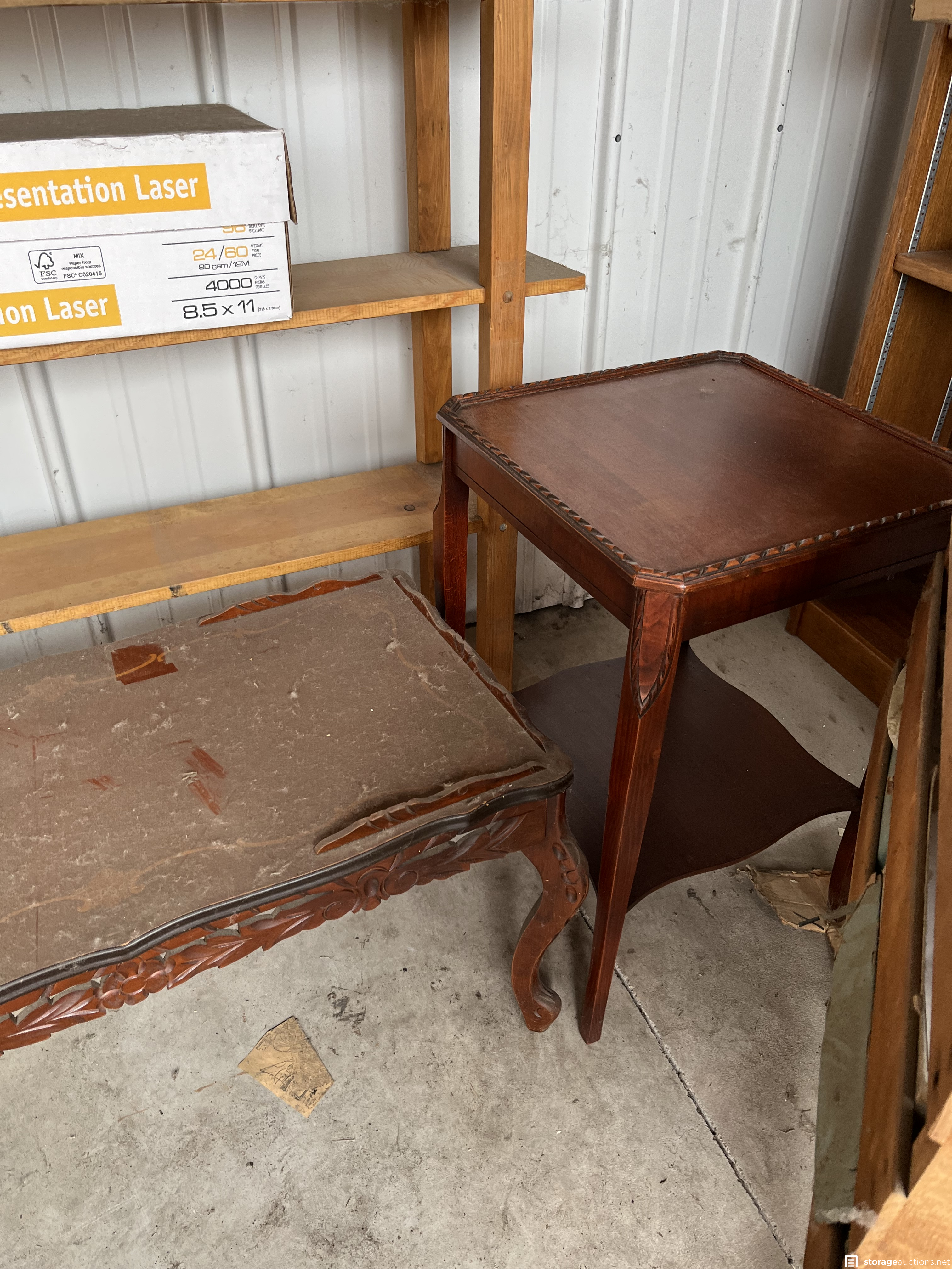 This unit appears to contain Antique couch, wood shelves, fan, coffee table and matching side table, 45 records, old books, 2 old chairs, #4 Redwing pottery, white board, cast iron pot, dishes
