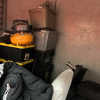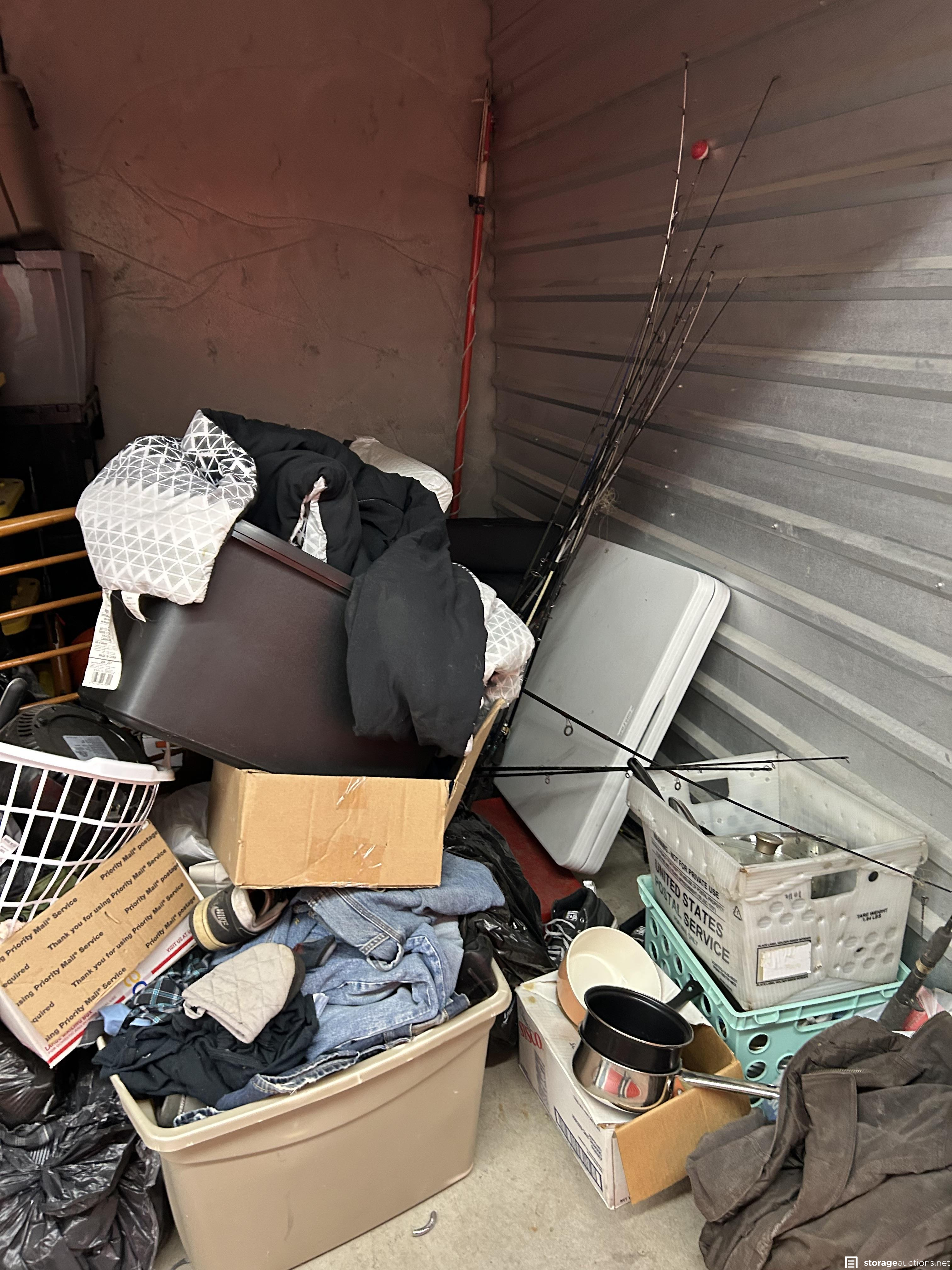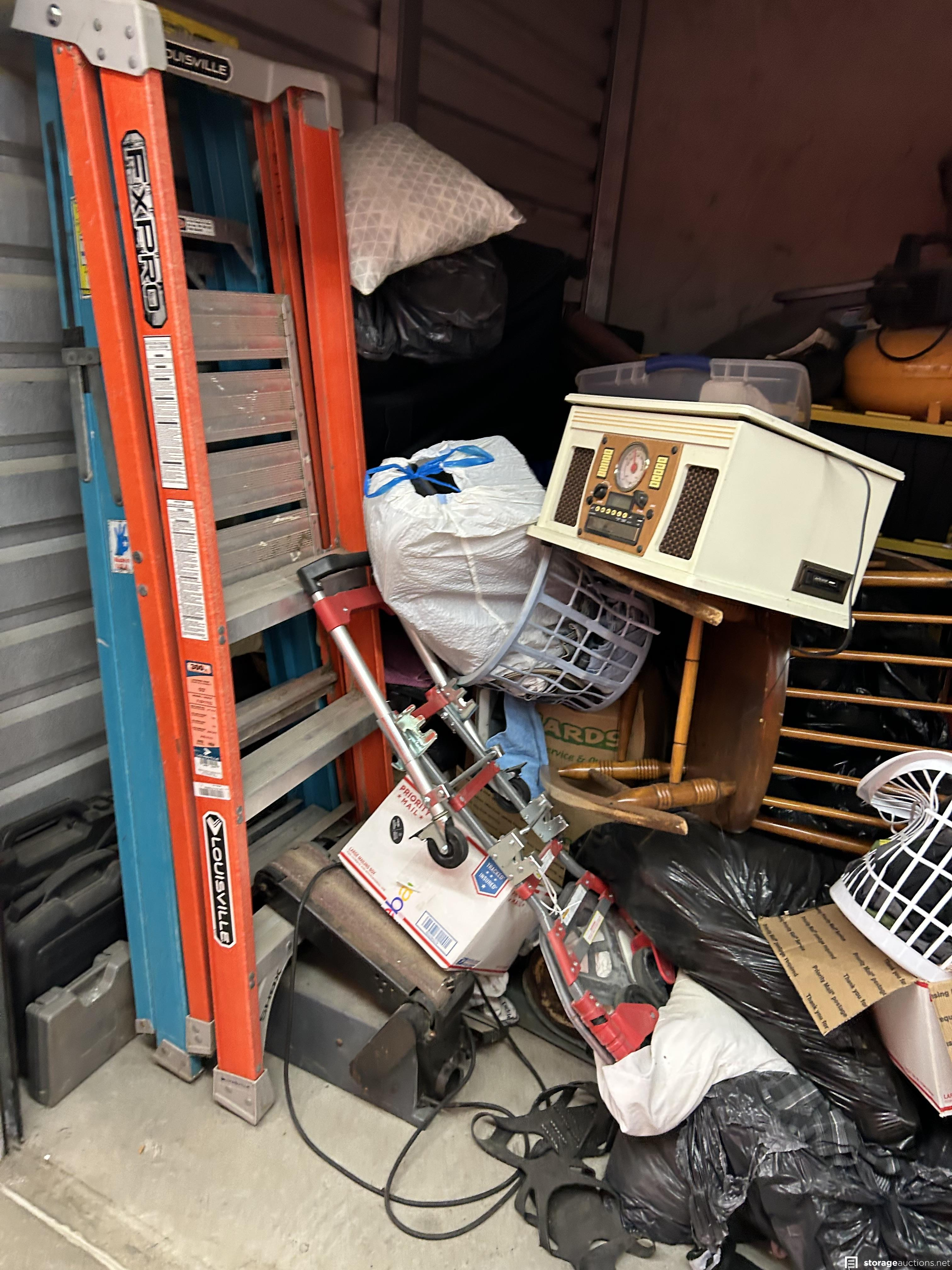 This unit has ladders, chair, bags, totes, clothes, pots, fishing rods, table