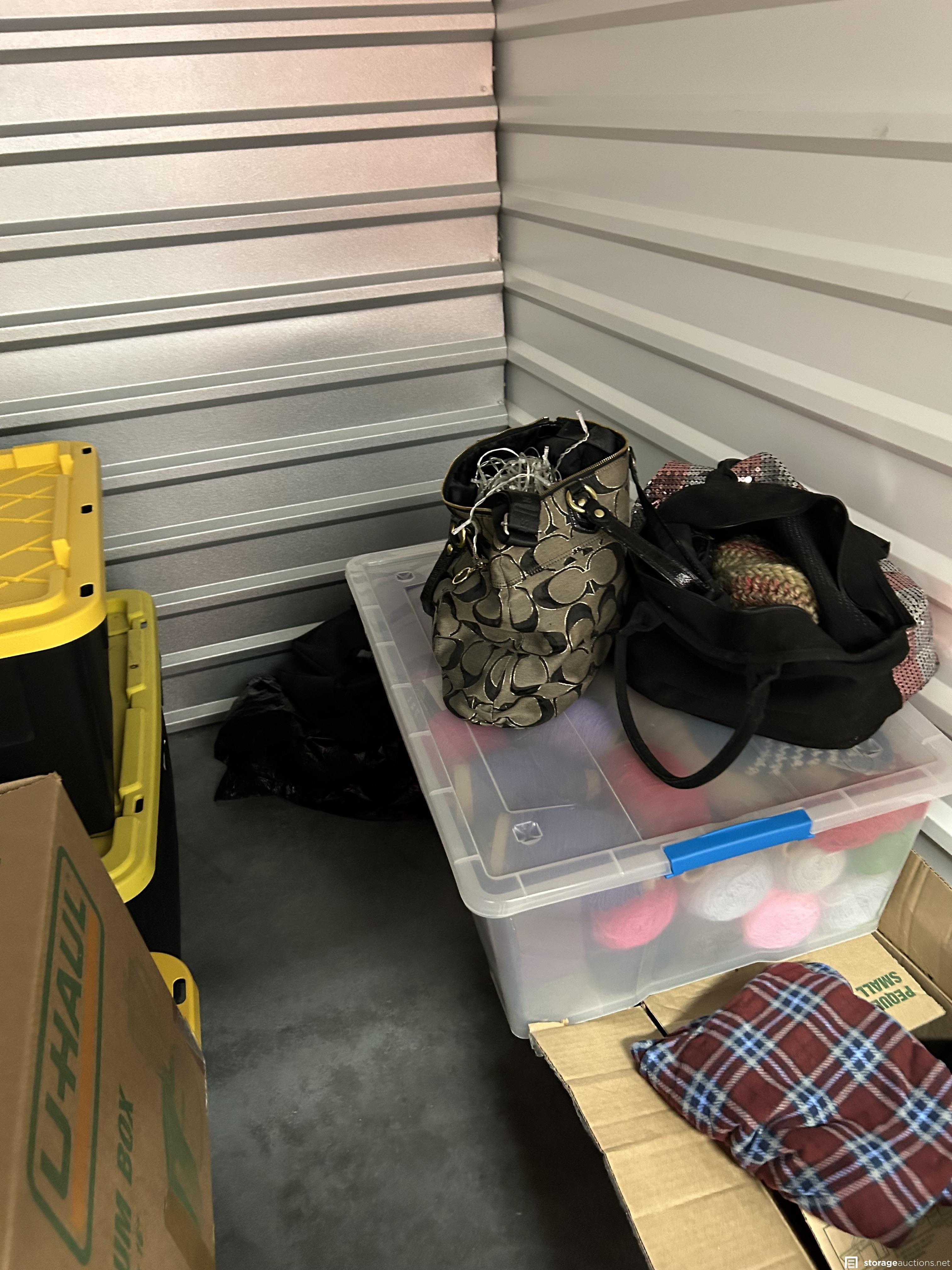 This unit has boxes, totes, coach bag, clothes
