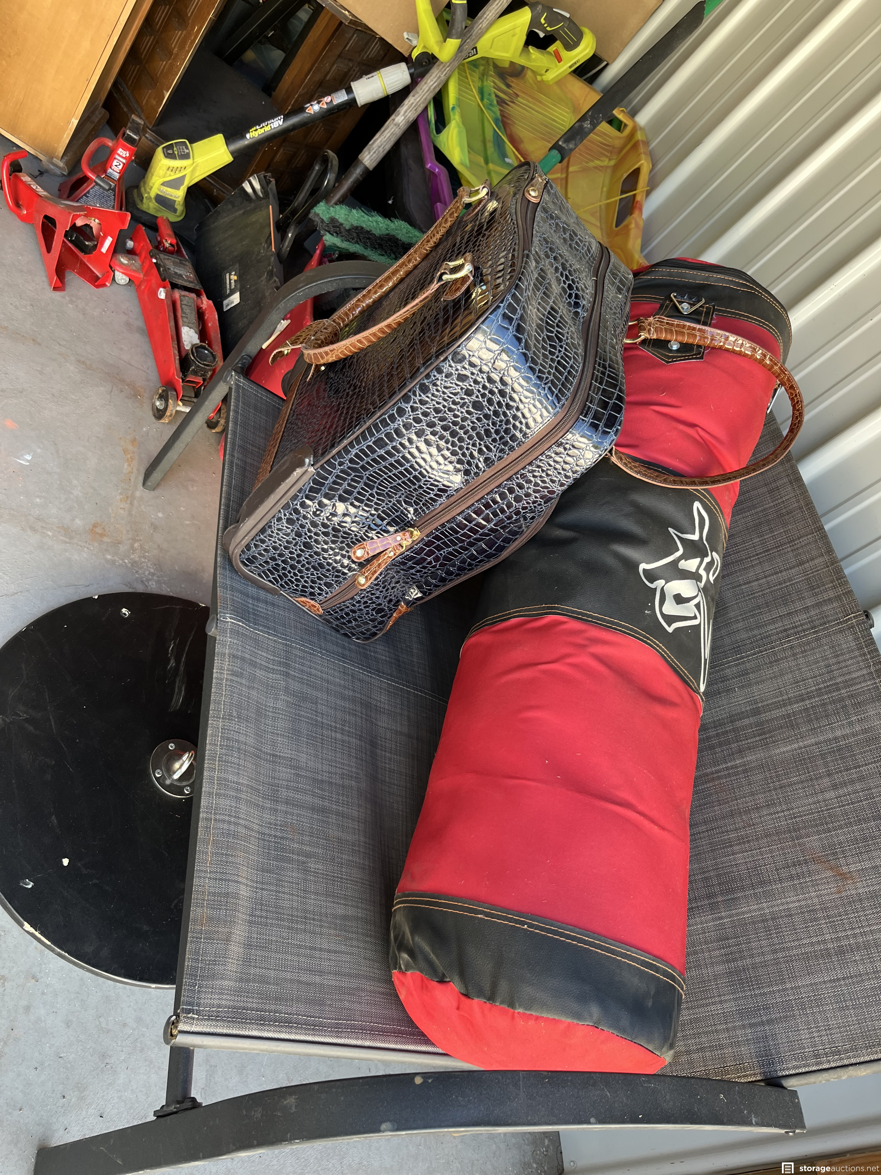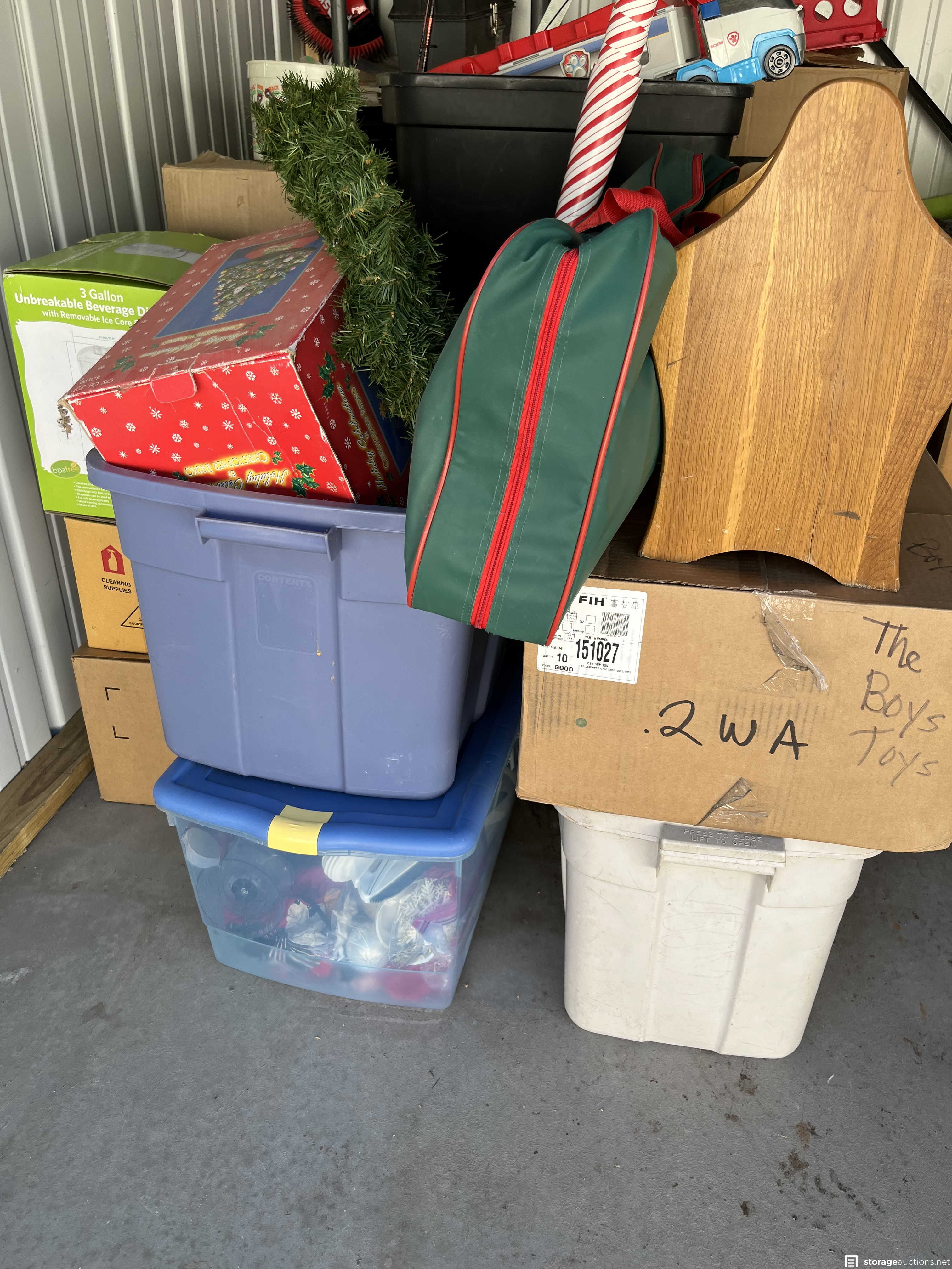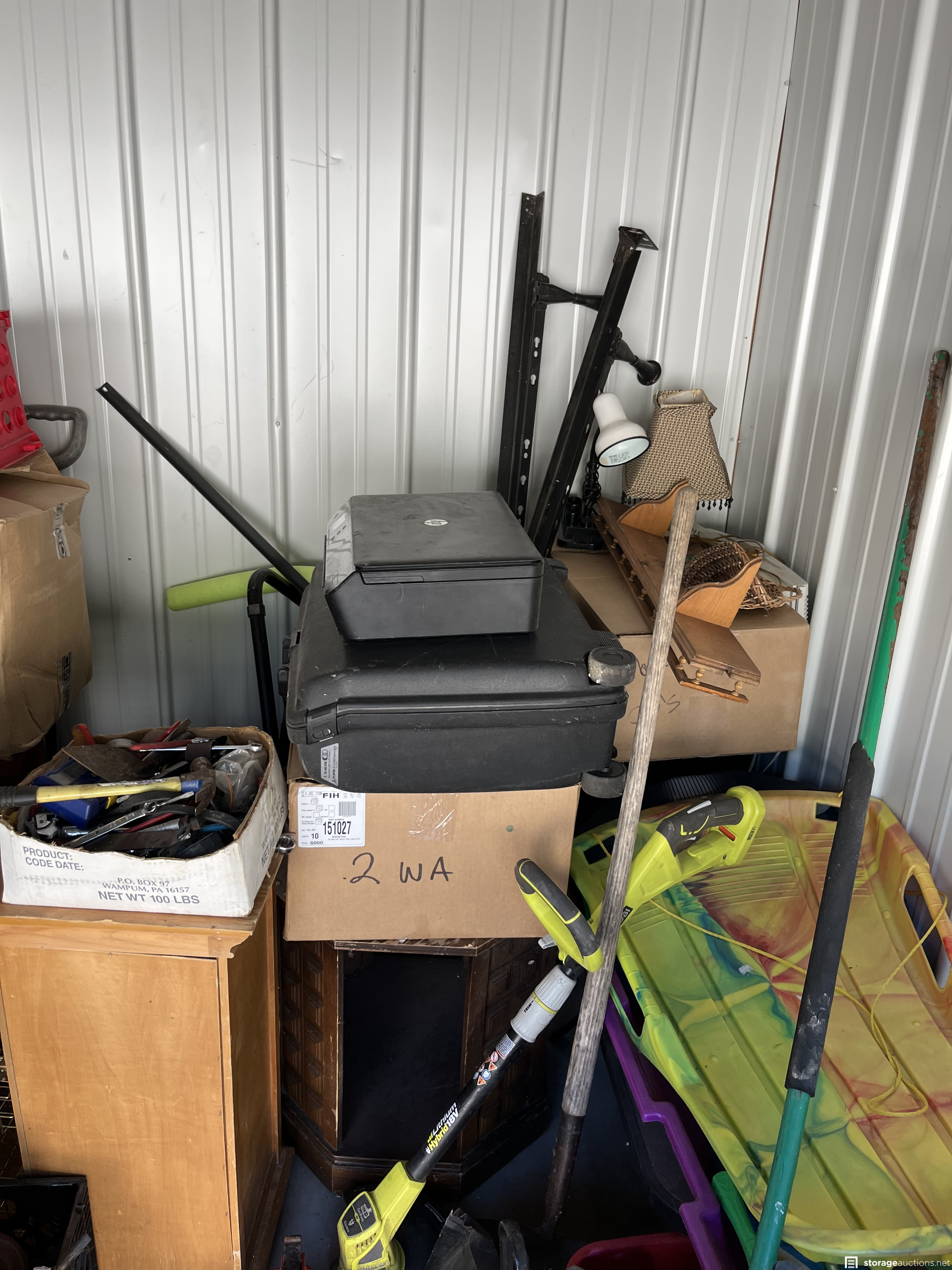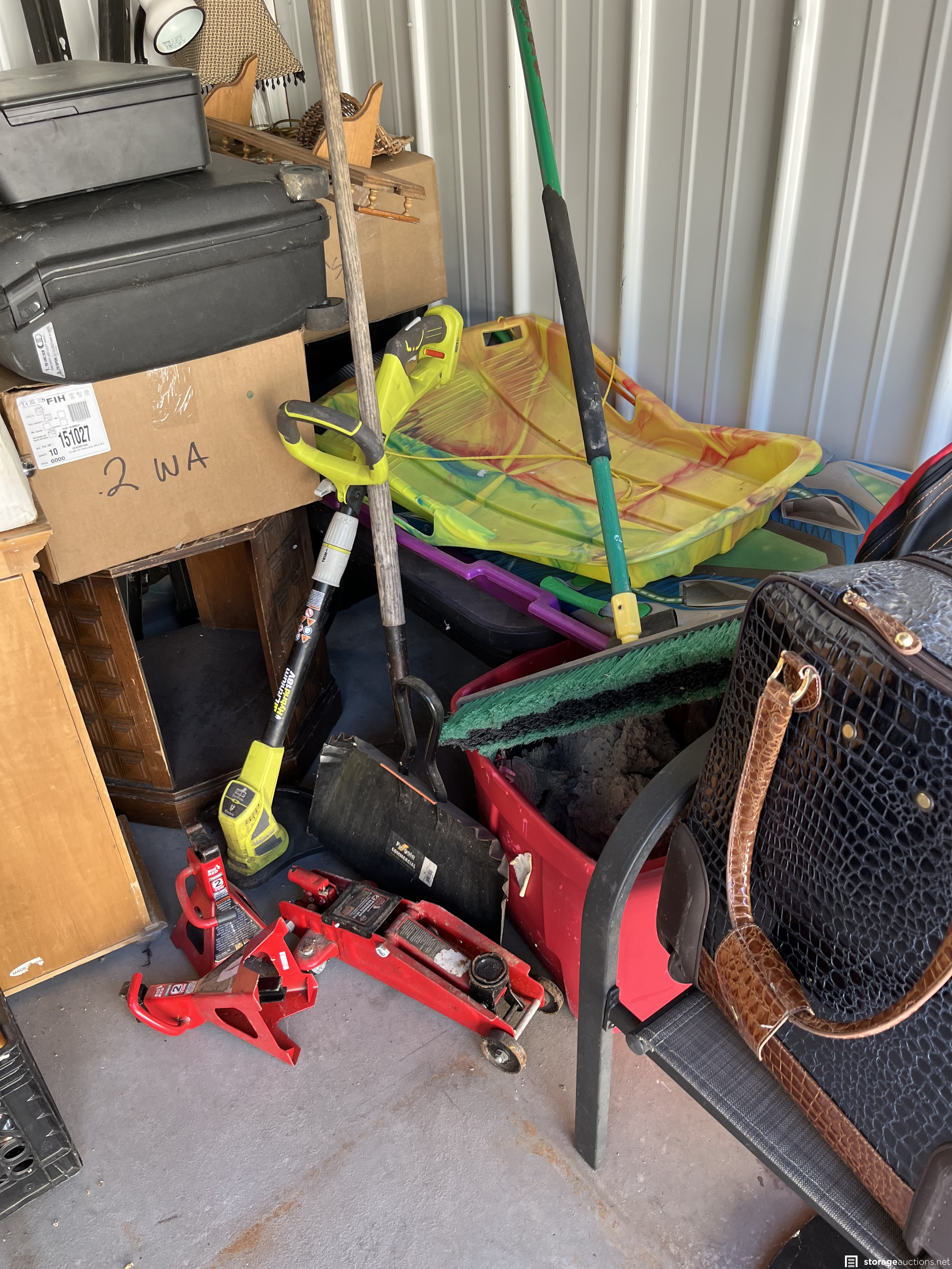 This unit appears to contain Car jack and jack stands, corded drill, outdoor bench and coffee table, side table, Christmas decor, battery powered trimmer, bike helmets, hand tools, drill bits, HP Printer, kids toys, CD’s and movies, cabinet, punching bag, luggage, new candles, and more