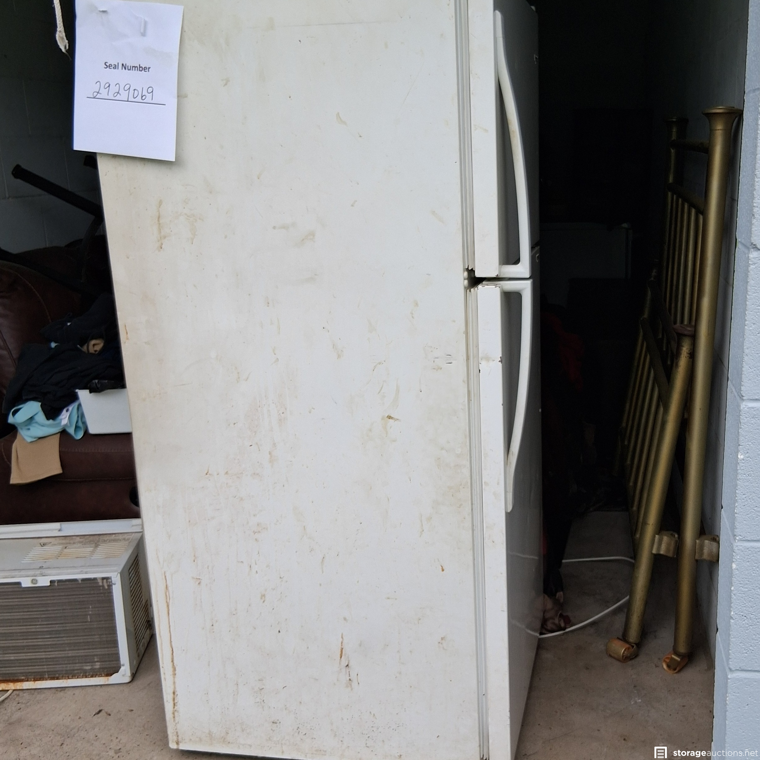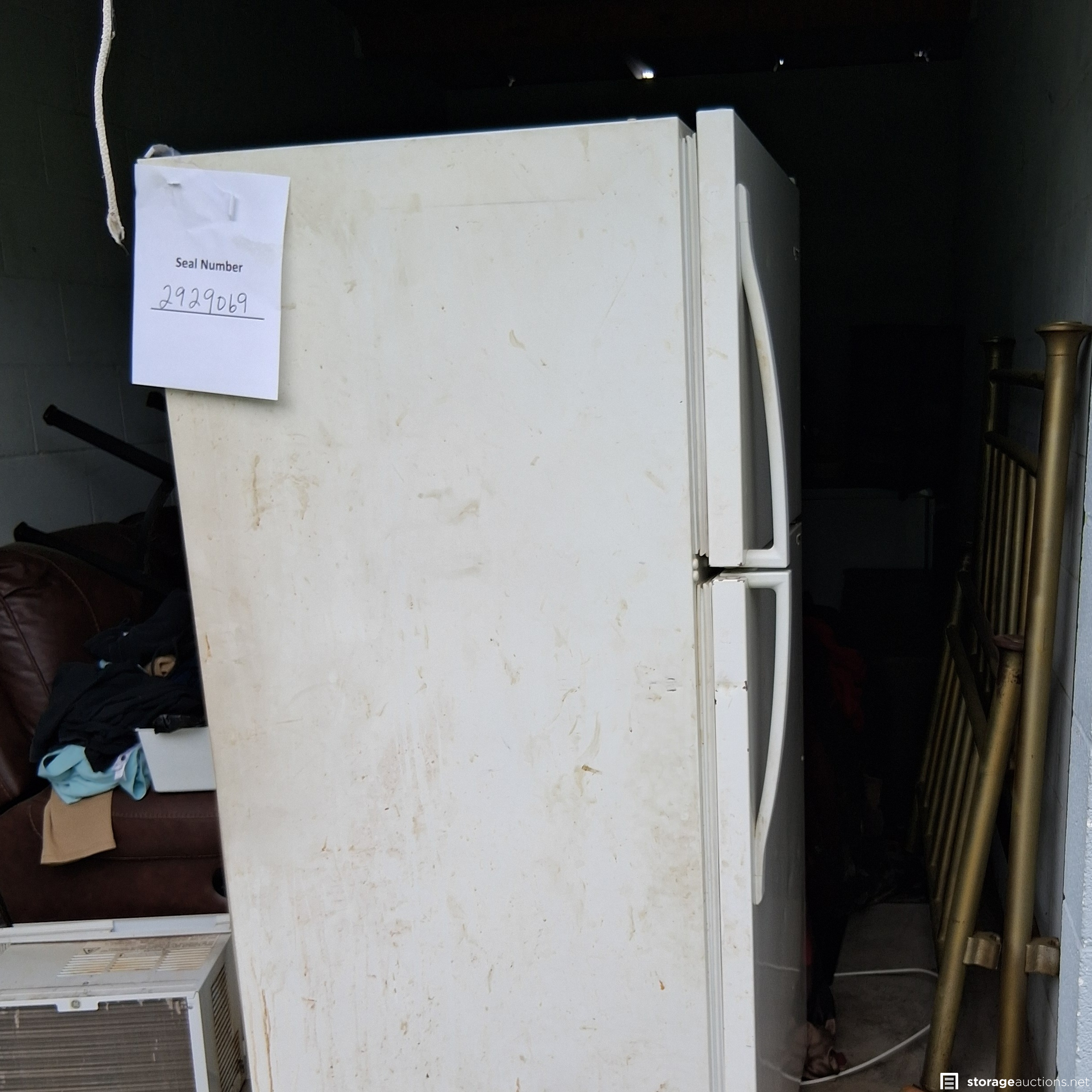 Bed, refrigerator, ac unit, couch, love seat, chair, dryer, clothes