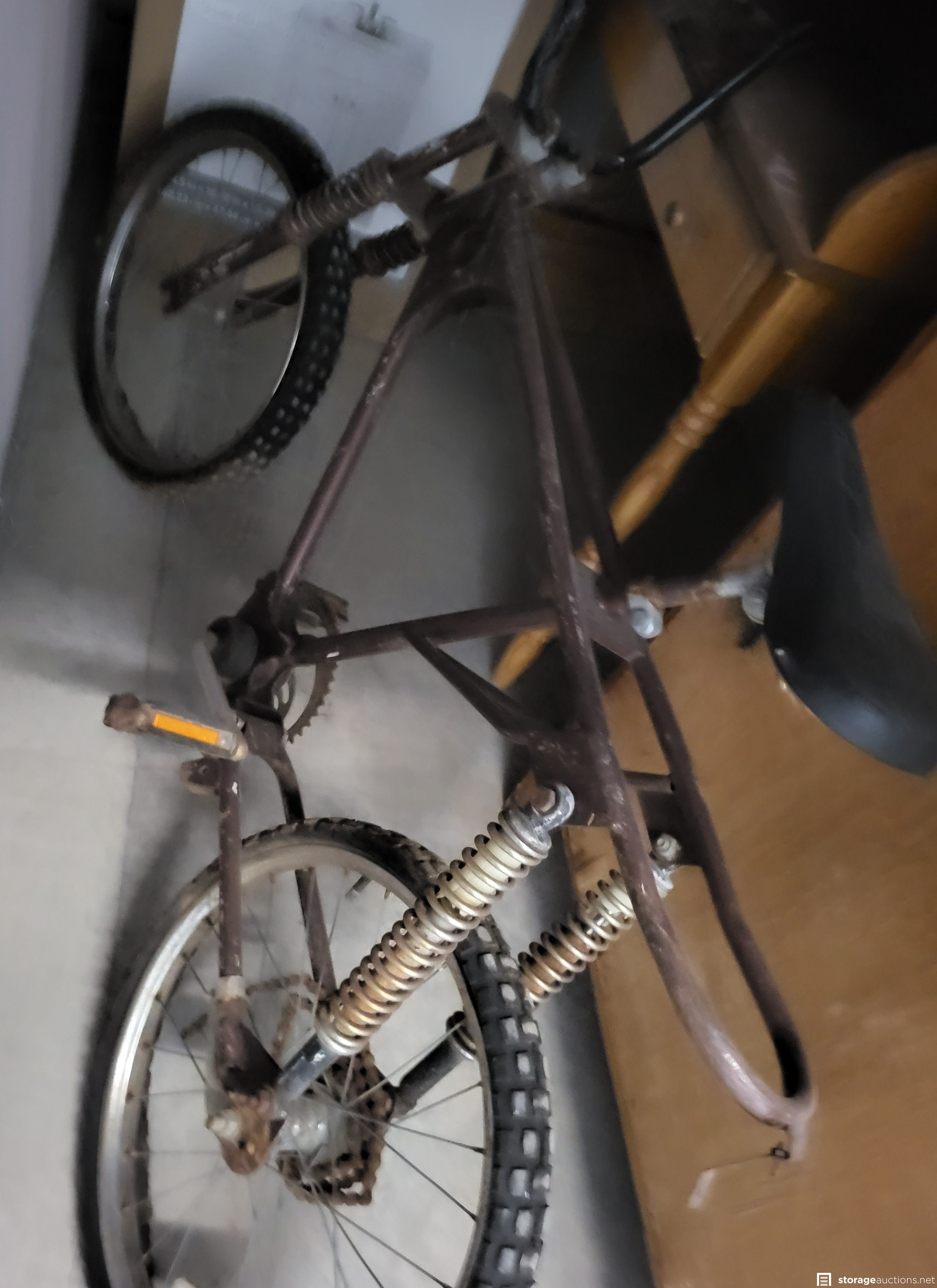 2 bicycles, large dresser, coffee table, pink Barbie toy car, 24 inch vanity still in it's box, small rolltop desk, 1 older luggage, totes, full size mattress.