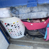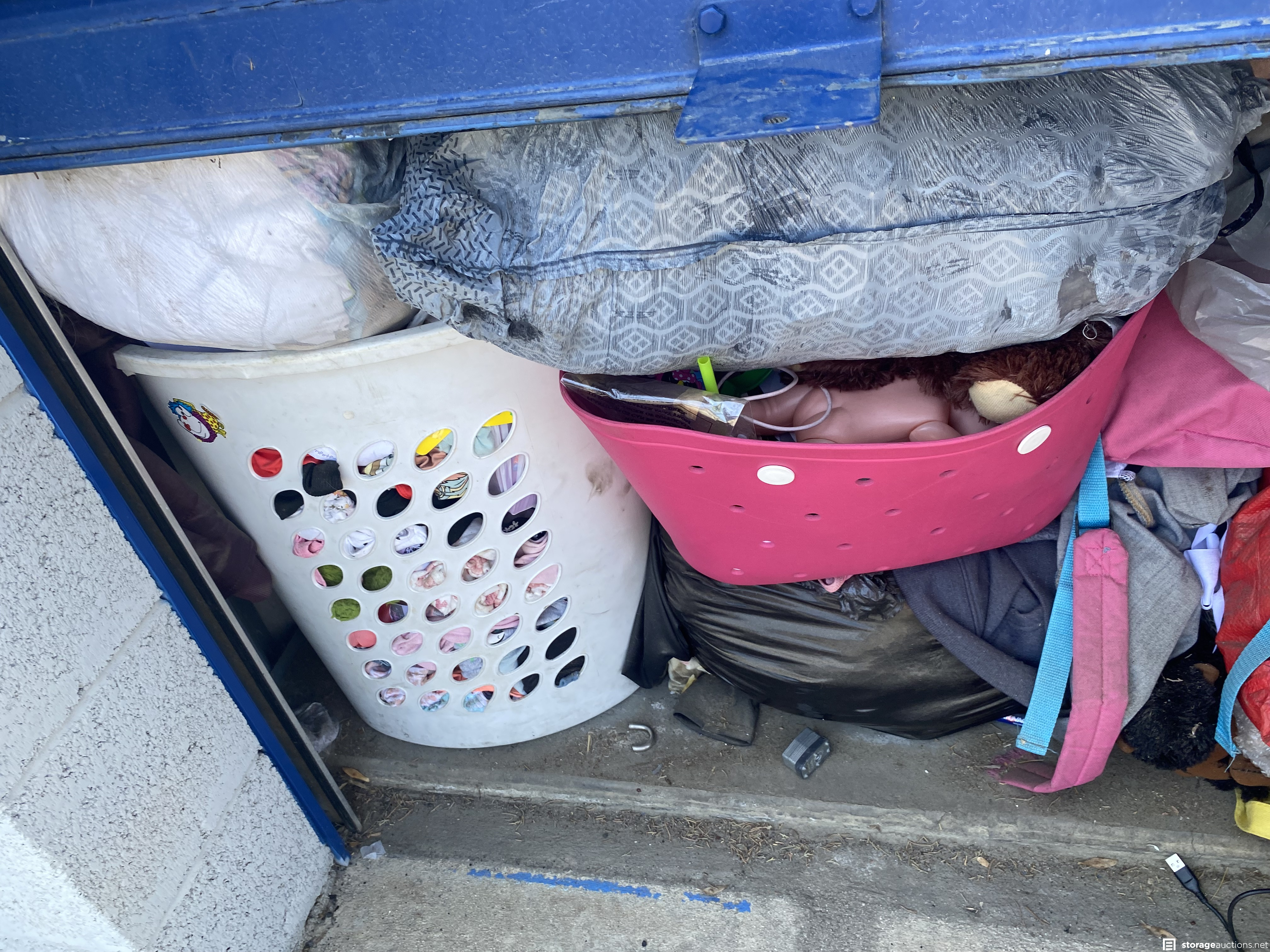 Bags, kids toys, hamper, clothing, miscellaneous unable to roll door past halfway