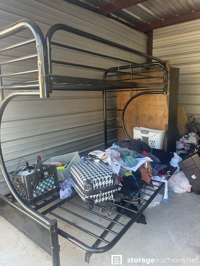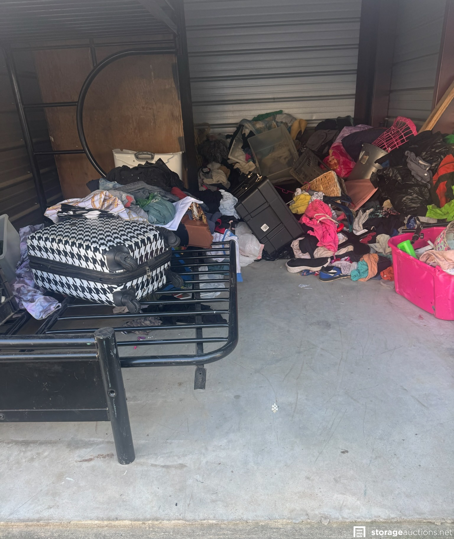 Black metal bed frame, furniture, suitcase, clothes, etc.