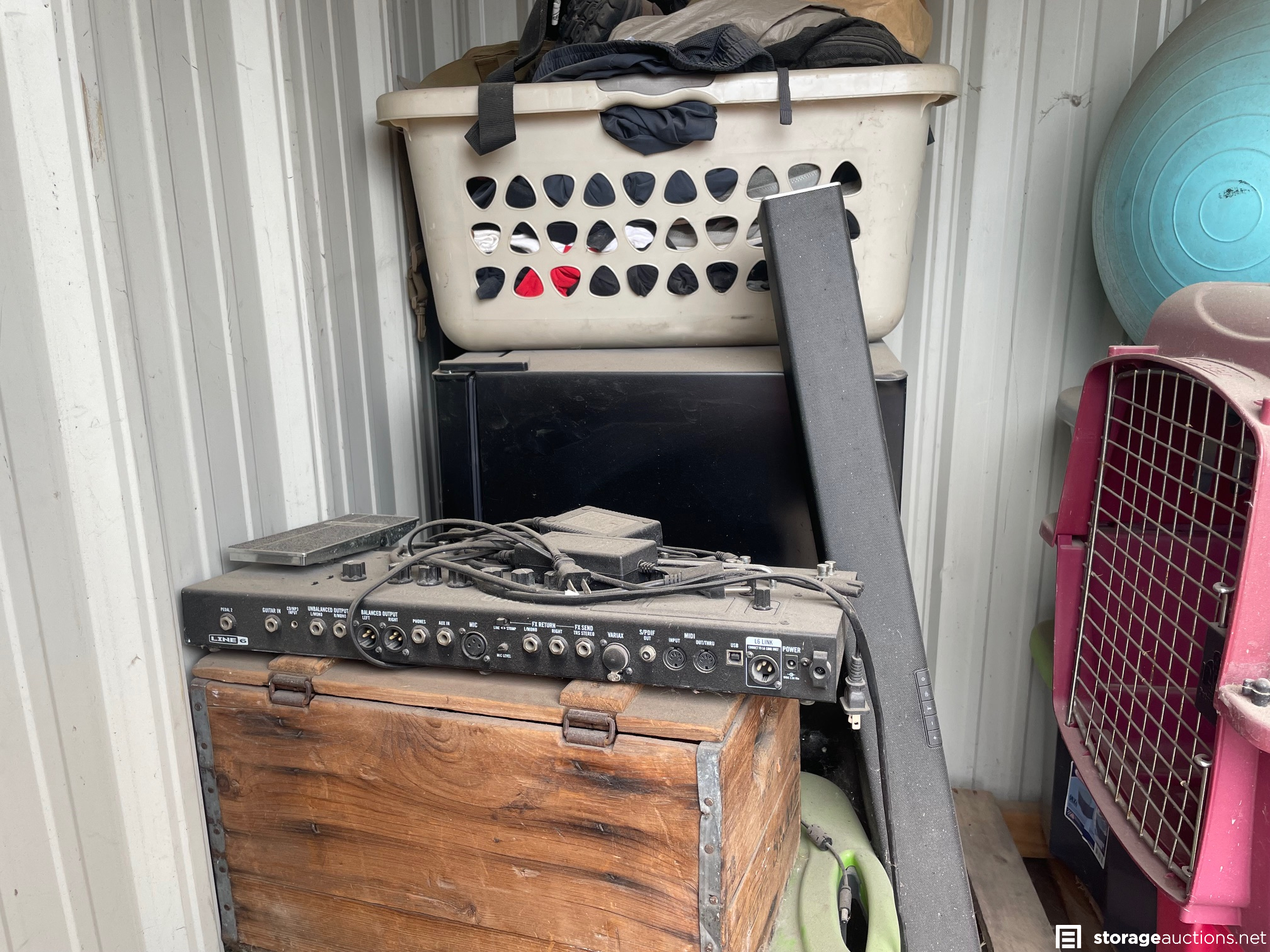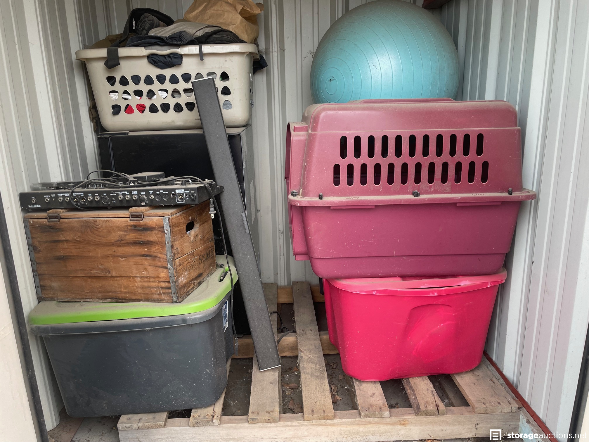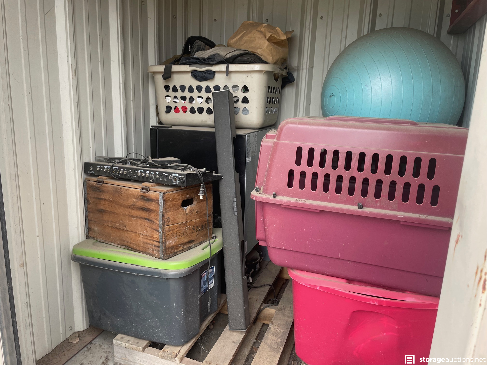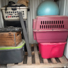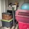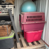 TOTES, WOODEN BOXES, MINI FRIDGE, WORK OUT BALL, SPEAKER, DOG KENNEL, MISC ITEMS