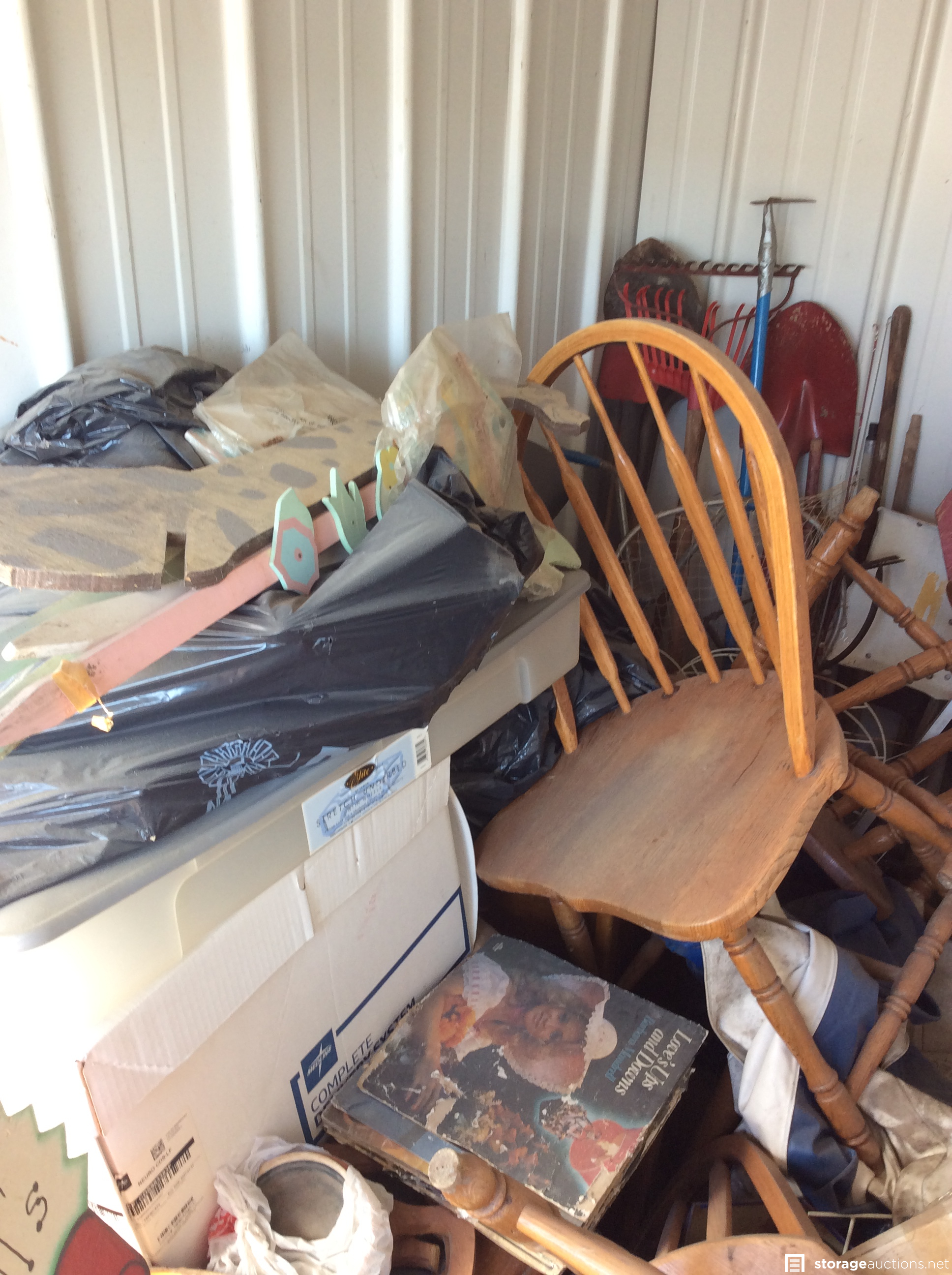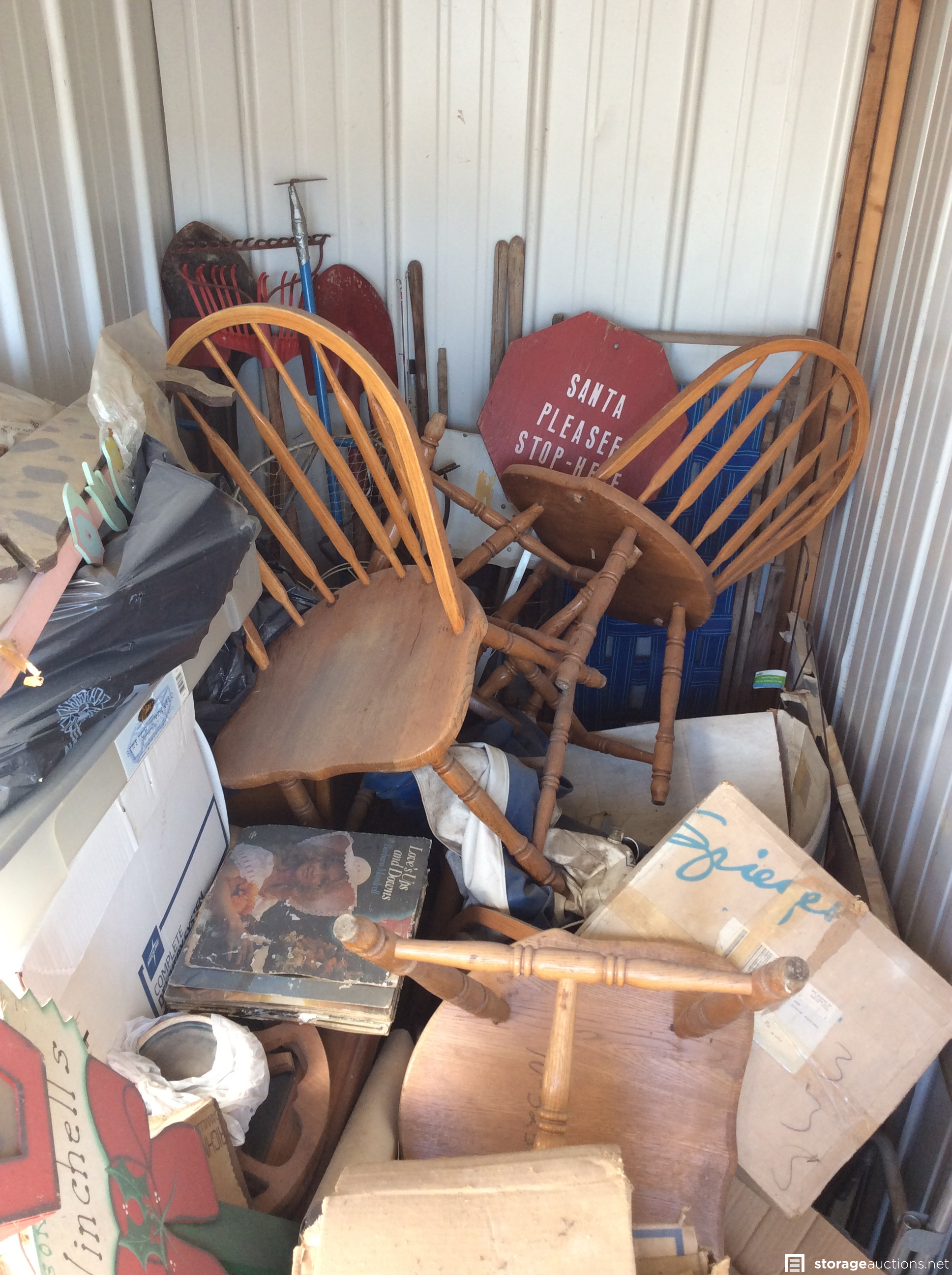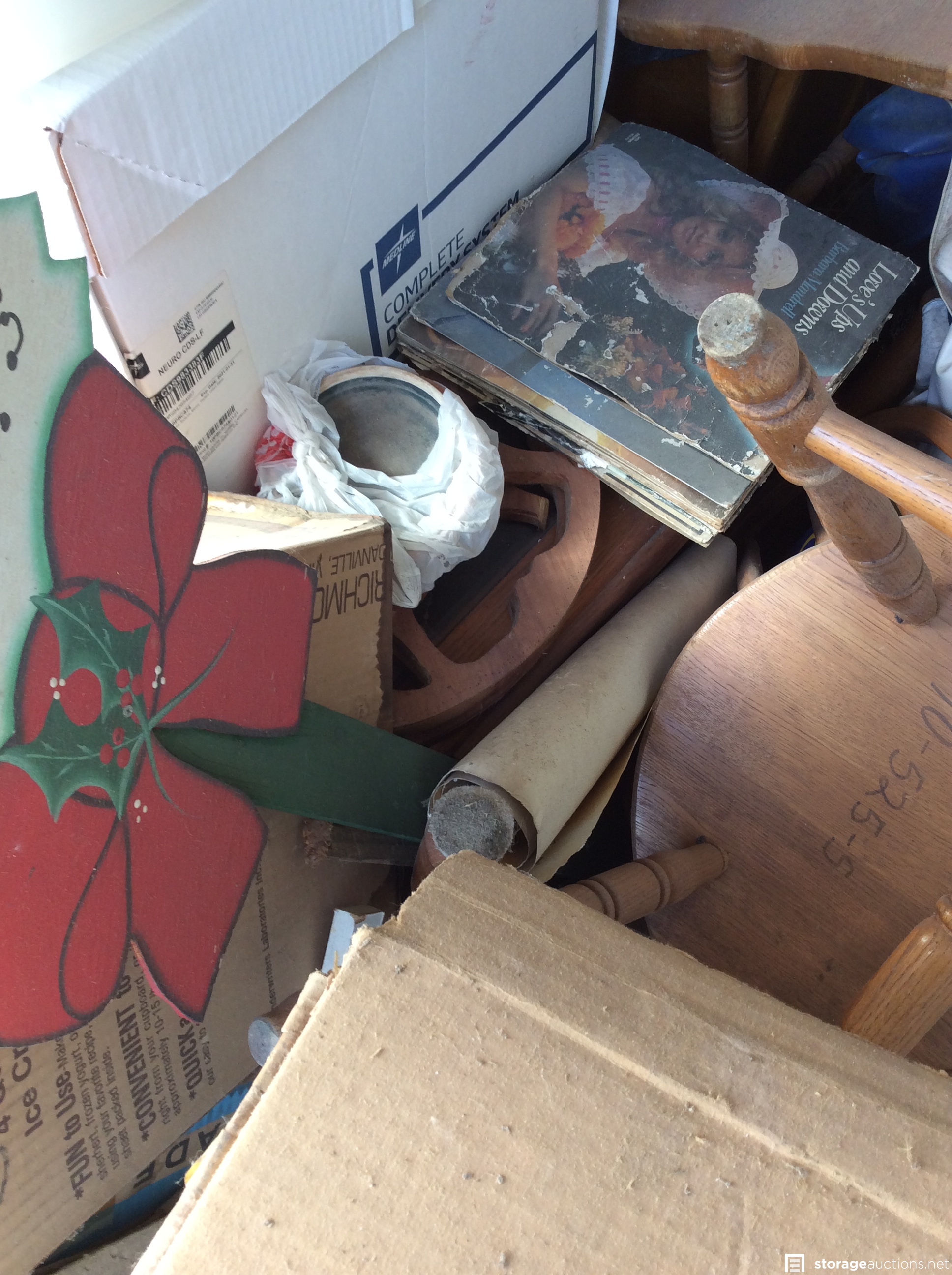 Wooden chairs, albums, totes, lawn tools, holiday decor, tote with magazines, wooden crate w/asst hardware, glass bottles