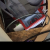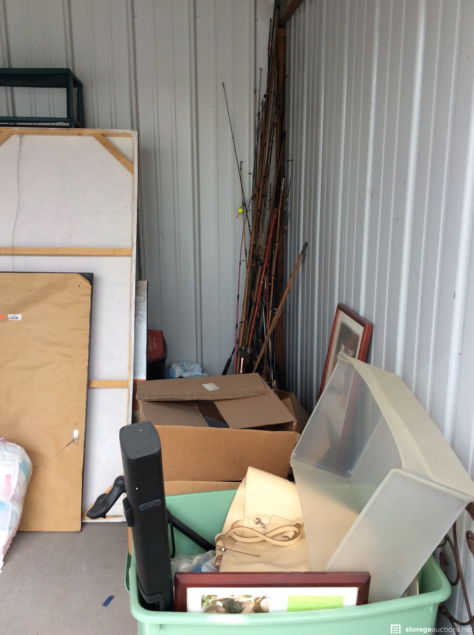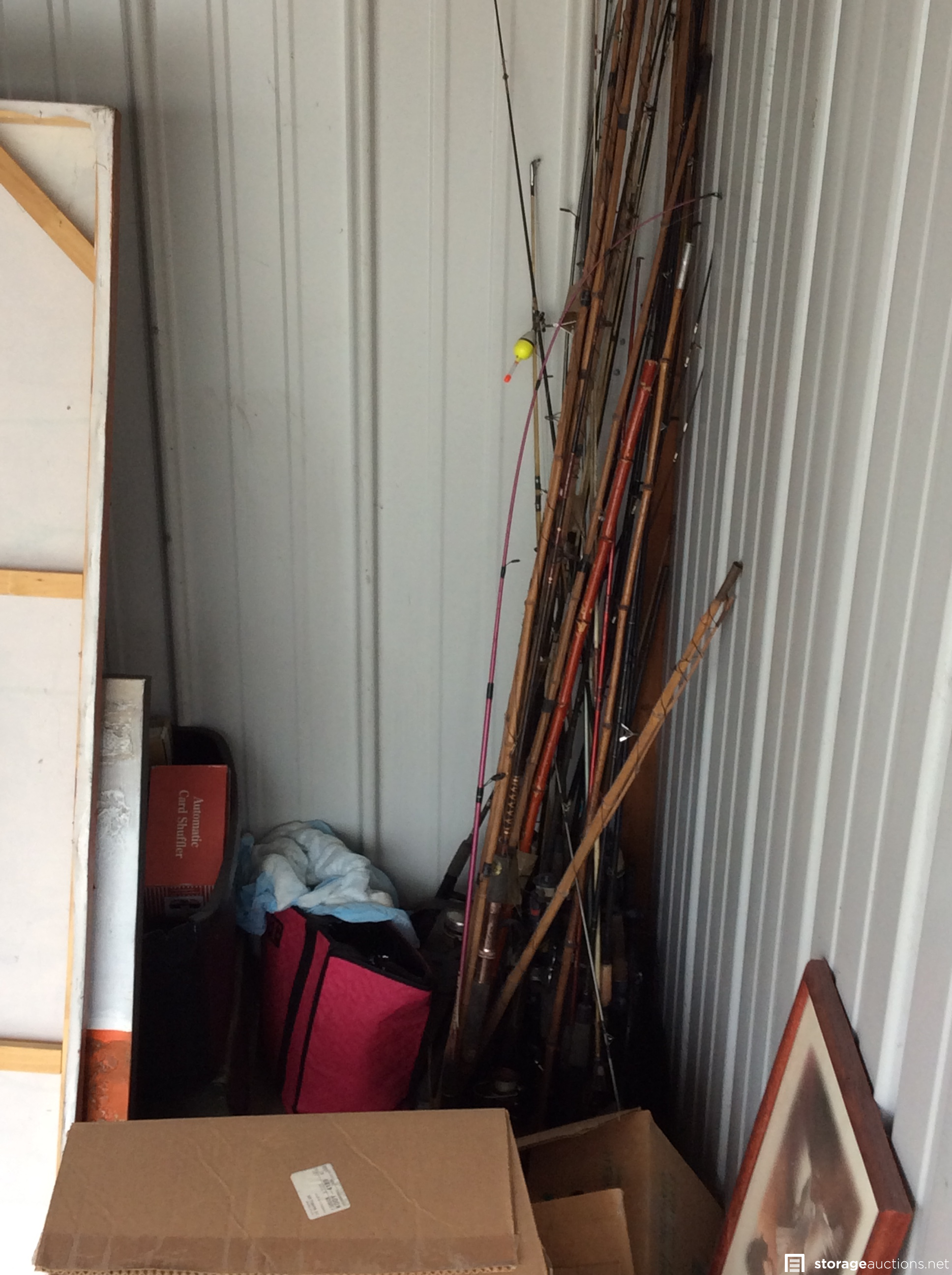 Jar of coins (pennies?), several totes, several pieces of large artwork, small tools, bobble head, sports items, large leather? bag, small wooden shelf, several fishing rods, large TV, metal artwork, chest of drawers