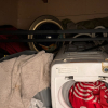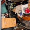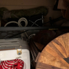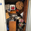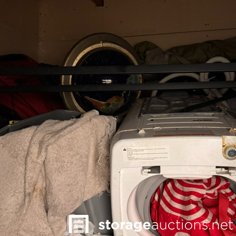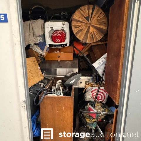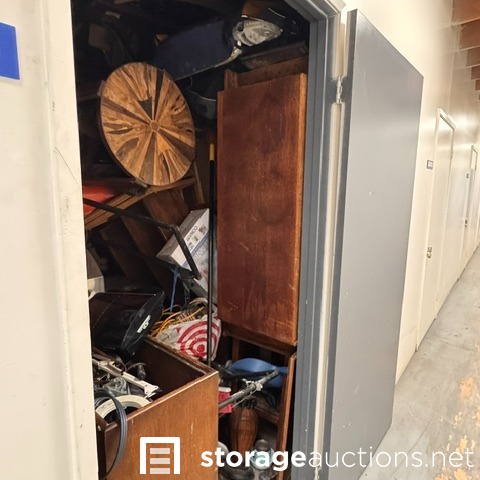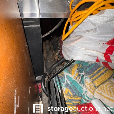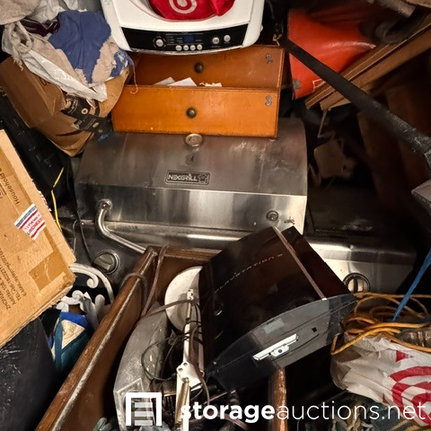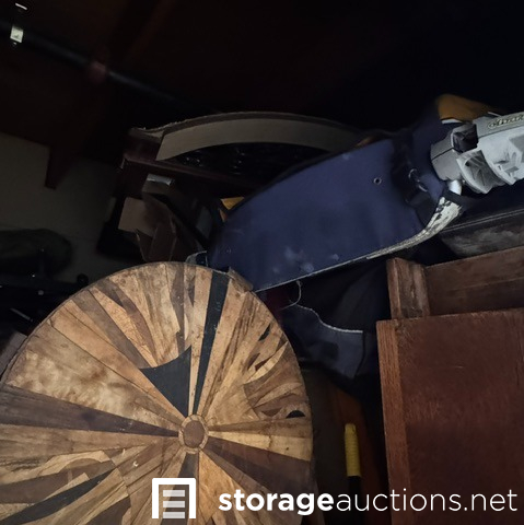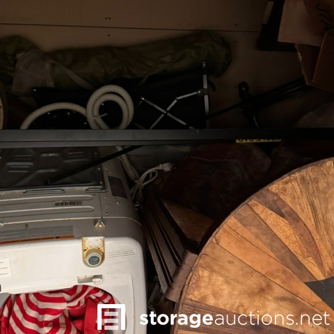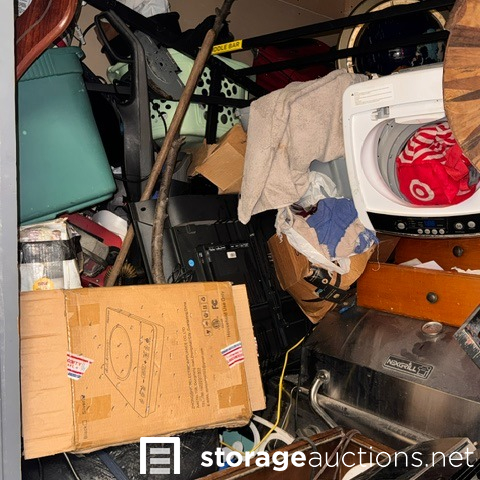 This unit appears to contain BBQ, 3 boxes, 2 dressers, lamp, suitcase, globe, TV, Playstation 3, 3 bags, coffee table, garden wagon, lawn mower, furniture, misc items.