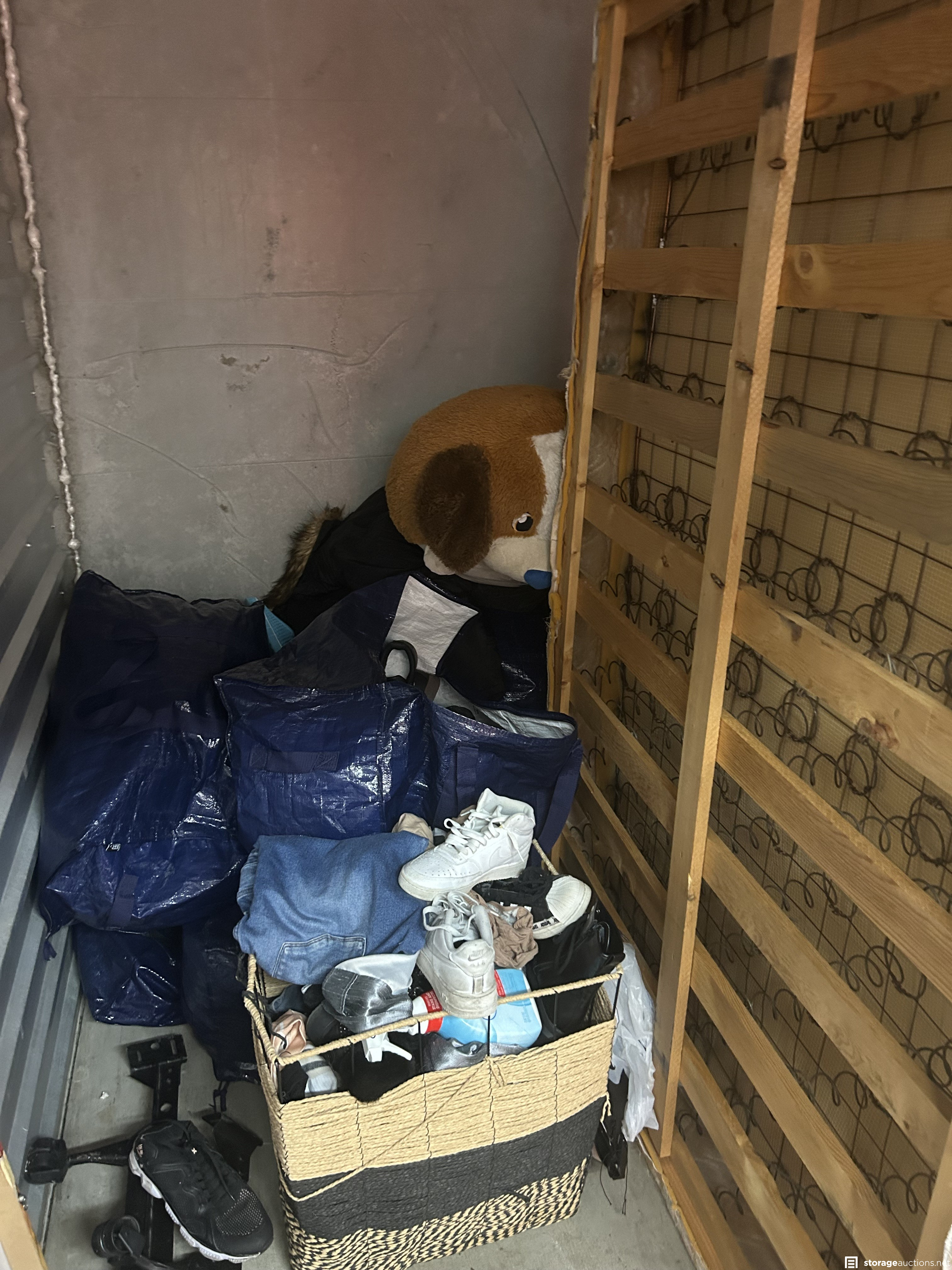 This unit has shelf, mattress, bedframe, tv, shoes, stuffed animal, bags, art, suitcase