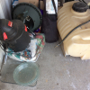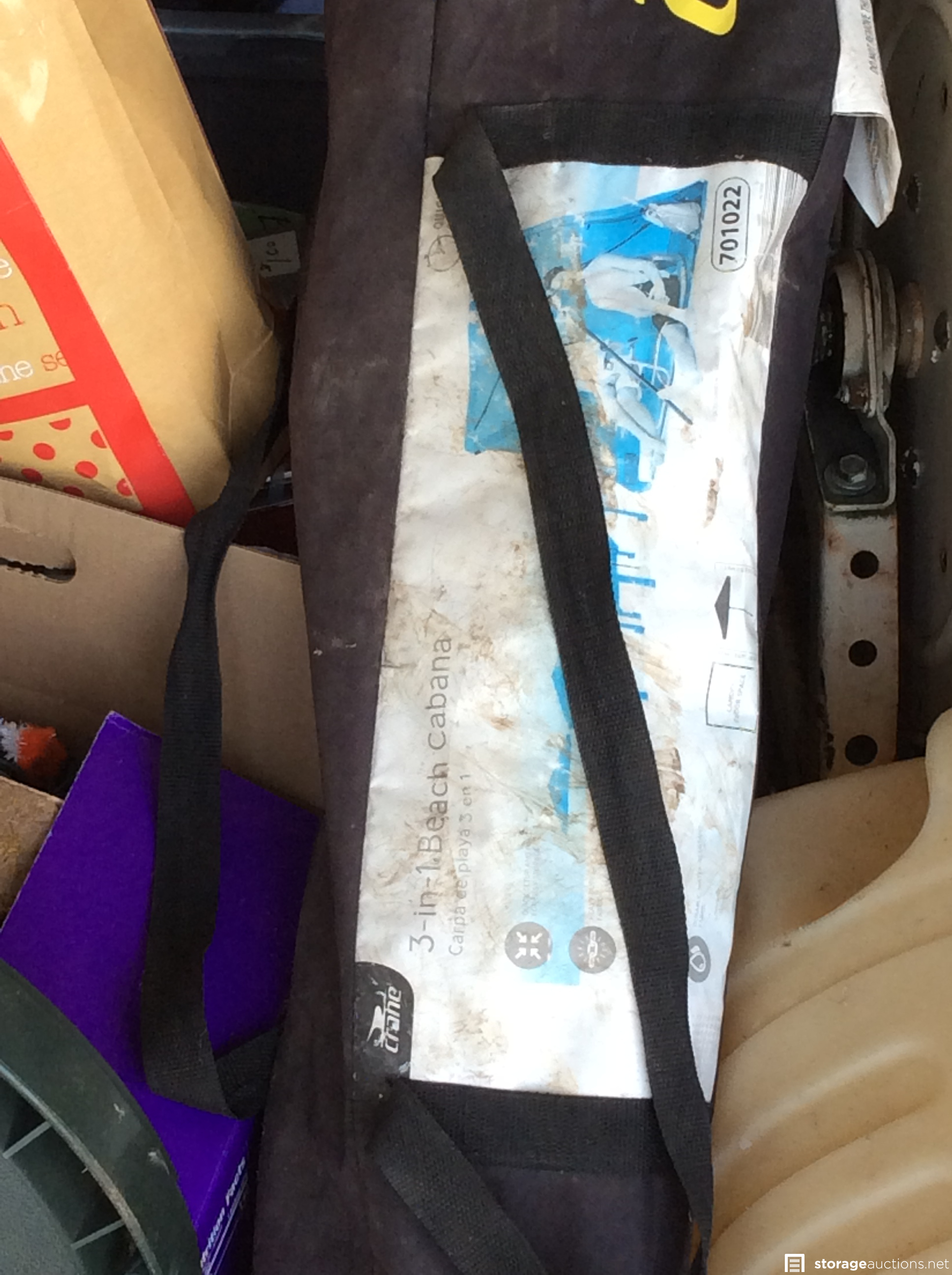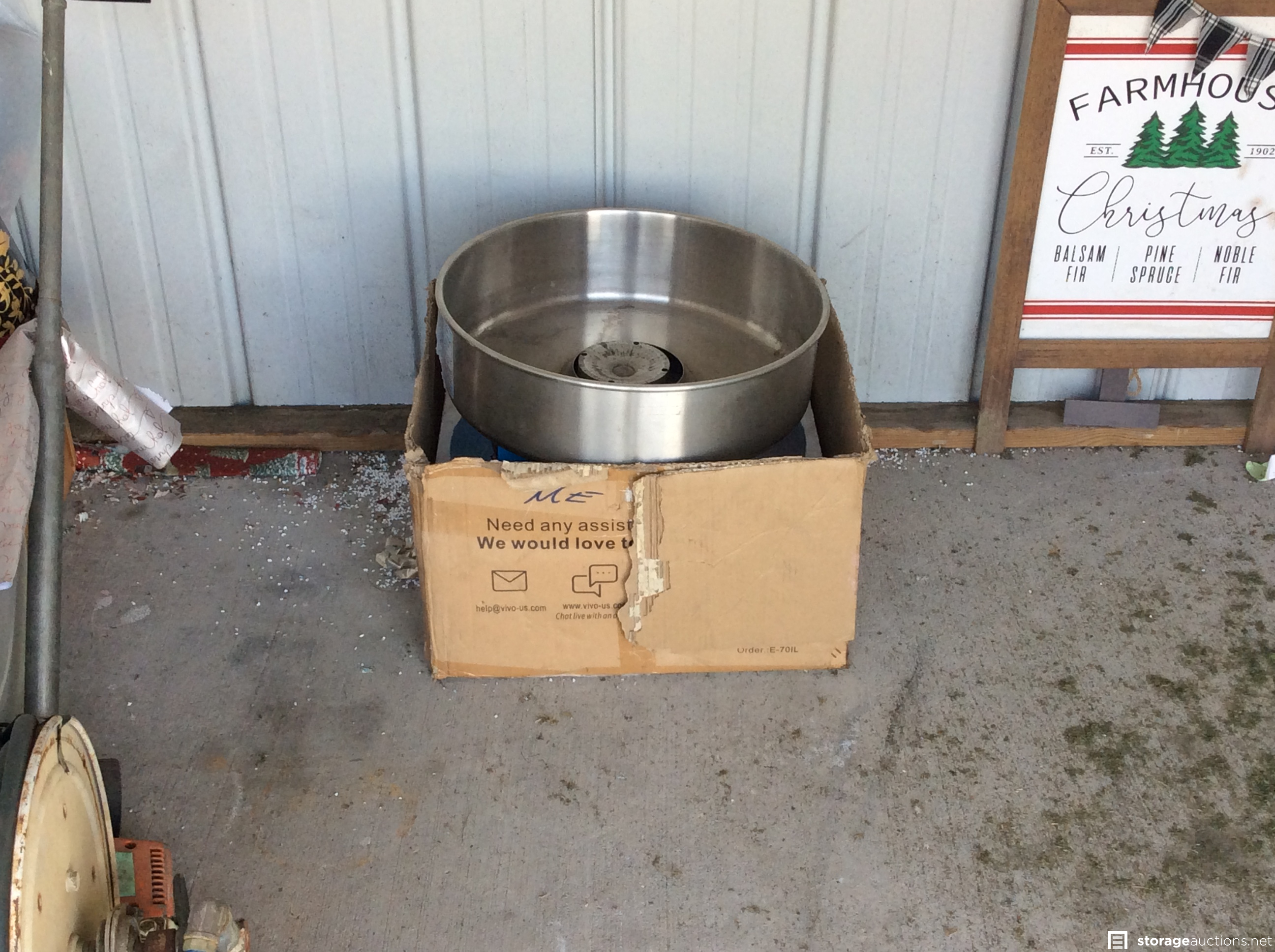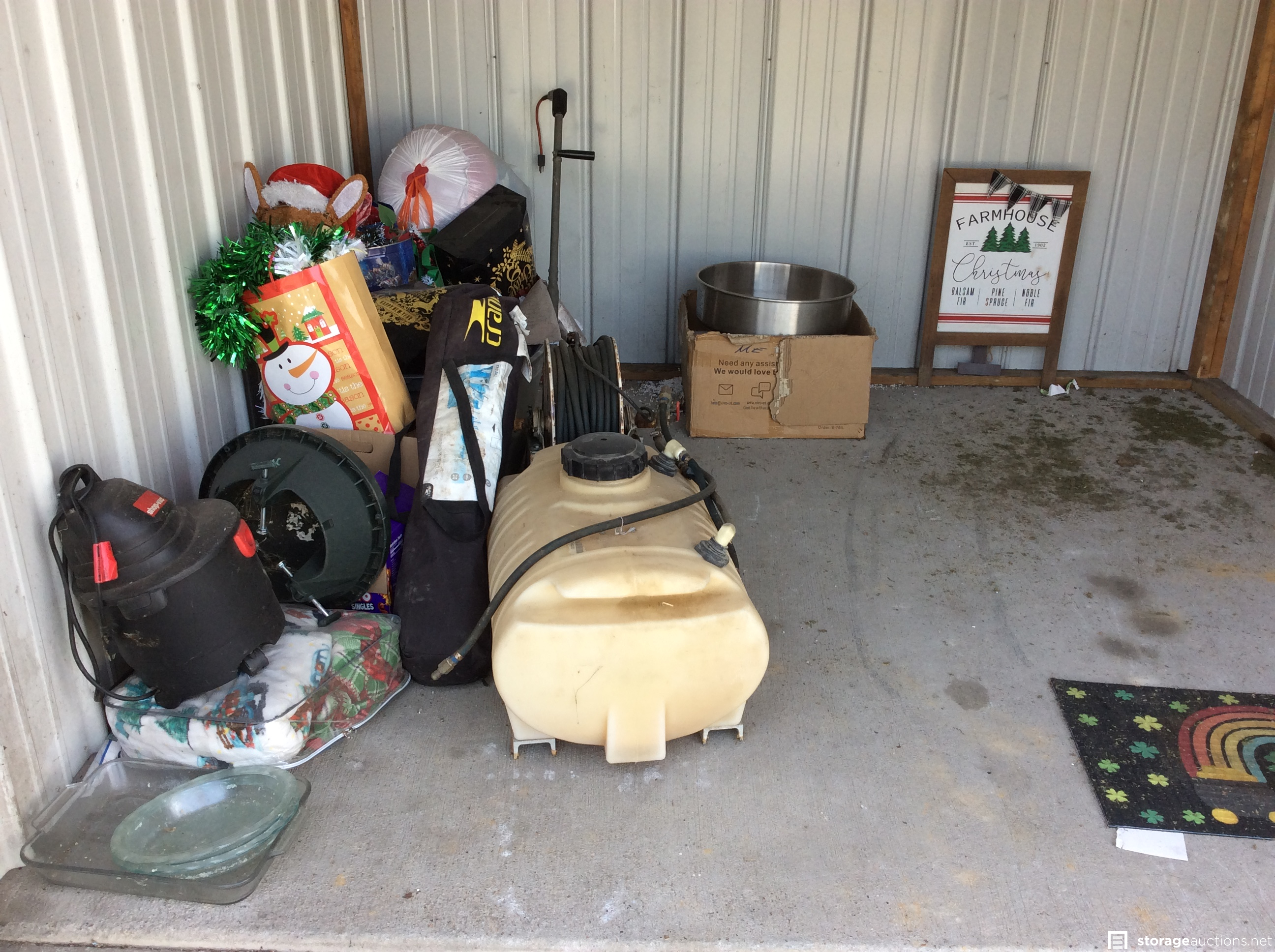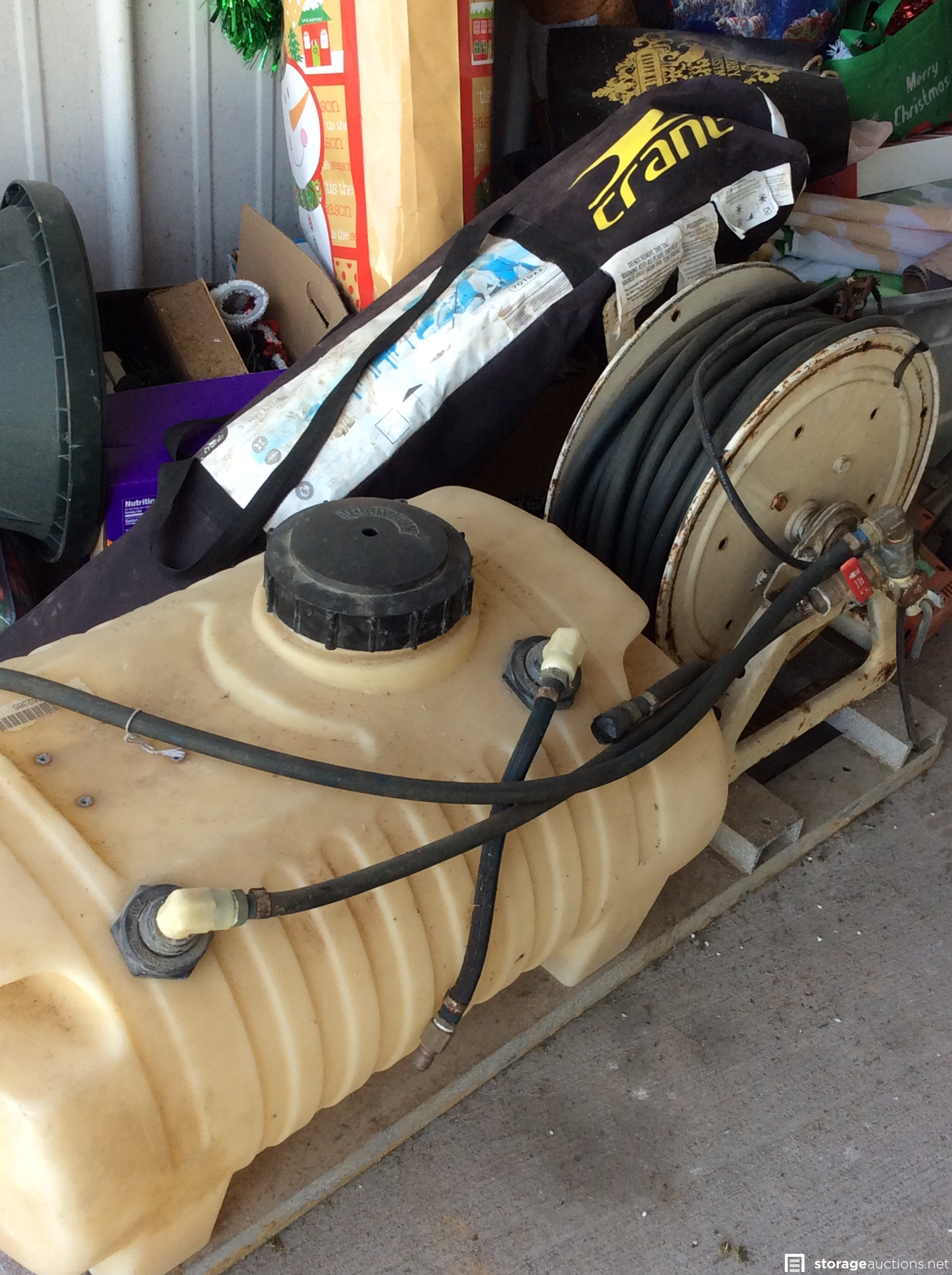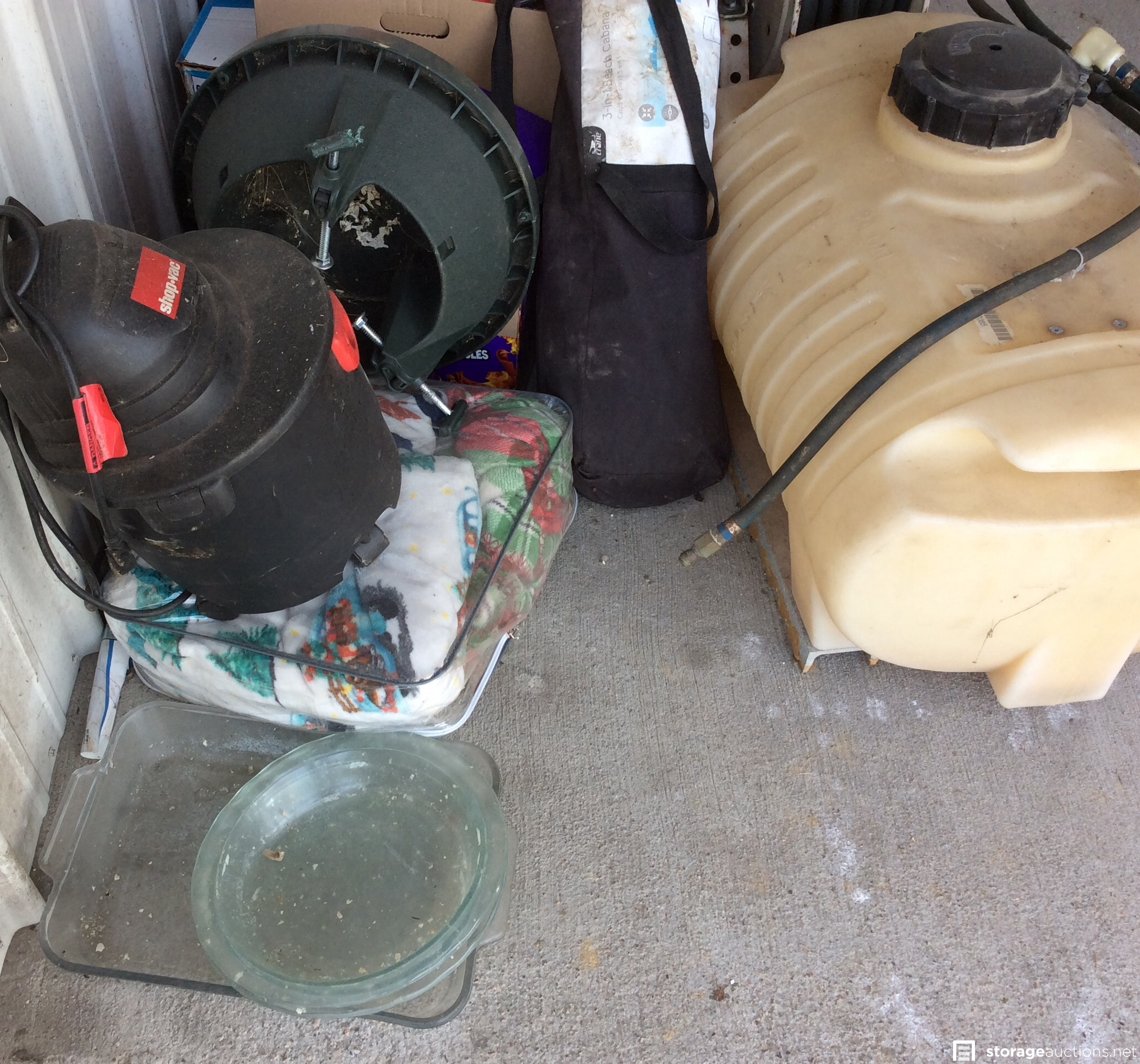 Shop vac, cotton candy machine??, holiday decorations, glass baking dishes, 3-1 beach cabana, large holding tank w/hoses, some type of electric yard tool