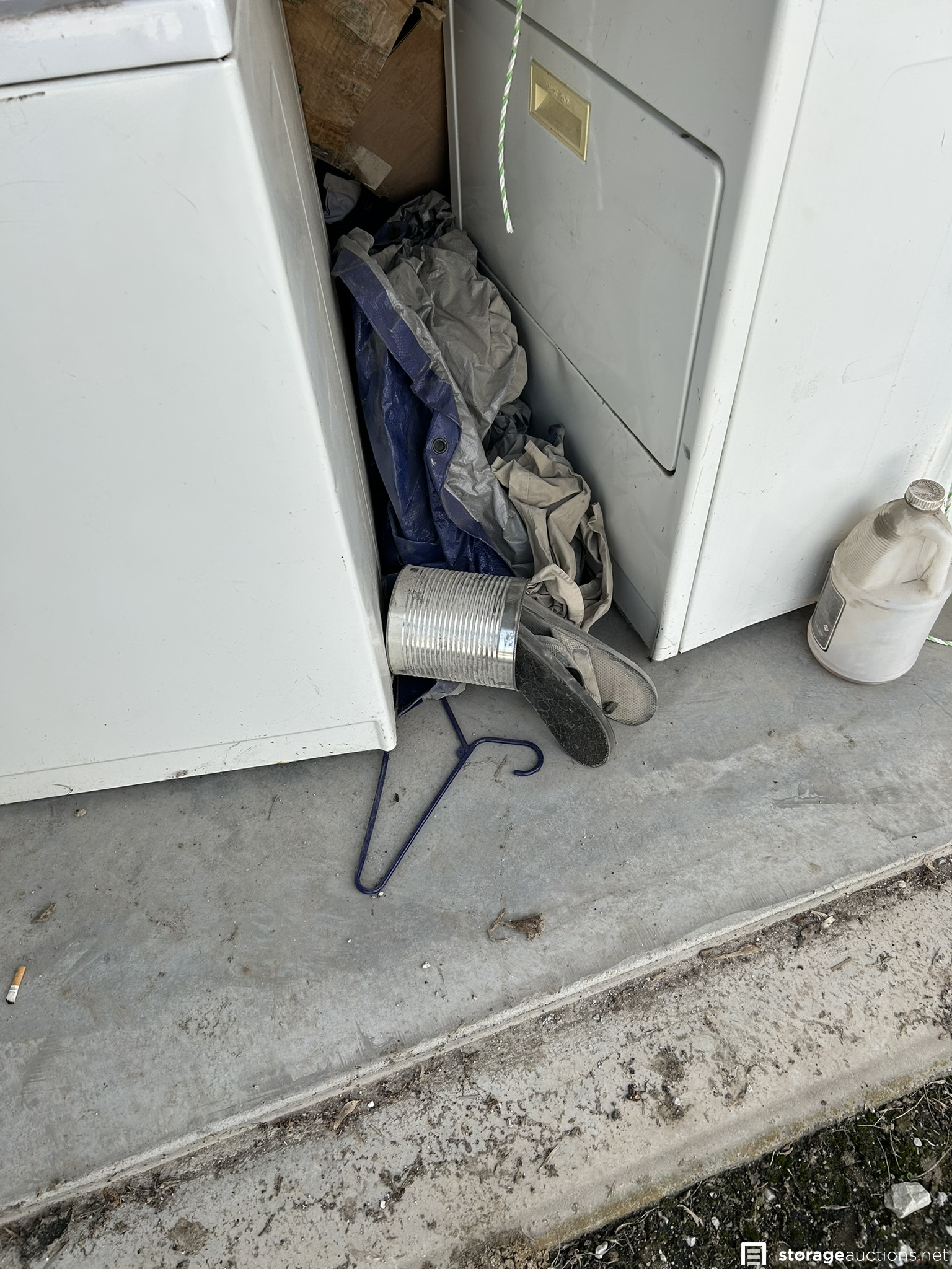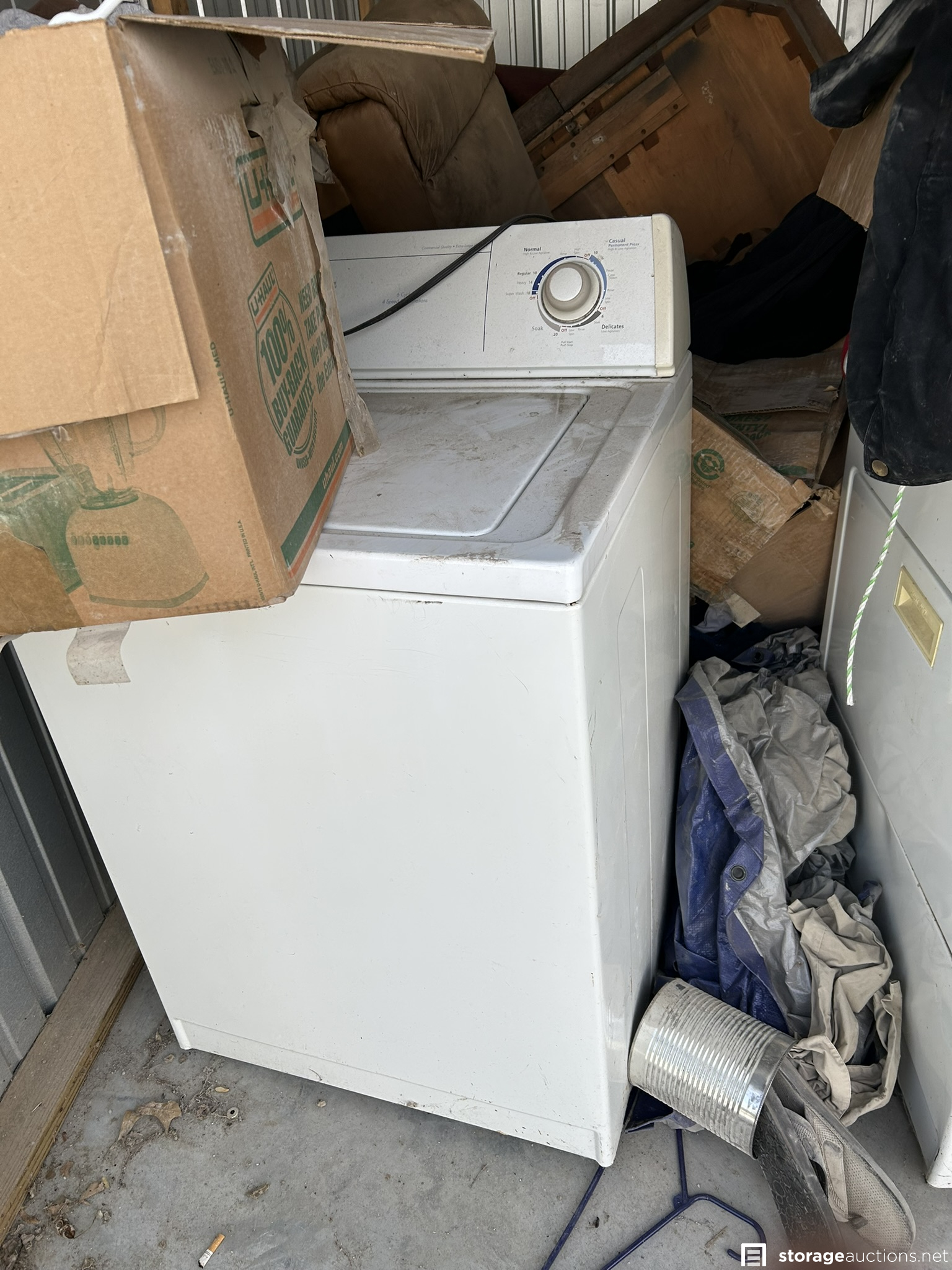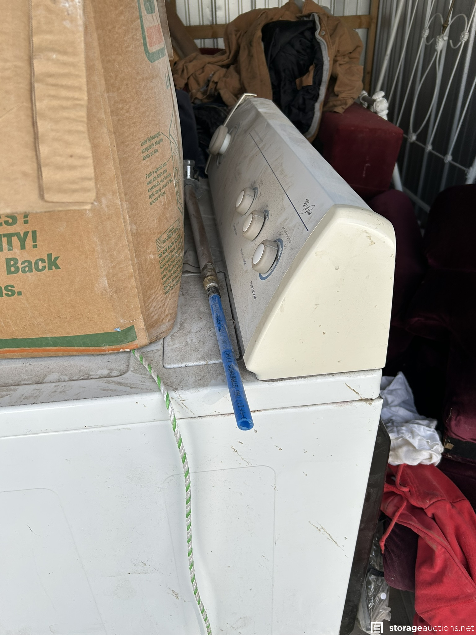 Washer and dryer, bed frame, cowboy boots, jackets, furniture and various household goods.