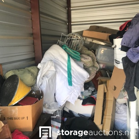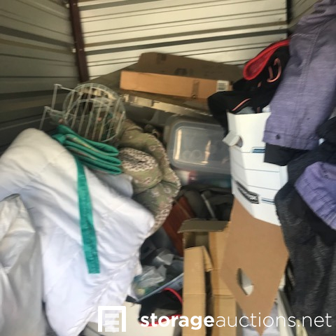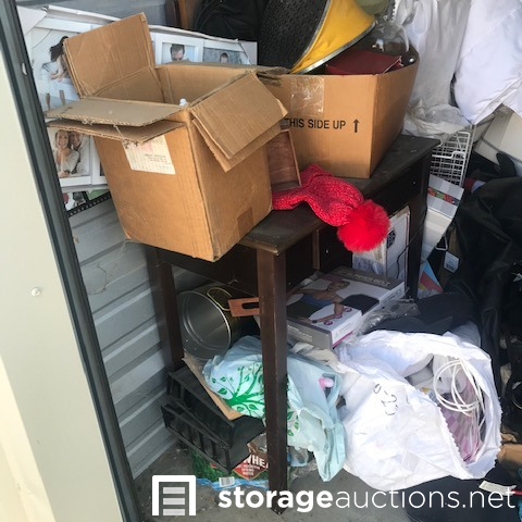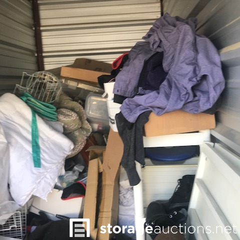 Misc boxes and bags, bedding, shelf, table, camp chair, clothing