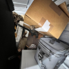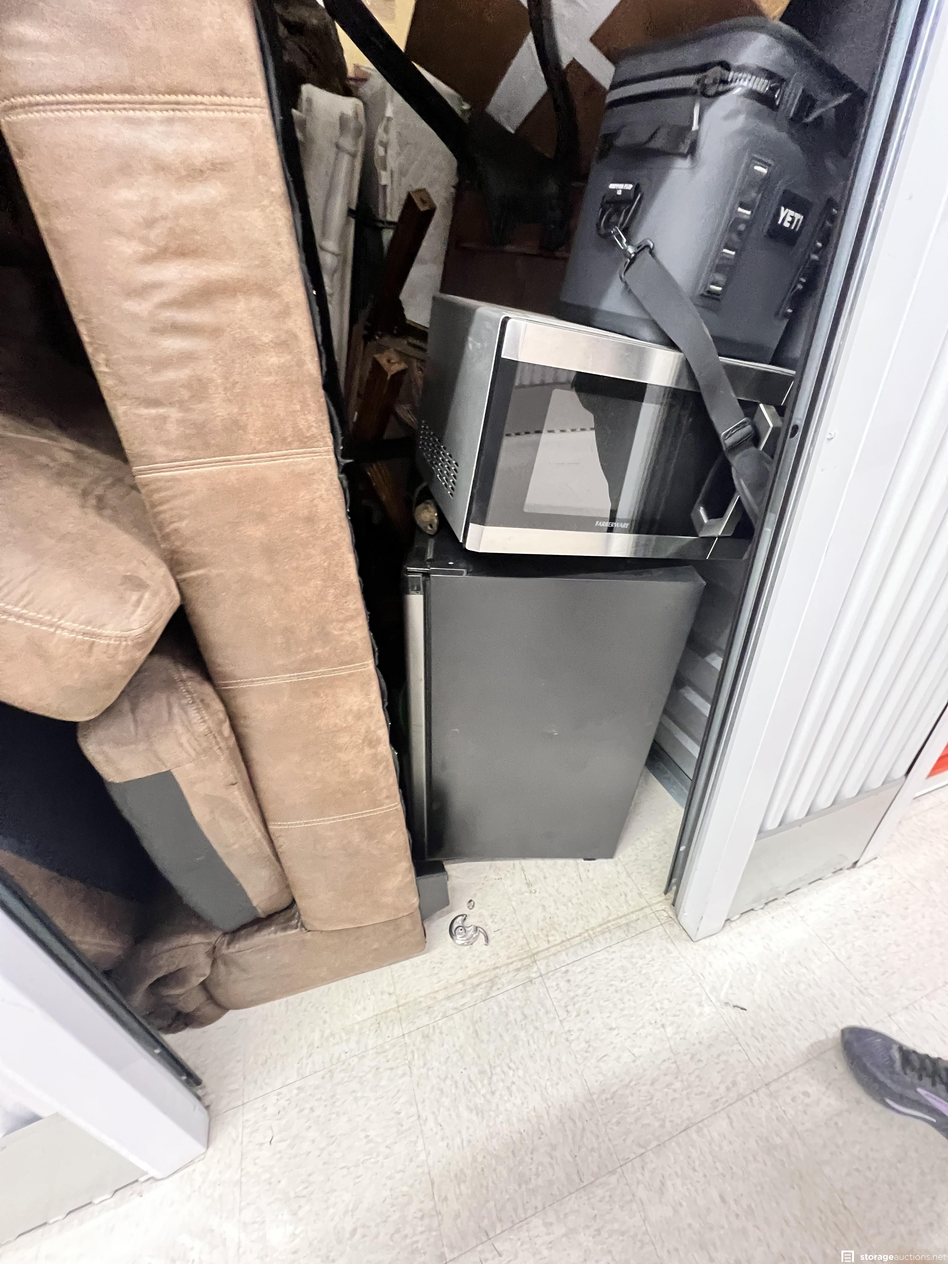 This unit has boxes, tables, couch, fridge, microwave, mattress