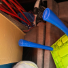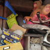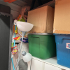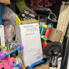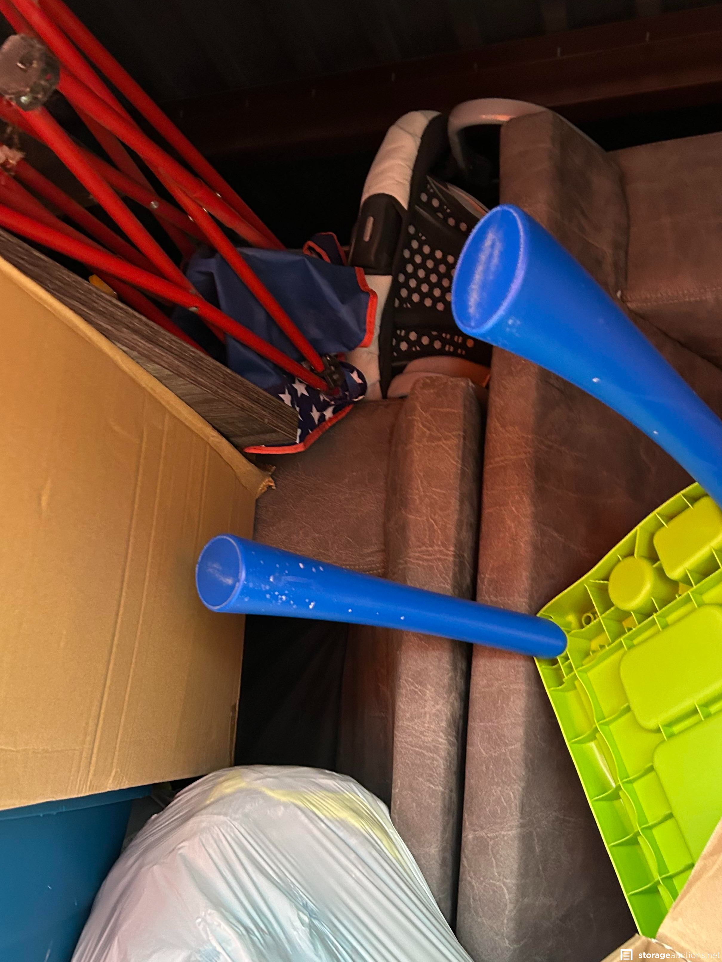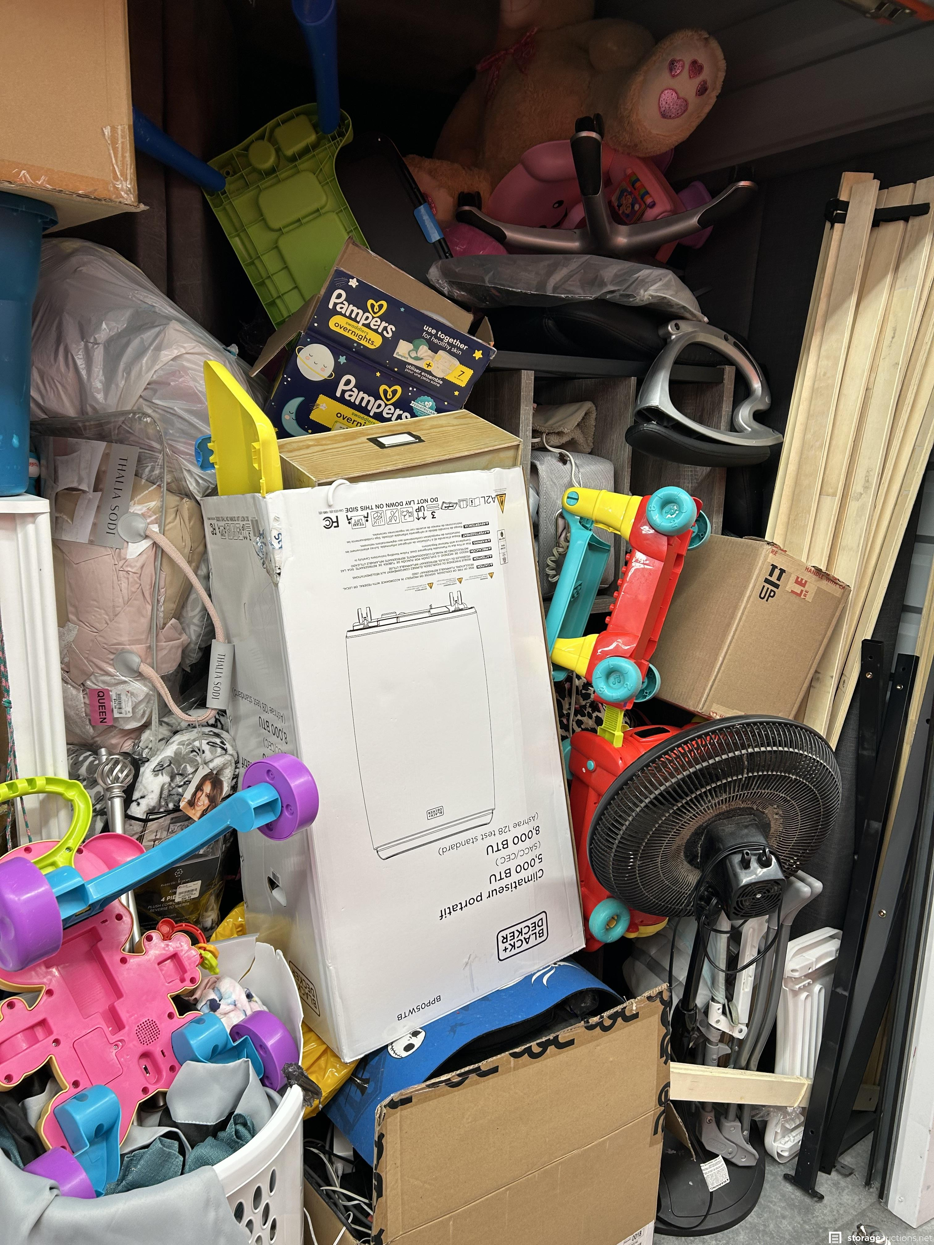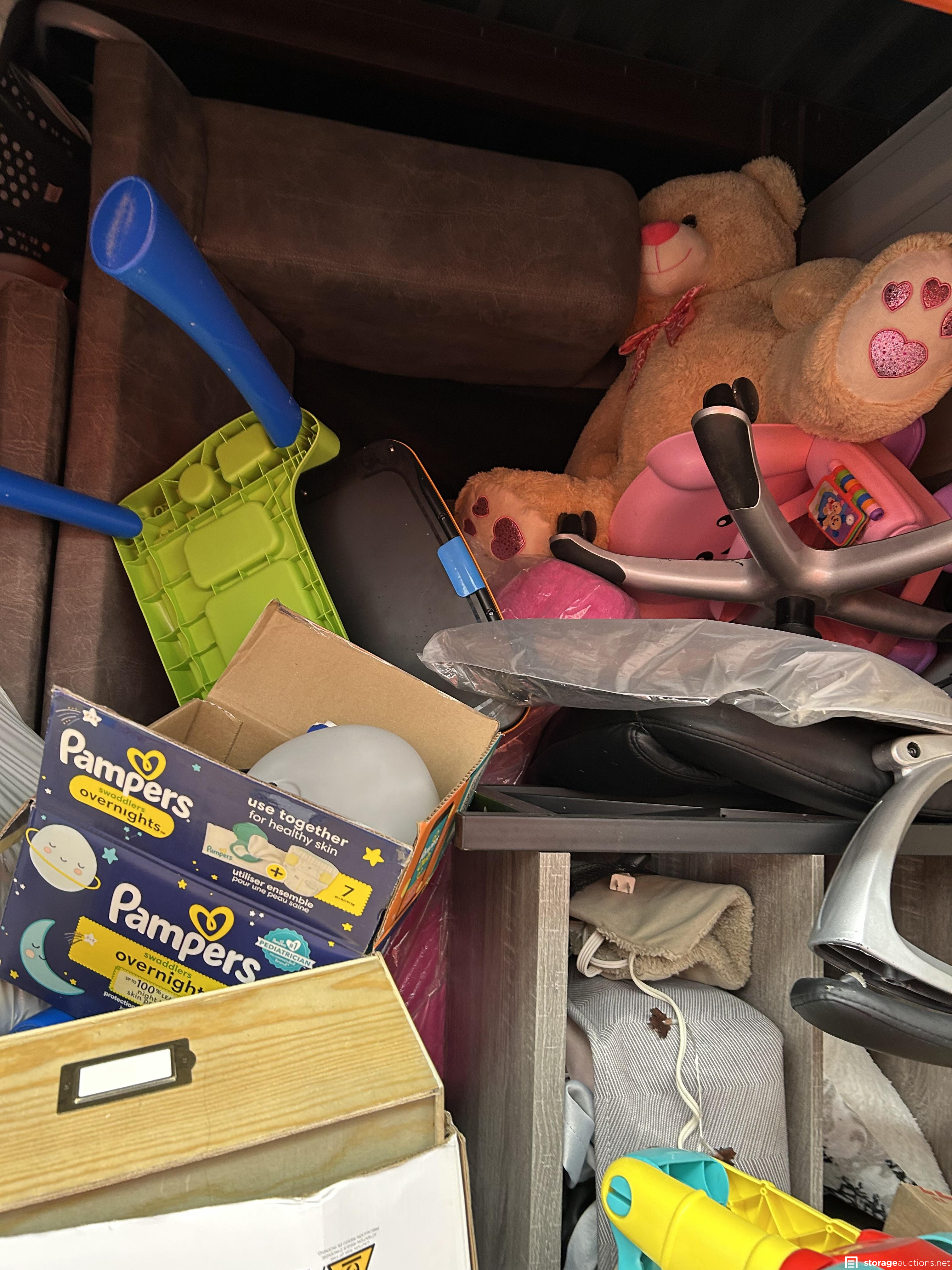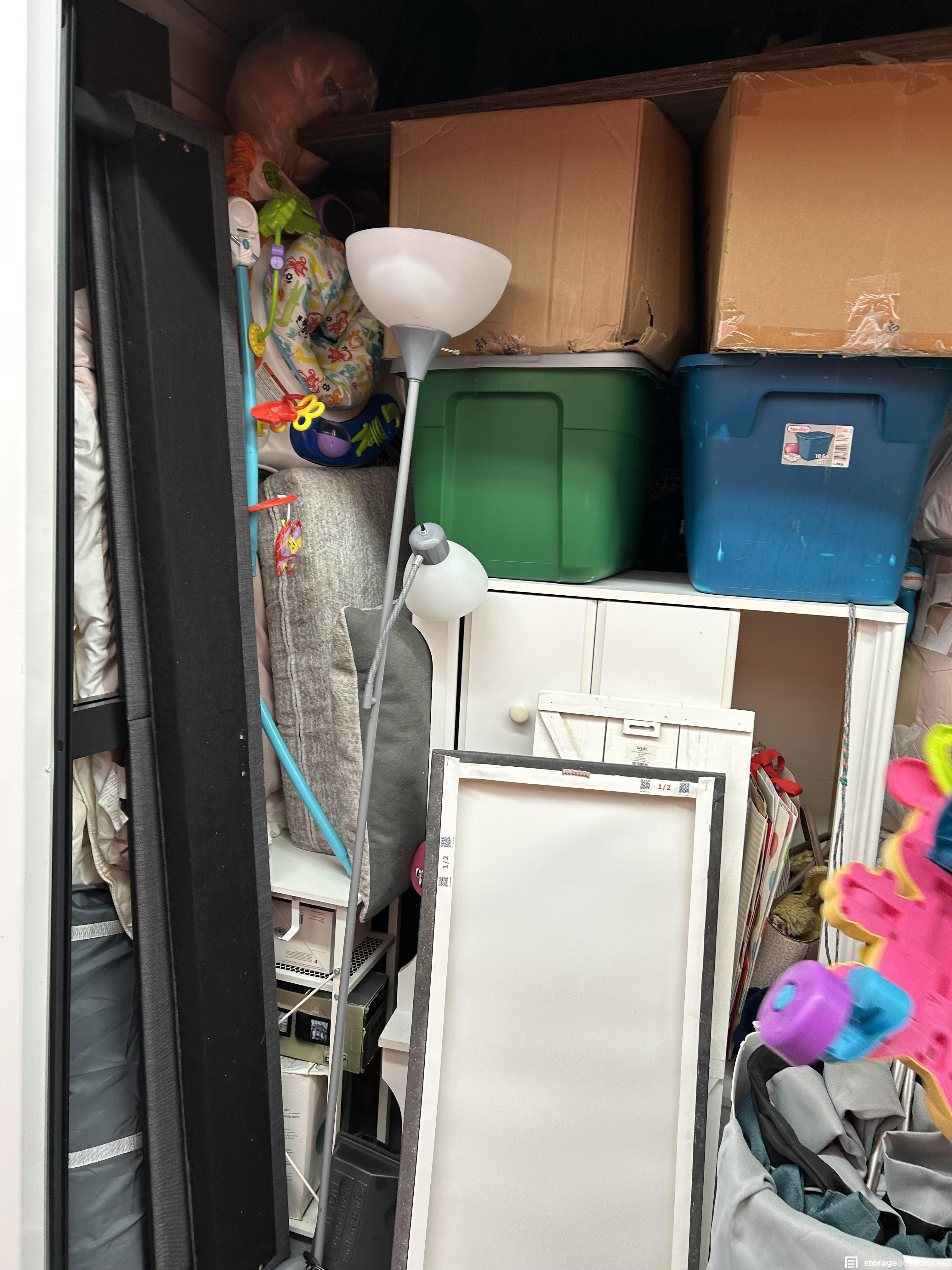 This unit has totes, boxes, toys, bed frame, fan, couch
