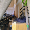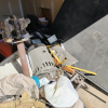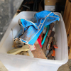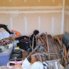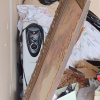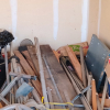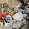 WHAT YOU SEE IS WHAT YOU GET. Things seen from the doorway: green safety cone, Roomba robot vacuum, electric motor(?) or dust collector(?), walker, orange bucket, cast iron skillets, standing vice, hat, tire chains, books, 2 air fryers(?) radiant heater, various bins, totes, and boxes, halogen lights on stand, wood, various metal posts and poles, R.C. truck, View Master booklet (?), hard truck bed cover, various tools, AMES drain spade, wood cabinet, tarps.