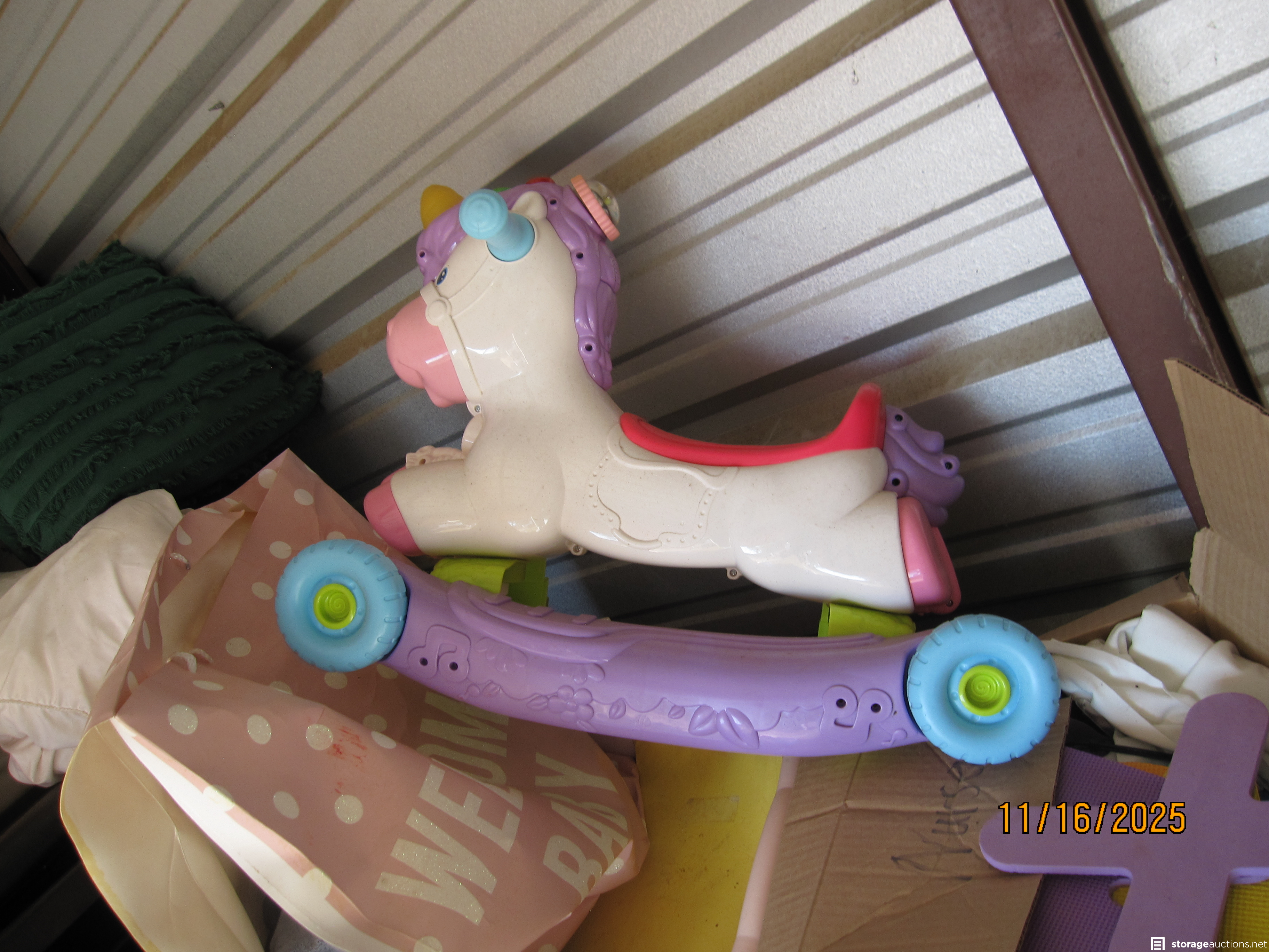 Unit has a lot of infant oriented merchandise. Crib, baby room furniture, toys, some furniture, etc. Looks to be in good shape.