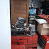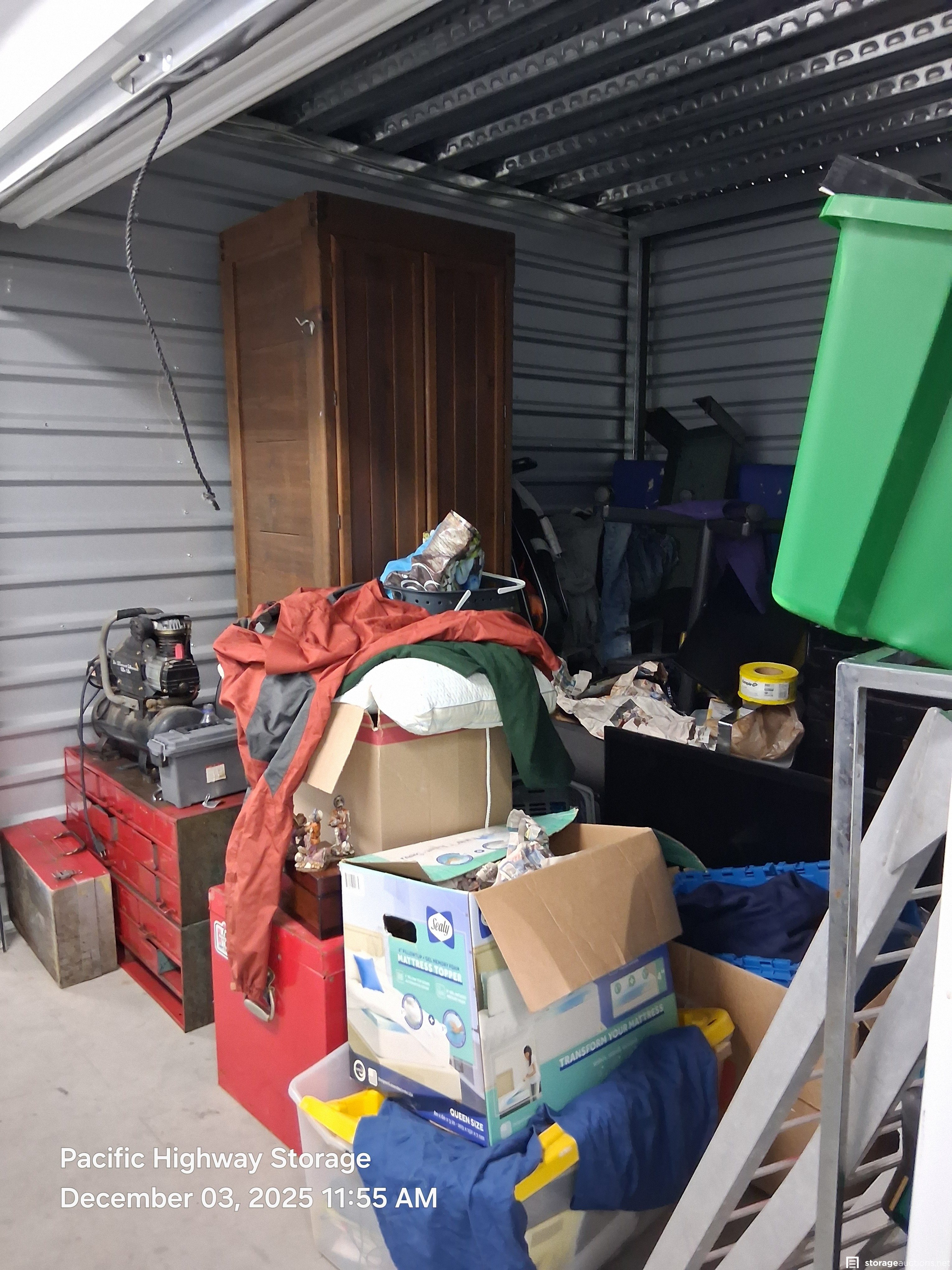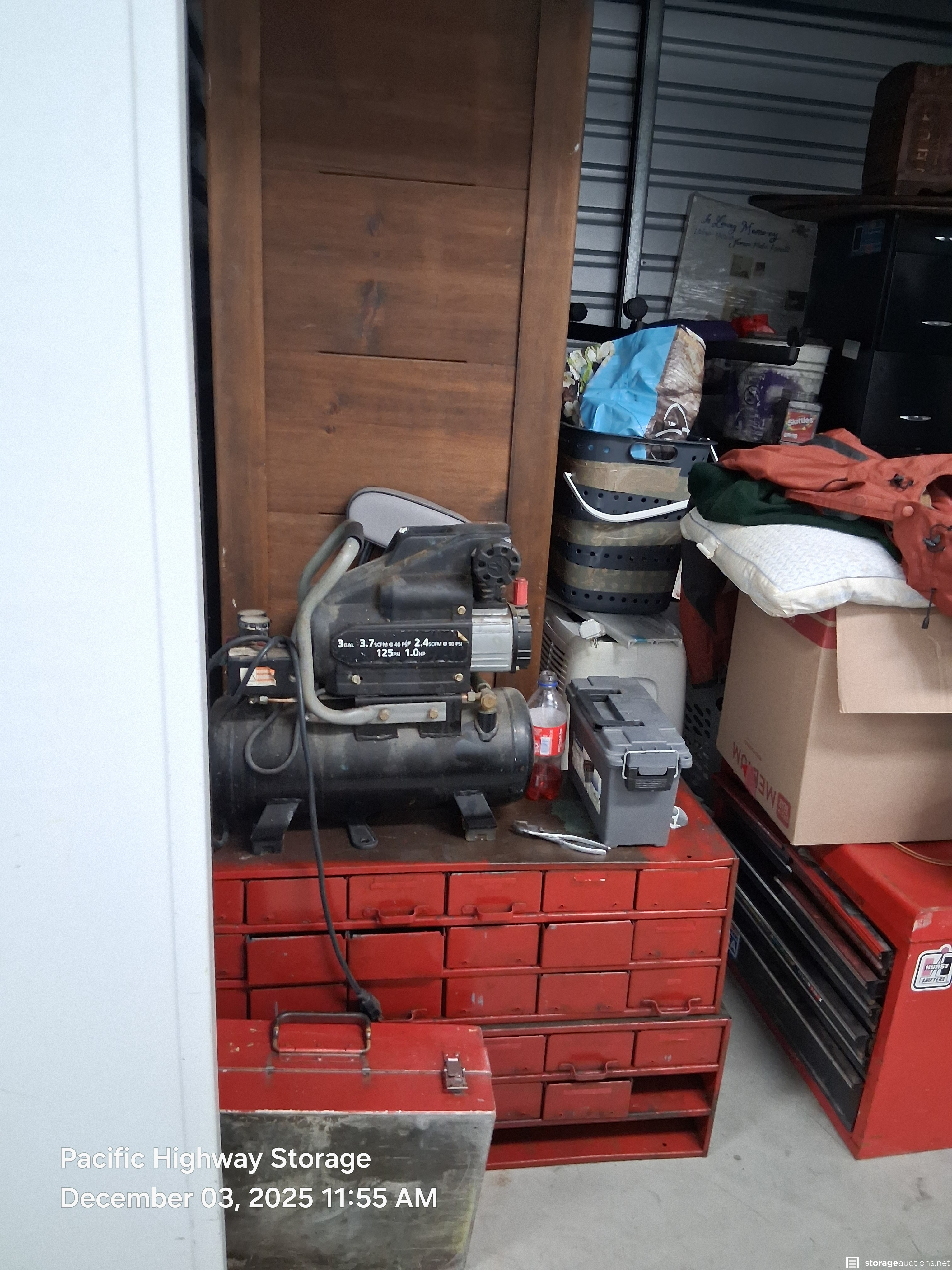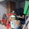 Wardrobe, 6 toolboxes, tv, filing cabinet, air compressor, portable ac, 2 chairs, clothes, sofa, folding chair, 2 tables, truck ramp, skateboard, car jacks, 3 plastic totes
