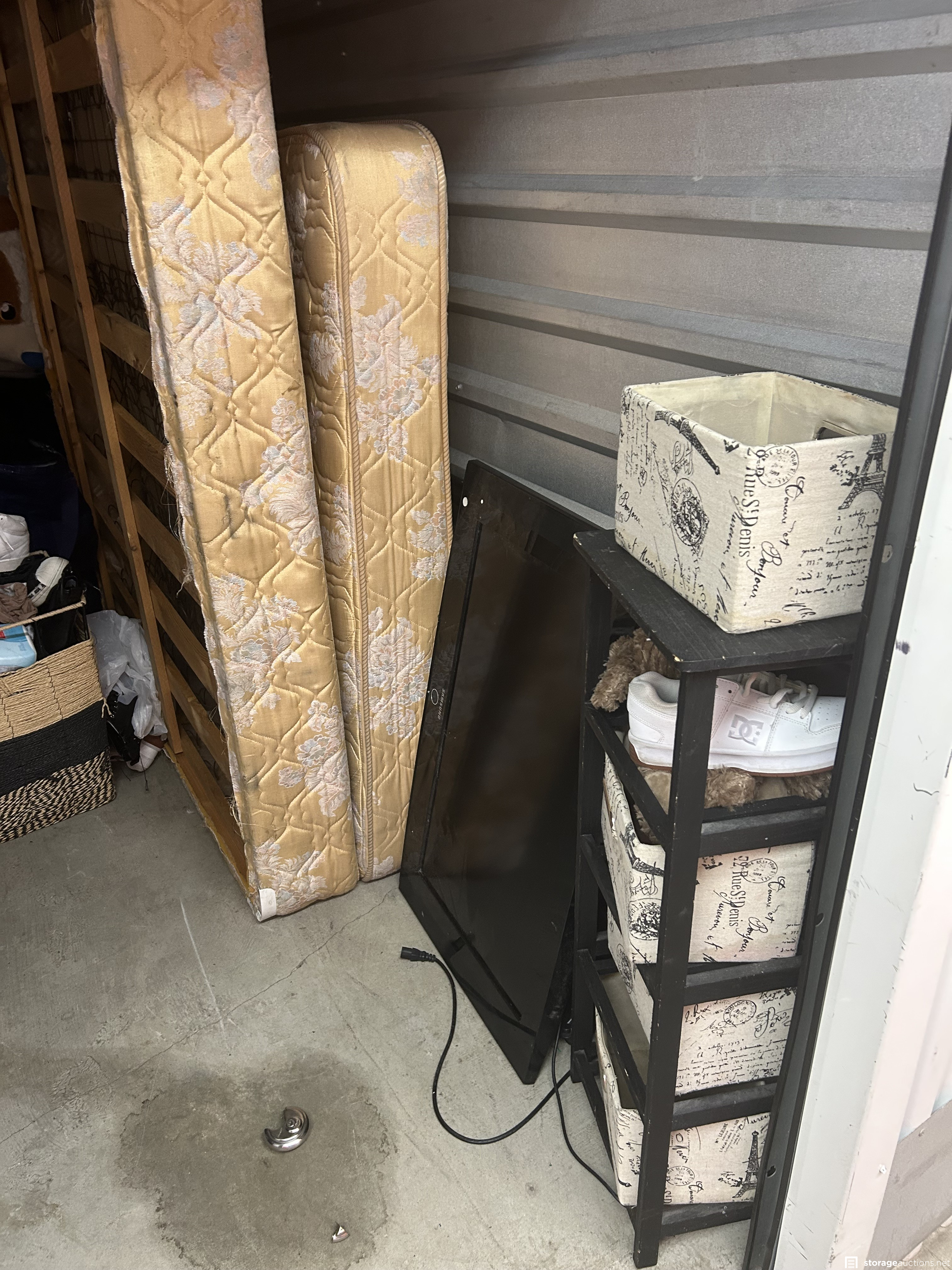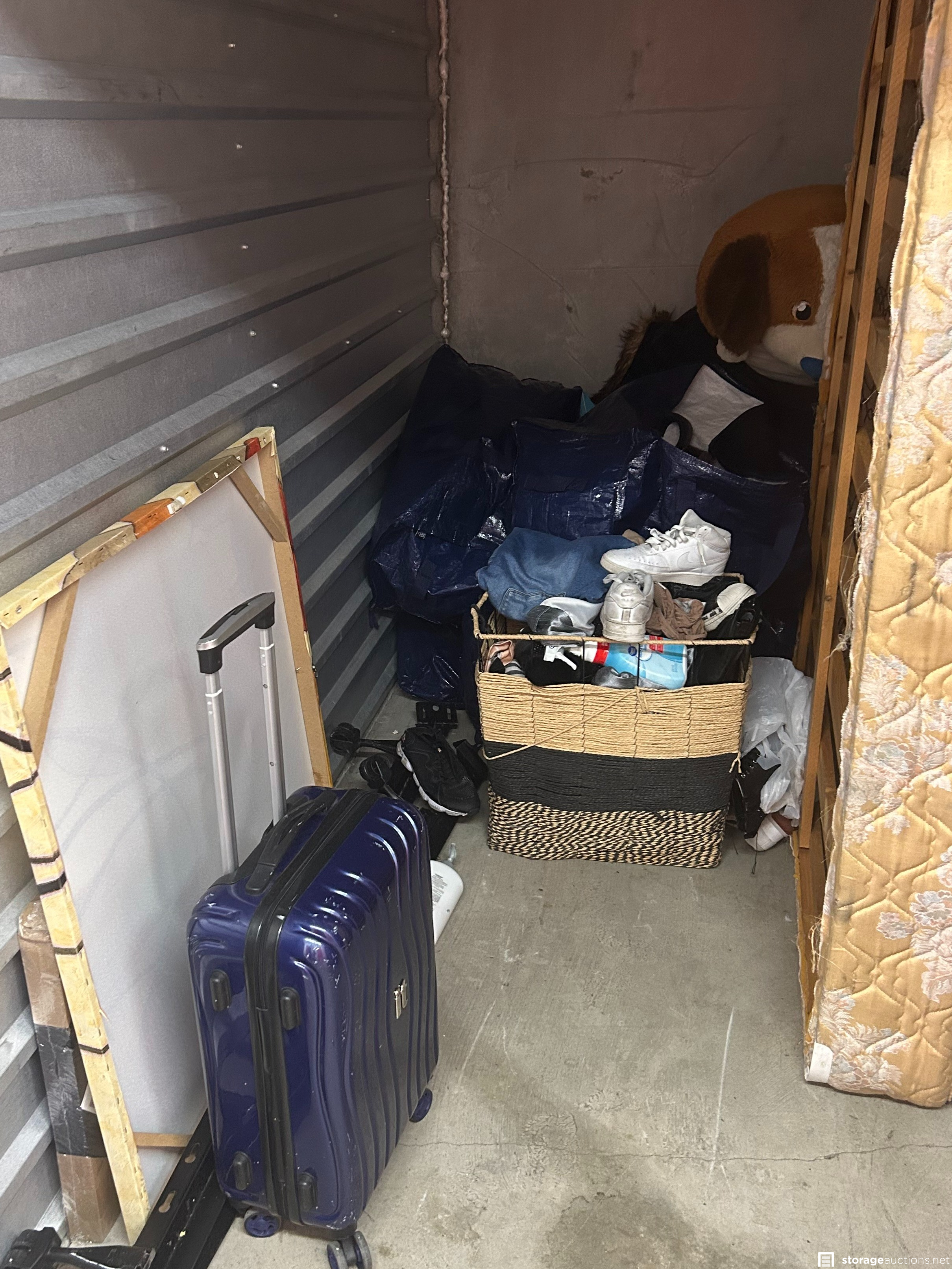 This unit has shelf, mattress, bedframe, tv, shoes, stuffed animal, bags, art, suitcase