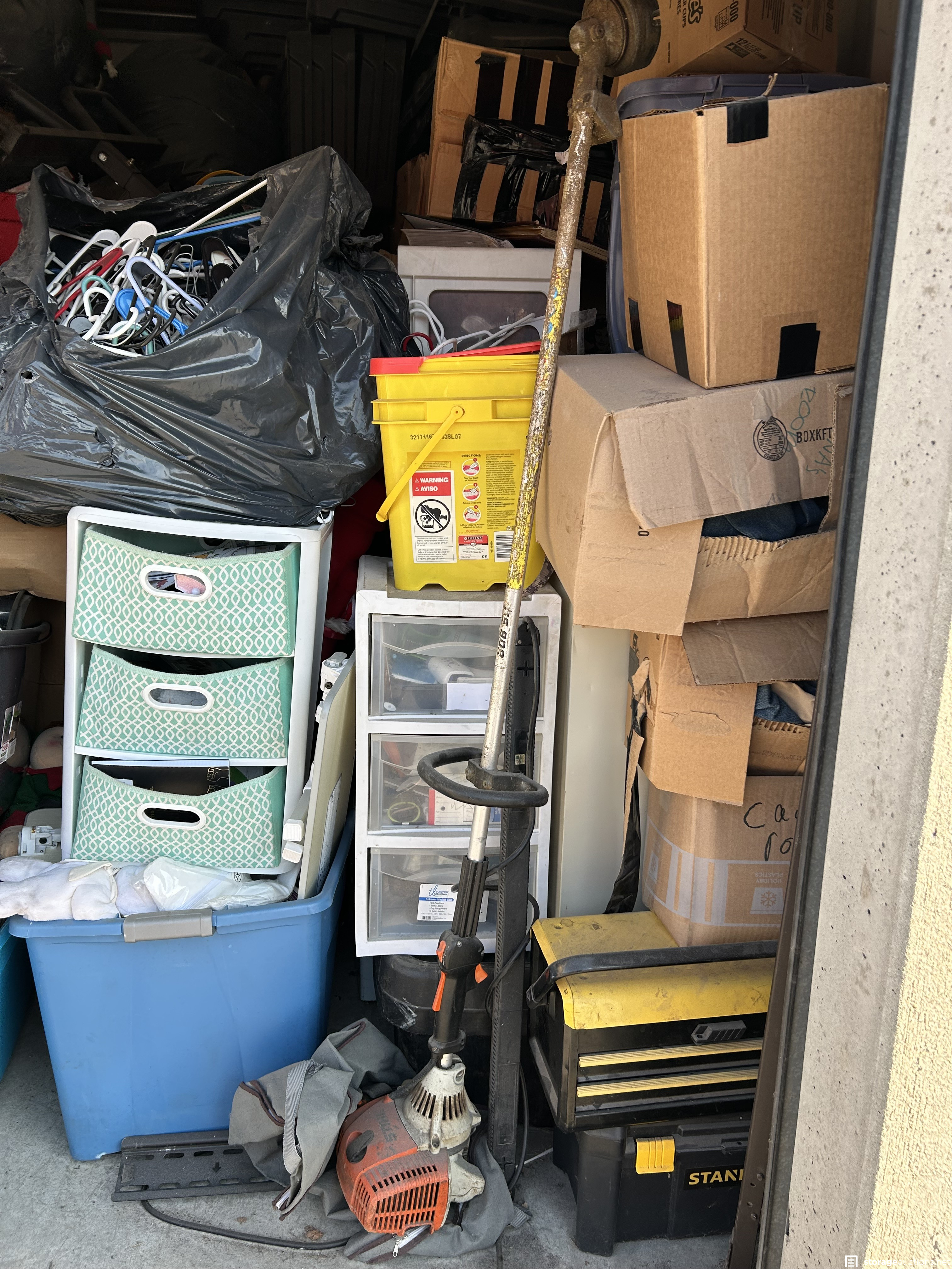 This unit has weedeater, toolbox, totes, boxes, stand
