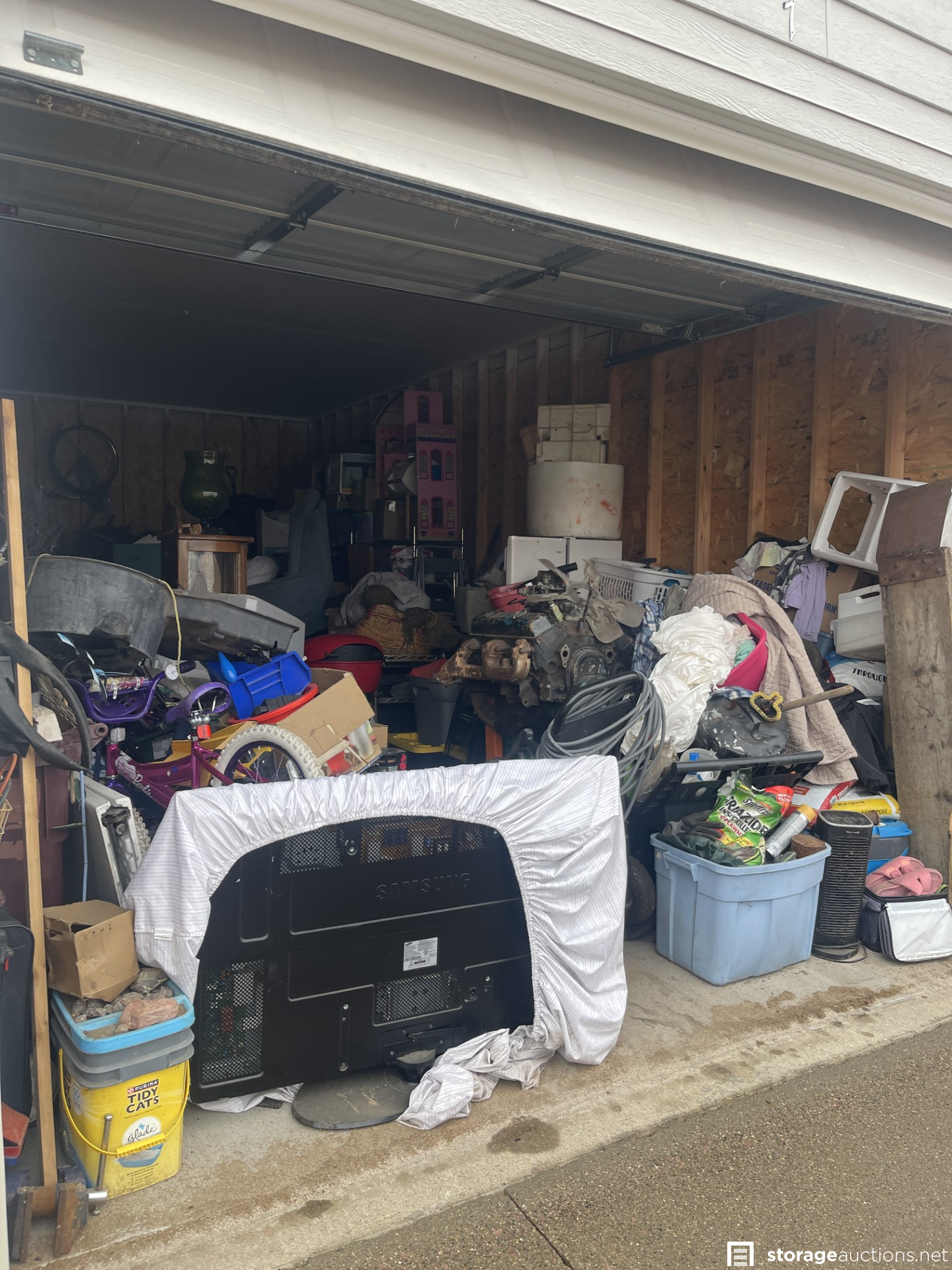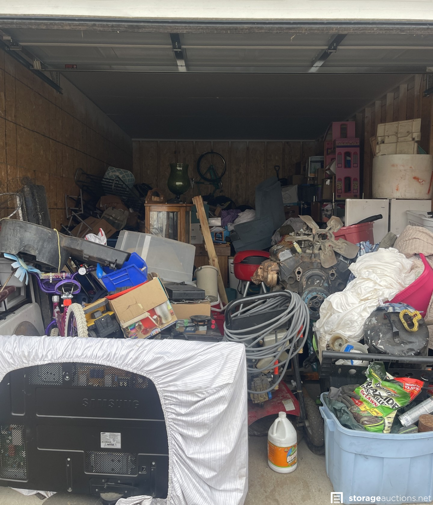 Flat screen TV, vehicle engine, power washer, furniture (a display cabinet, dresser, chair, and folding table) children's toys (bicycles & a dollhouse), and other various household items.