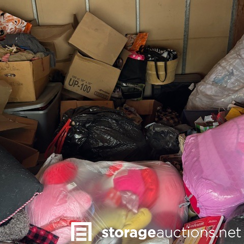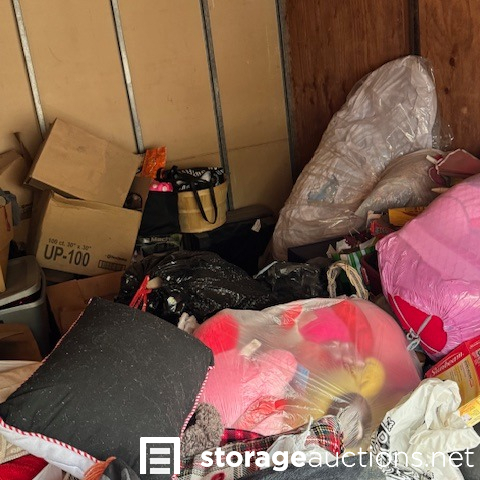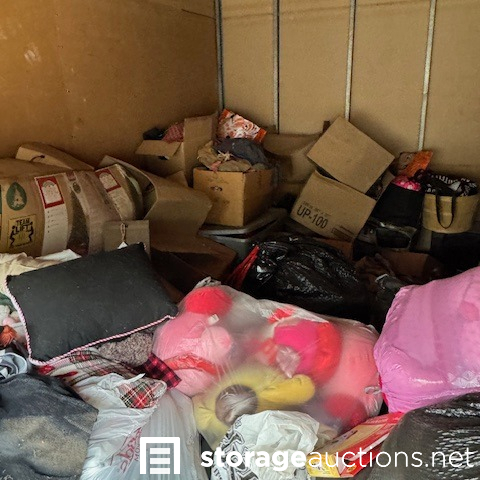 This unit appears to contain, 15+ boxes, clothing, bedding, suitcases, 4+ totes, 2 night stands, bags, decorations, misc items.