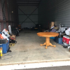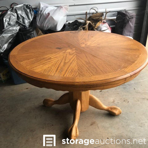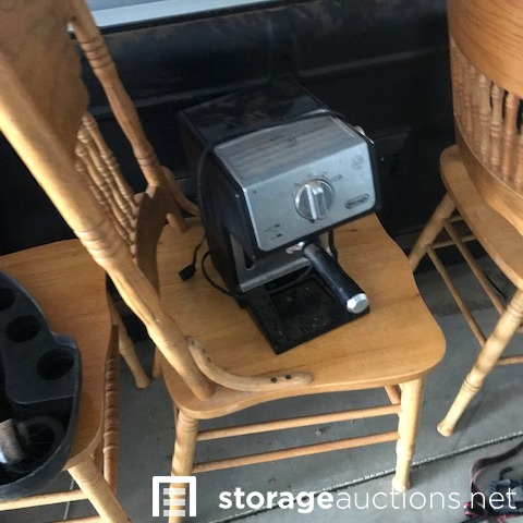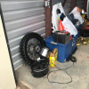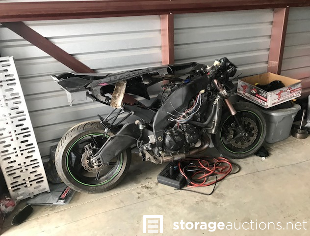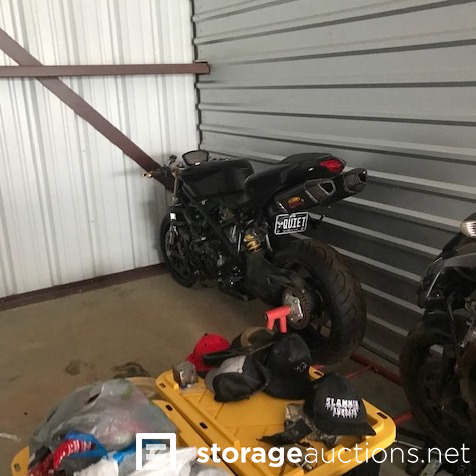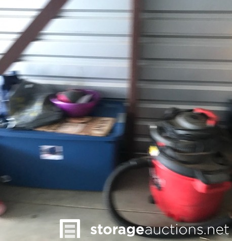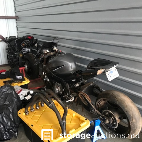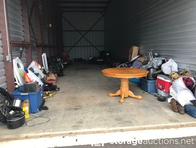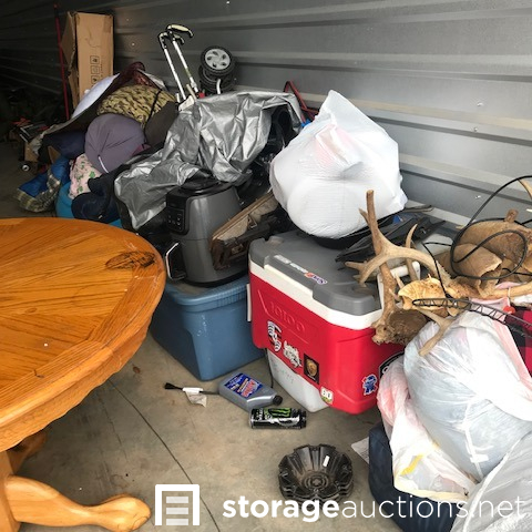 MOTORCYCLES INSIDE UNIT DO NOT GO WITH THE SALE! Dining table and chairs, camping items, motorcycle loading ramp, air fryer, crockpot, expresso maker, baby items, motorcycle tire with wheel, totes, shop vac, ice chest, antlers.