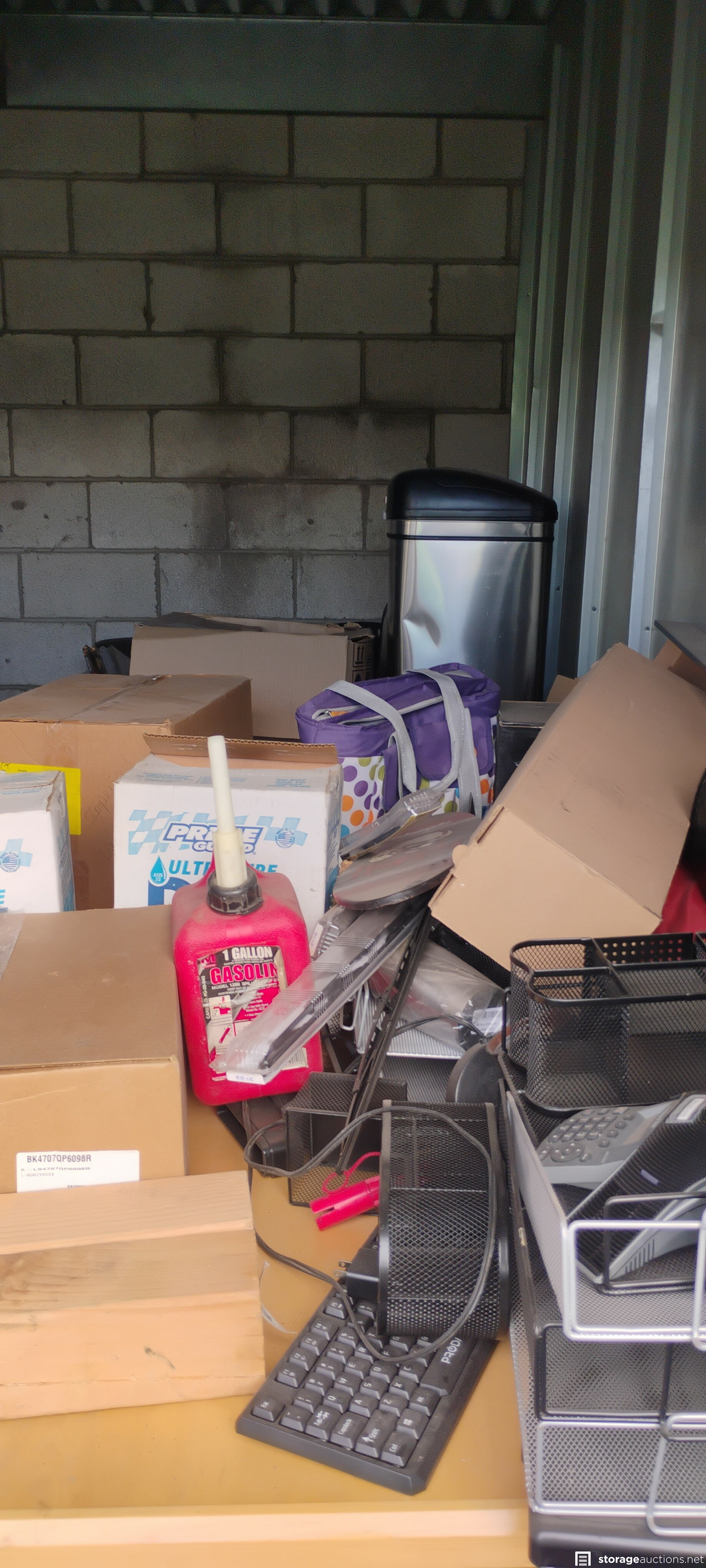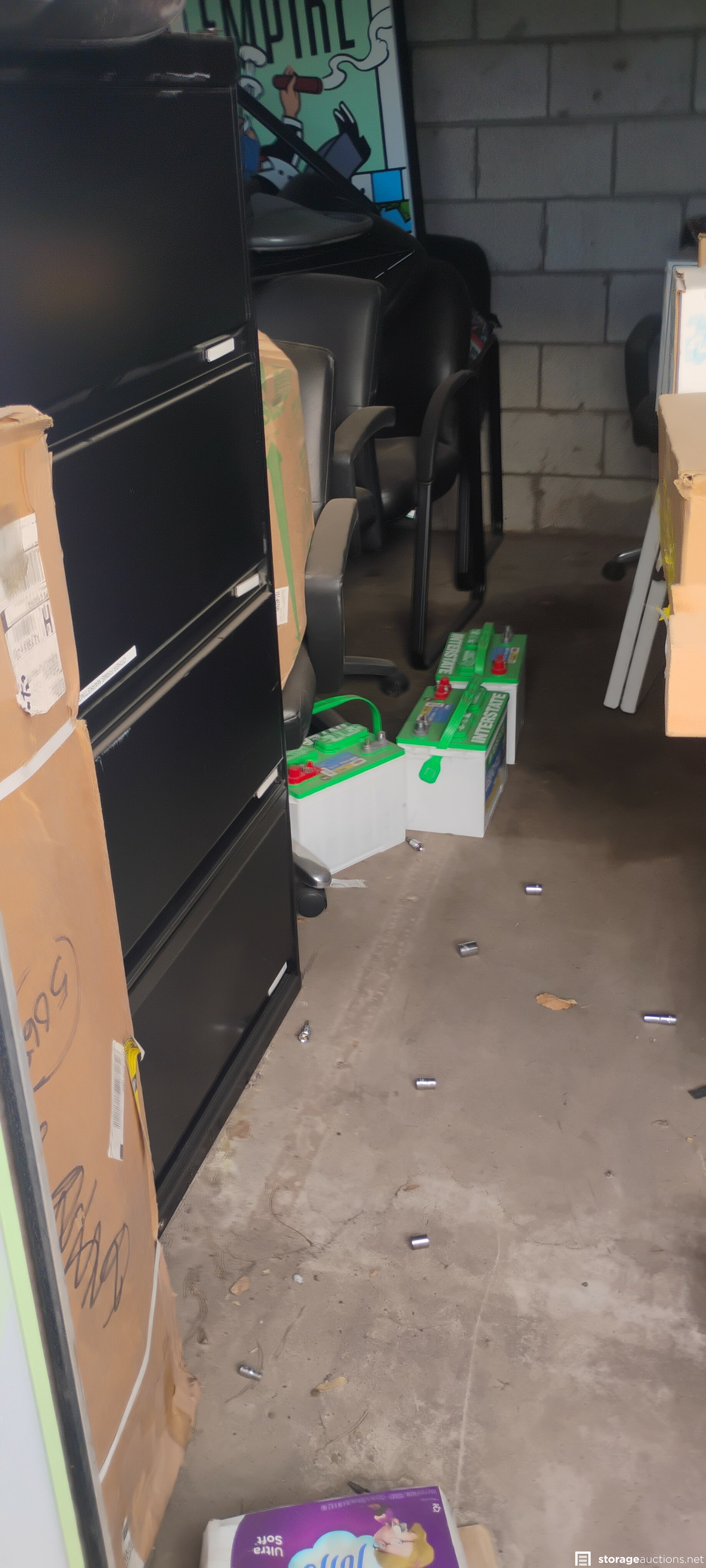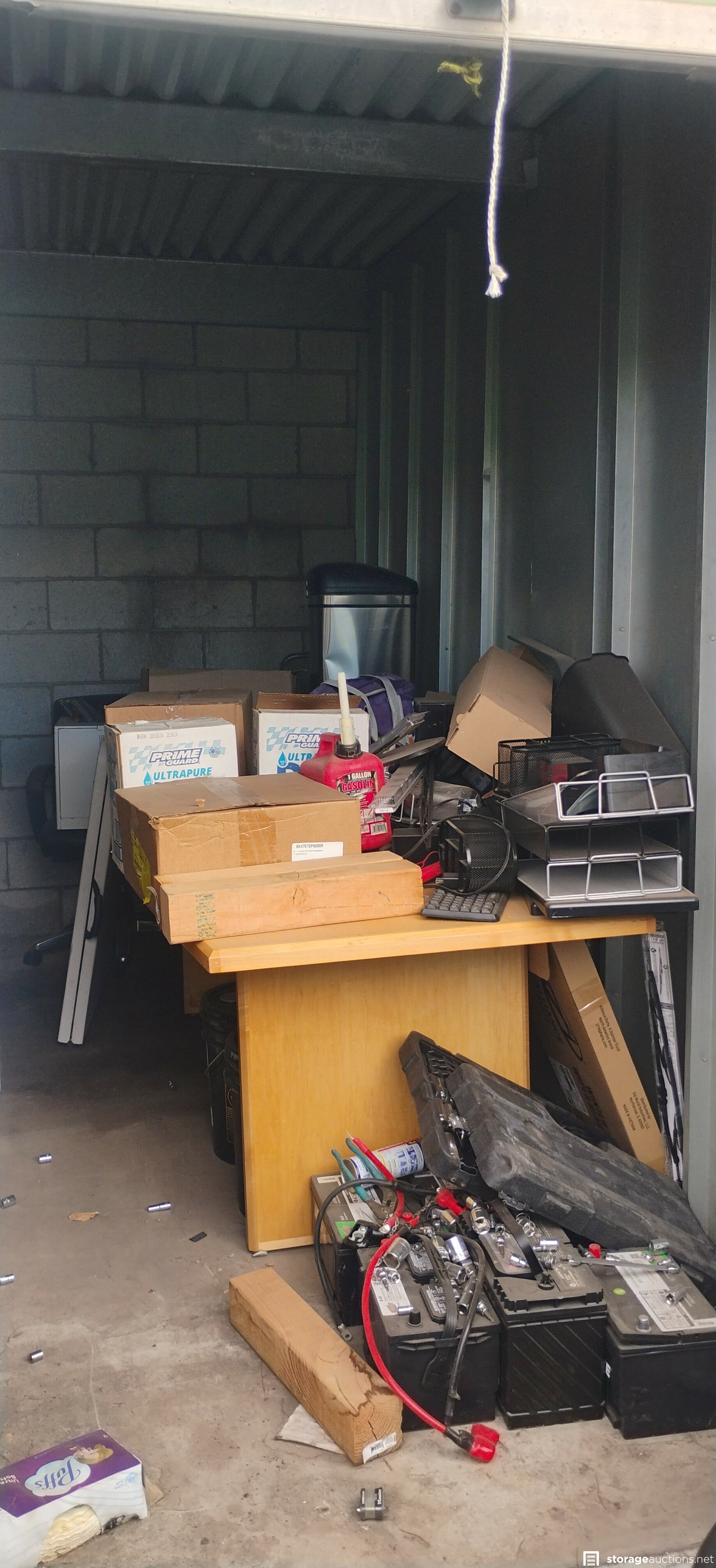 Desk, car or truck batteries, gas can's, Hydrolic fluid, computer monitor , file cabinets, folding table , and much more.