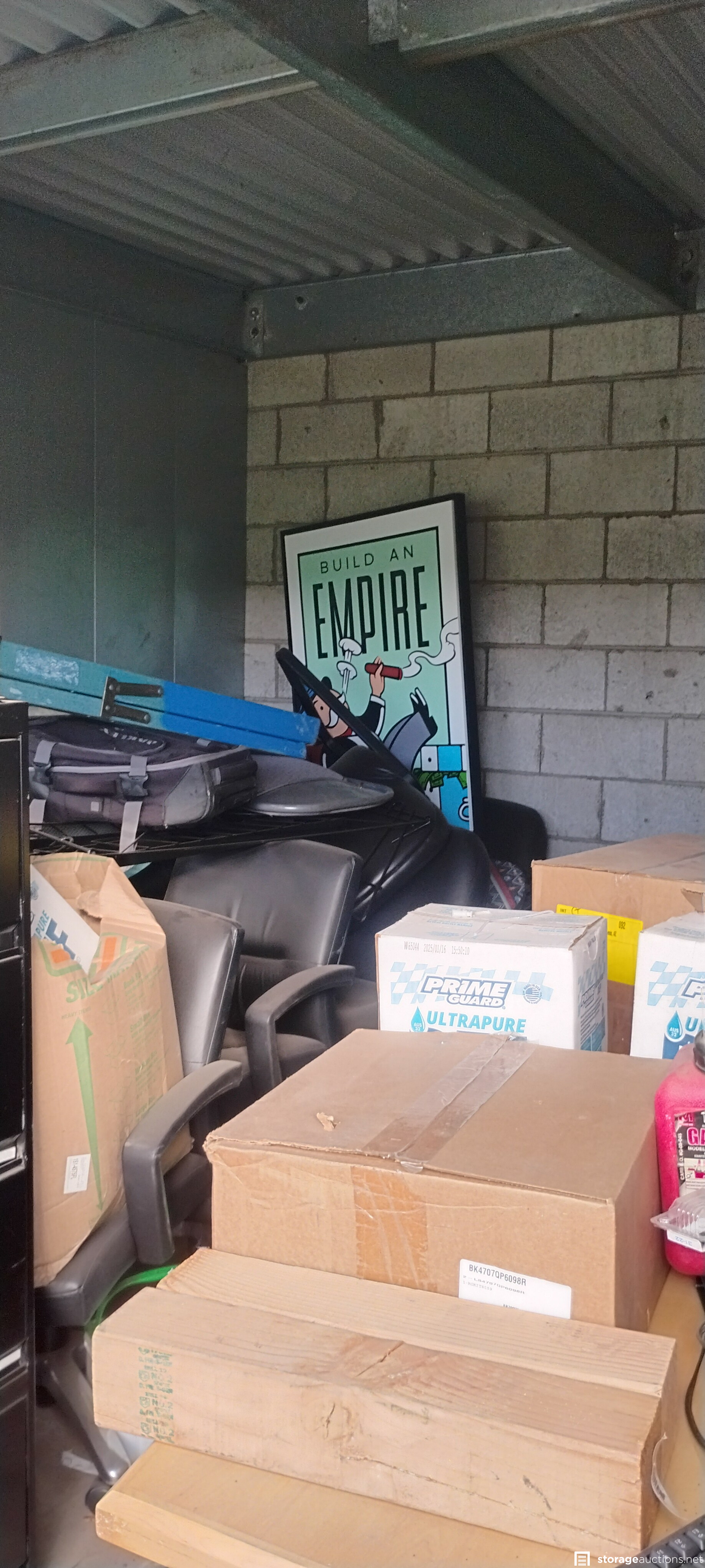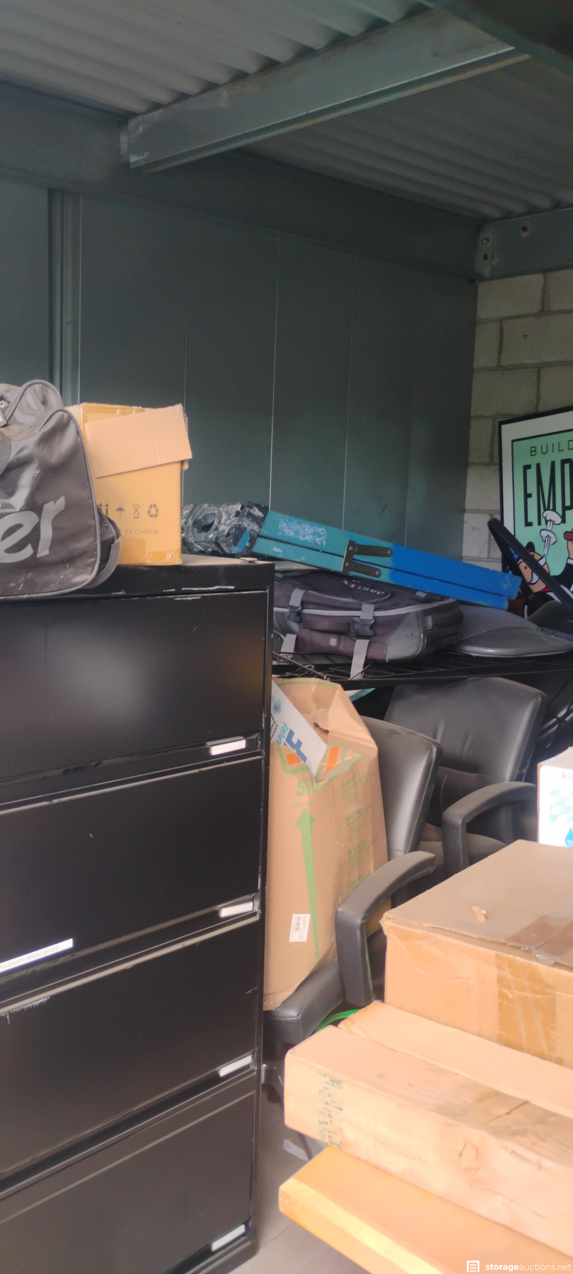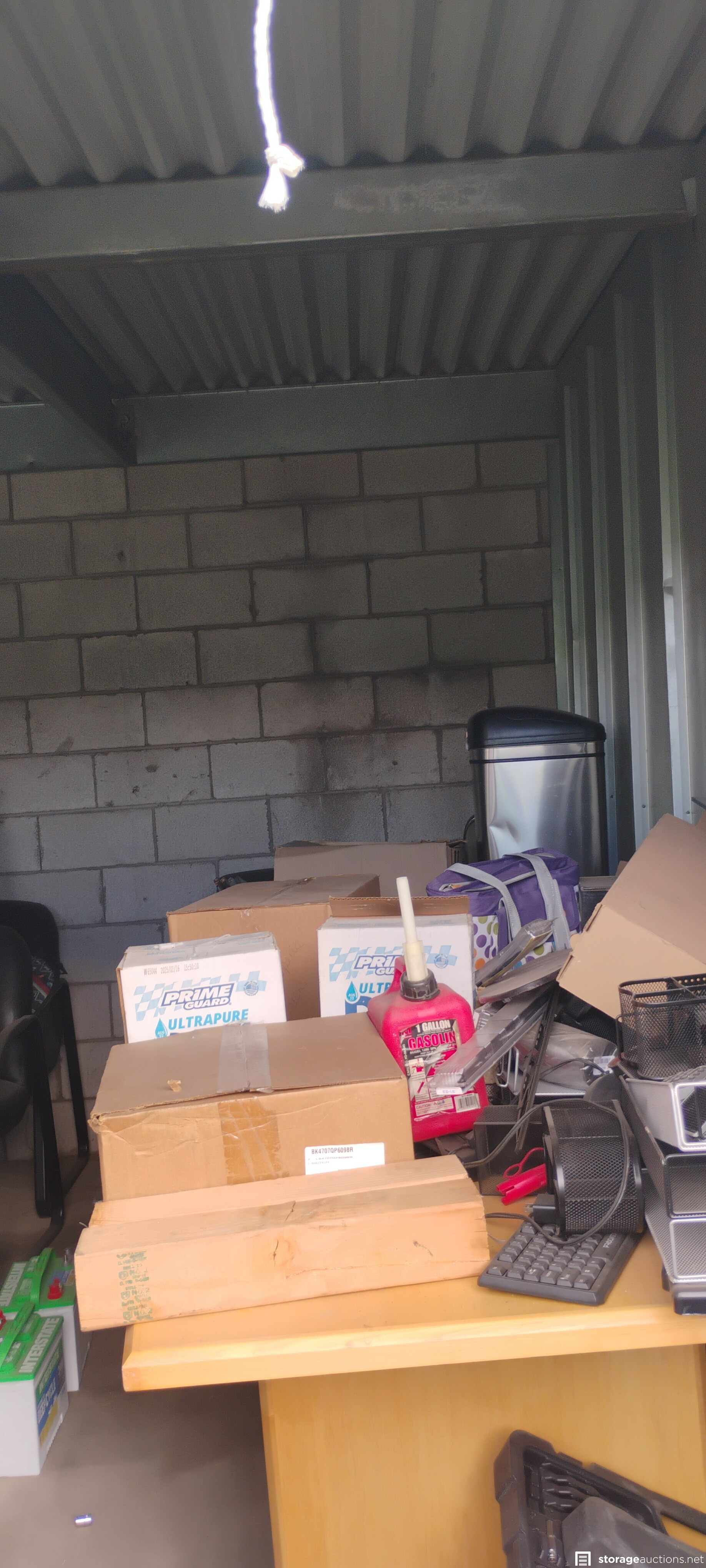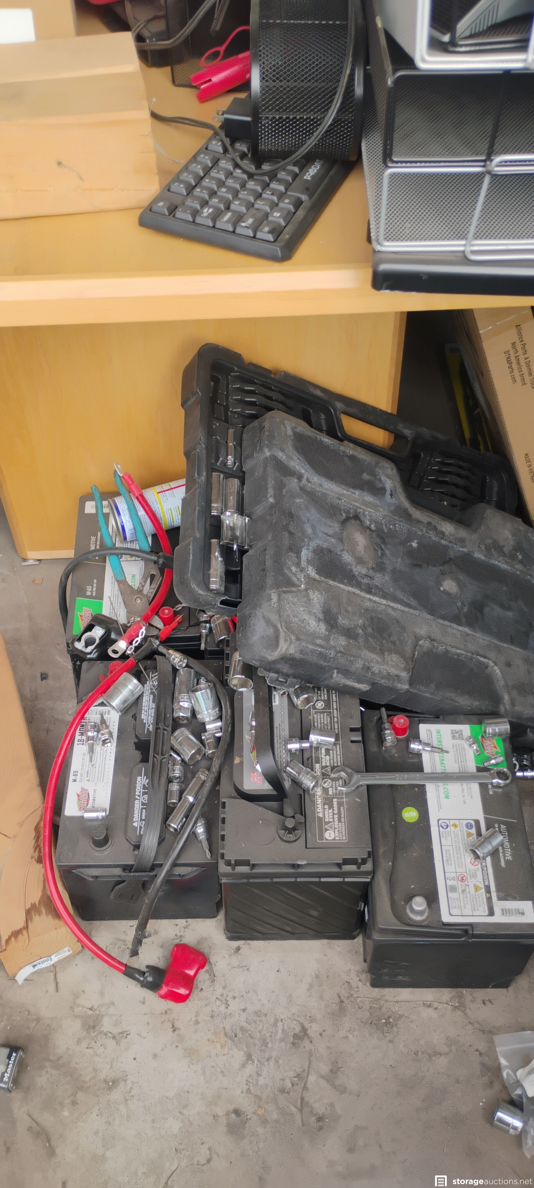 Desk, car or truck batteries, gas can's, Hydrolic fluid, computer monitor , file cabinets, folding table , and much more.