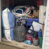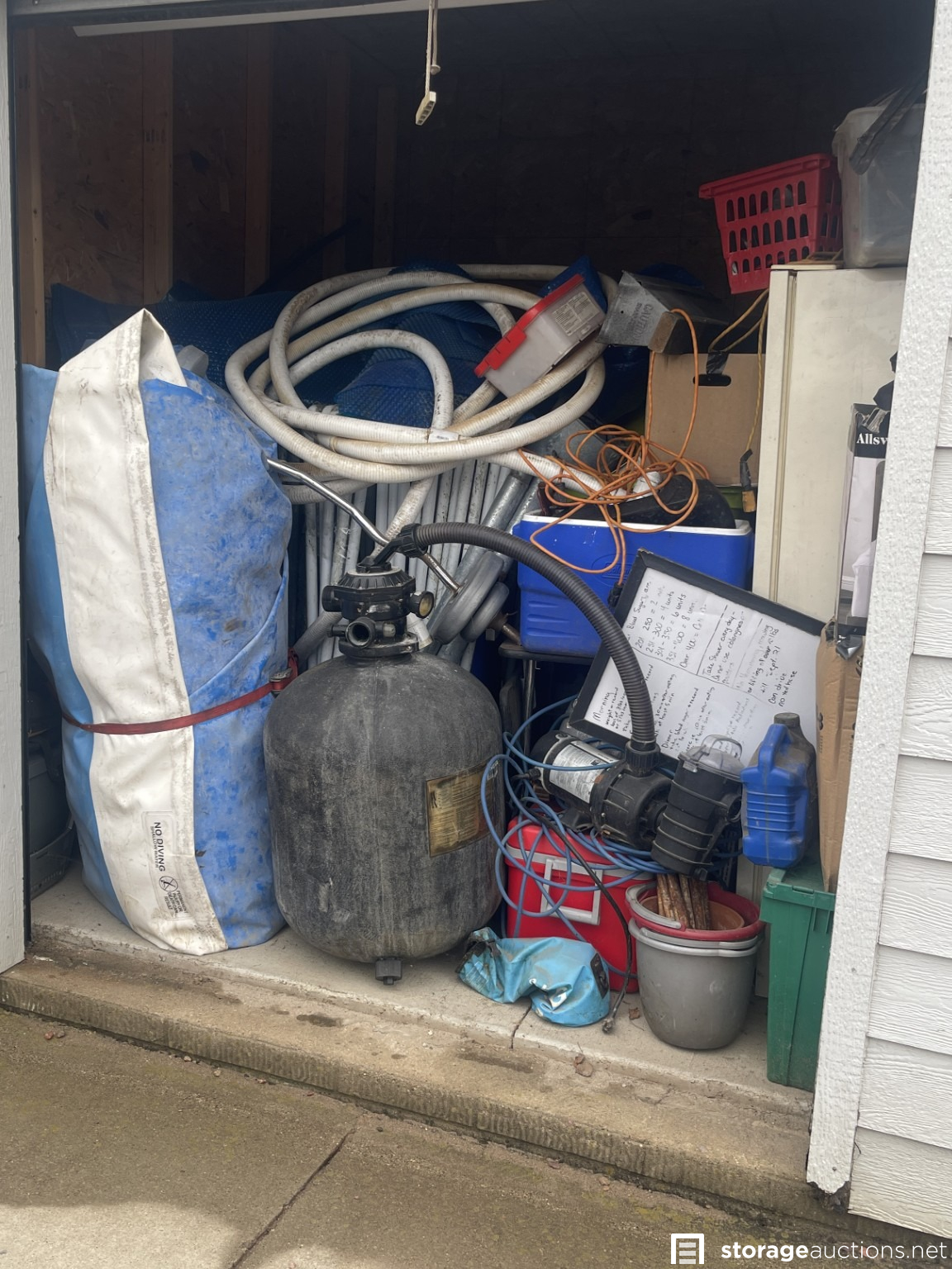 Aboveground pool with pump, refrigerator, coolers, and other miscellaneous items.