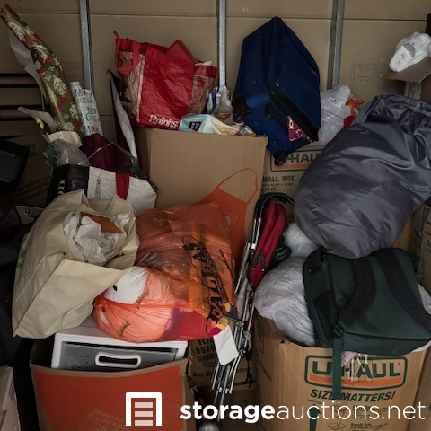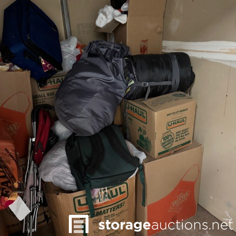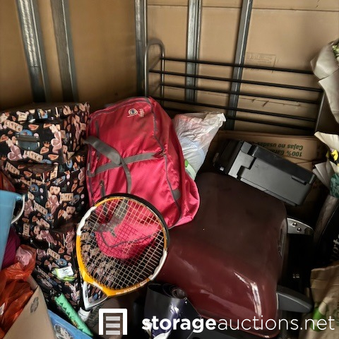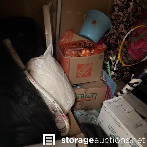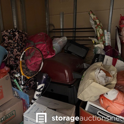This unit appears to contain, shoe rack 15+ boxes, stroller, tennis rackets 3 duffel bags, bag pack, decorative boxes, grill, sword, misc items.