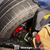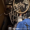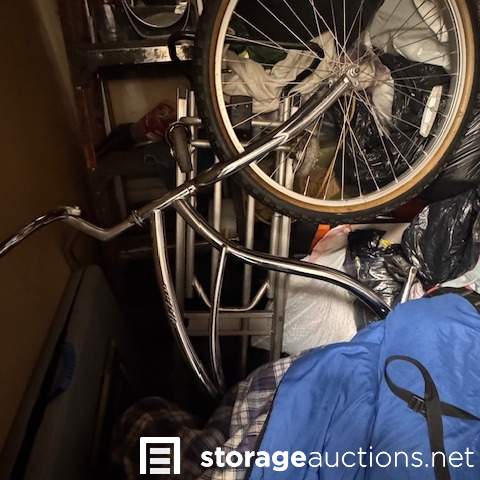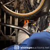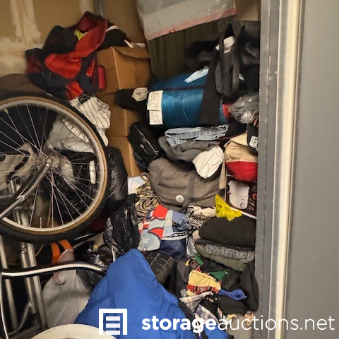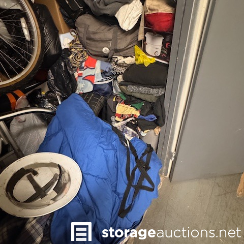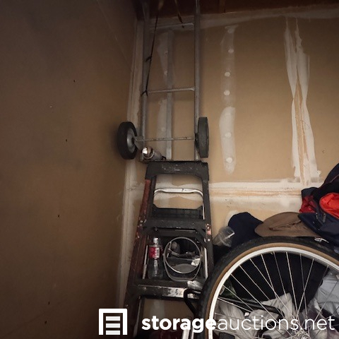 Indoor second floor lift access. This unit appears to contain, bags, clothing, bedding, 4+ boxes, bike, ladder, dollies, hard hat, folding table, golf clubs, tire, sleeping bag, duffel bag, tool bag, misc items.