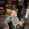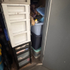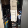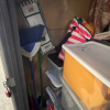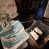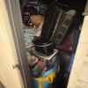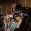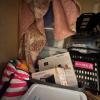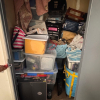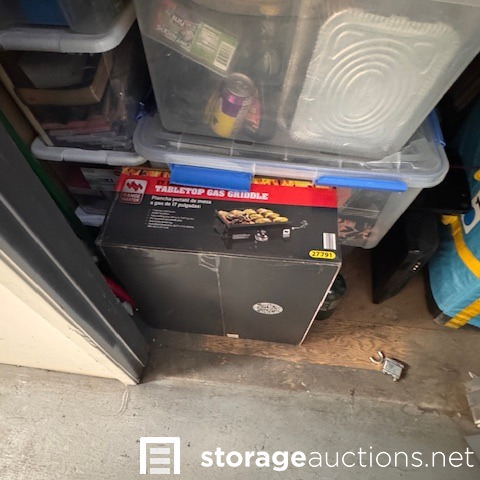 Inside second floor double door unit. This unit appears to contain, clothing, bedding, monitor, 20+ totes, gas griddle, kitchen items, basket, tv, misc items.