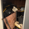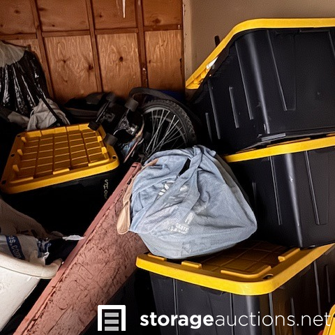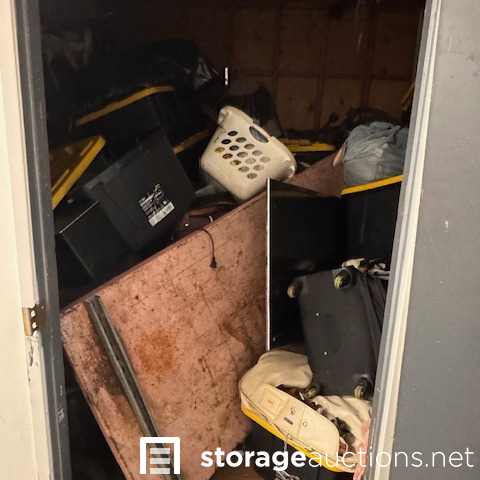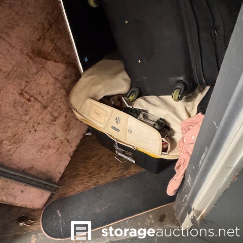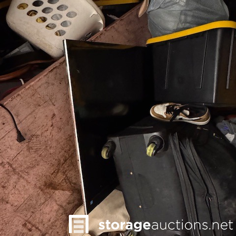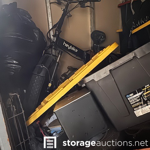 Inside second floor lift access. This unit appears to contain, bags, clothing, suitcase, 10+ boxes, TV, E bike, skate boards, bike parts, shoes, metal table, hamper, misc items.