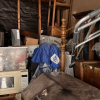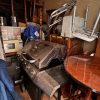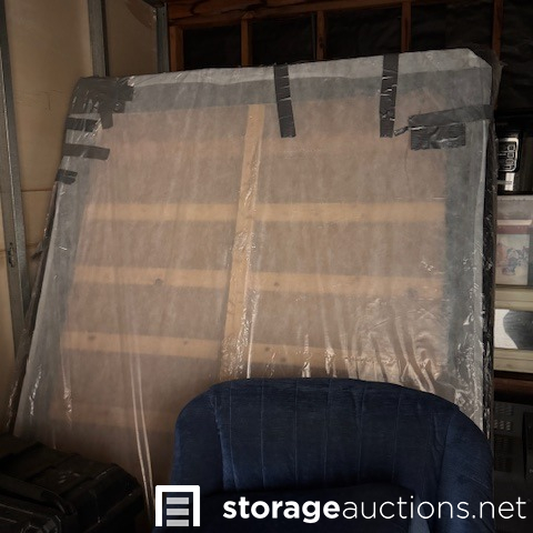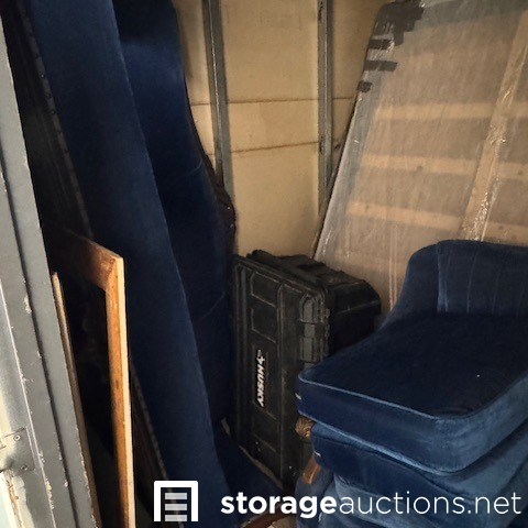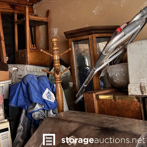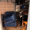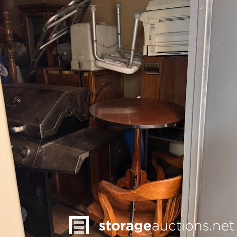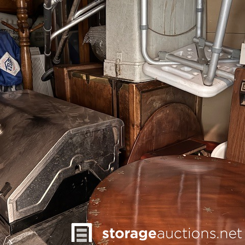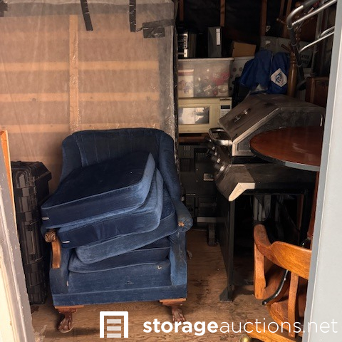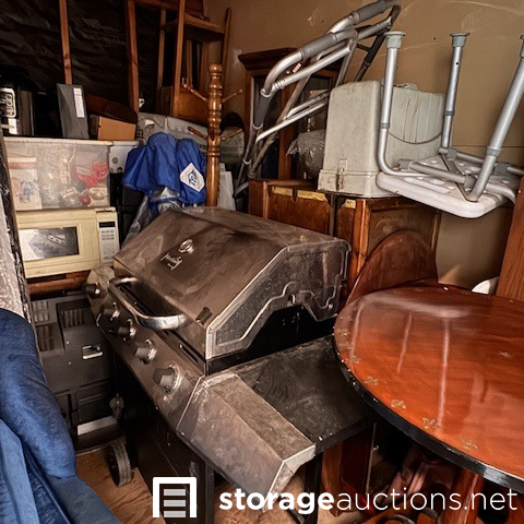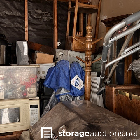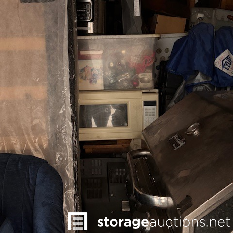 second floor unit lift access. This unit appears to contain, couch, chair, rolling tote, small table, coffee table, BBQ, minnie fridge, TV, walker, shower chair, printer, EZ-UP, china cabinet, microwave, coat rack, mirror, crock pot, gas can sewing machine, box spring. misc items.