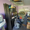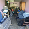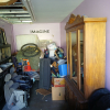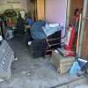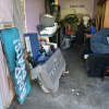 cabinet, signs, captain chair, tv stand, small pool table, ice chest, love seat, foot stool, tires, cart, boxes, clothes,