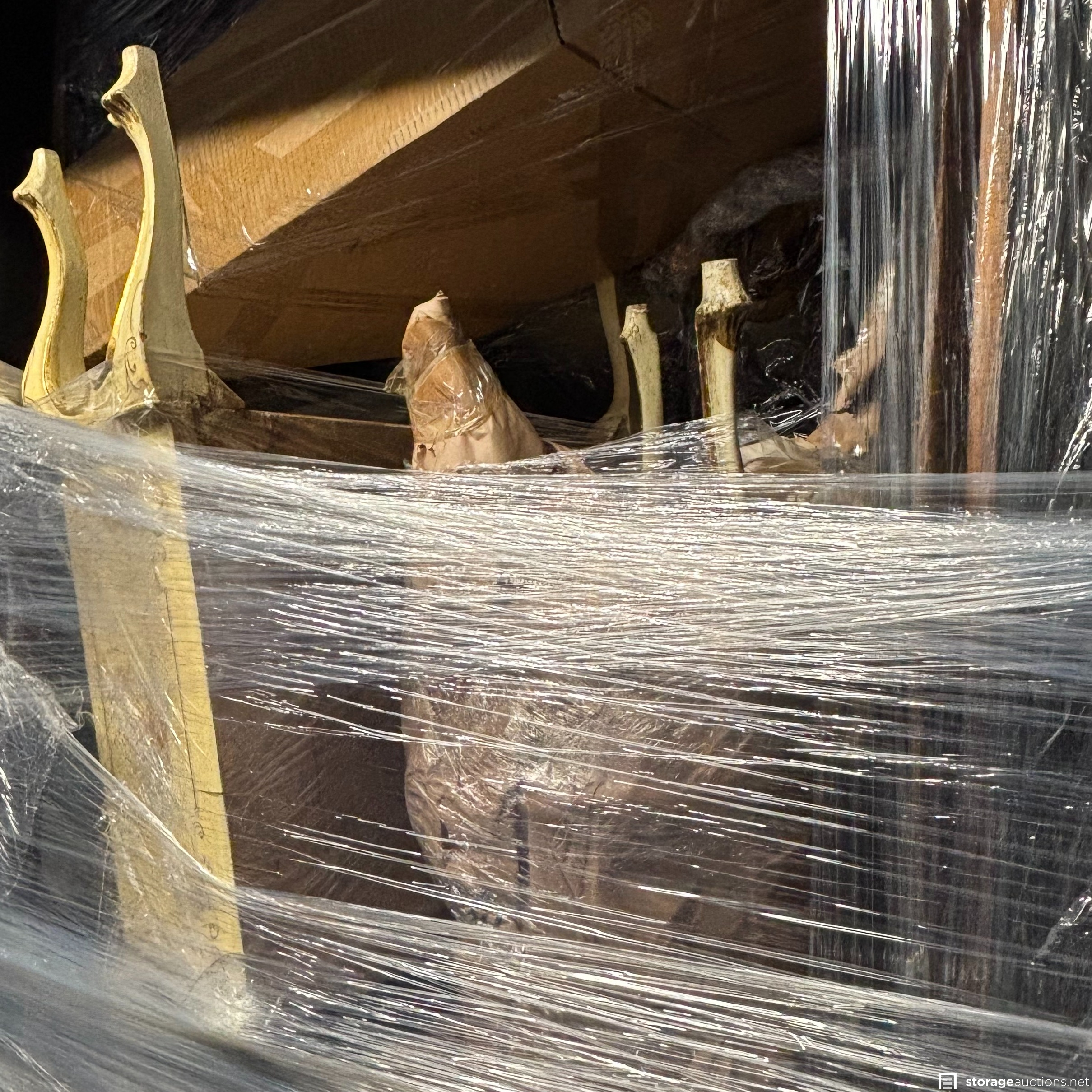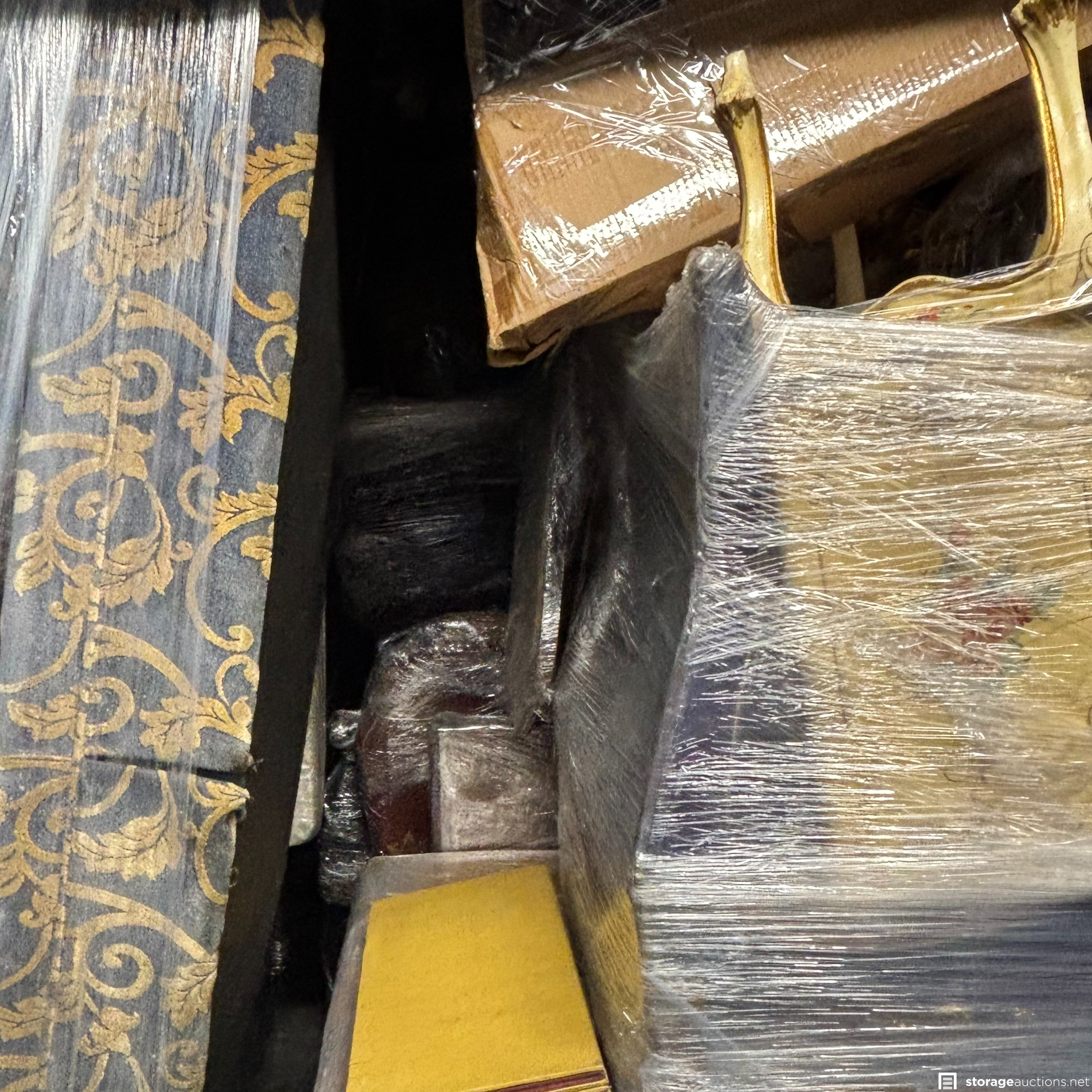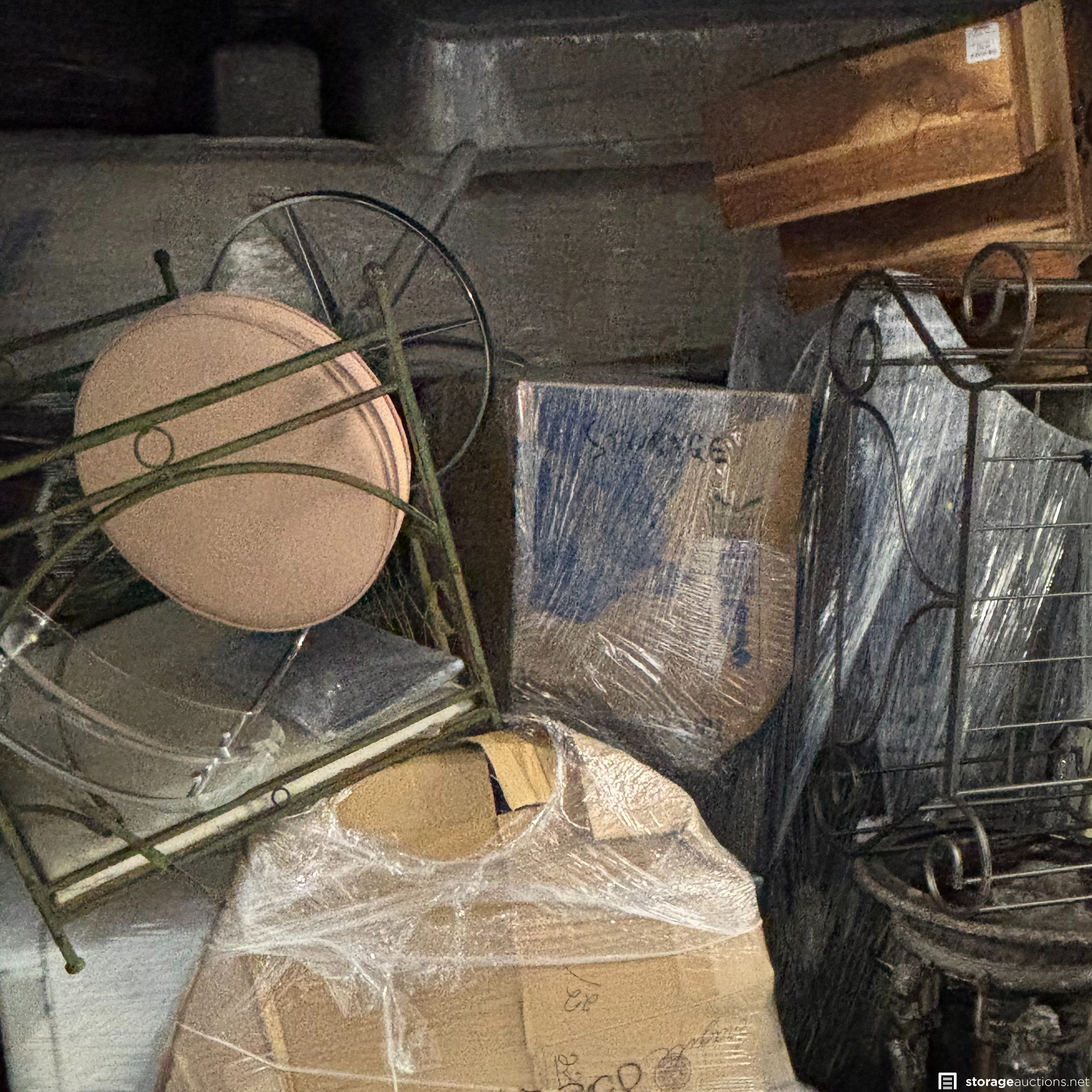 Unit appears to contain miscellaneous household goods, sofa, furniture & decor, mattress', bar stools, pet accessories and miscellaneous containers of unknown content.