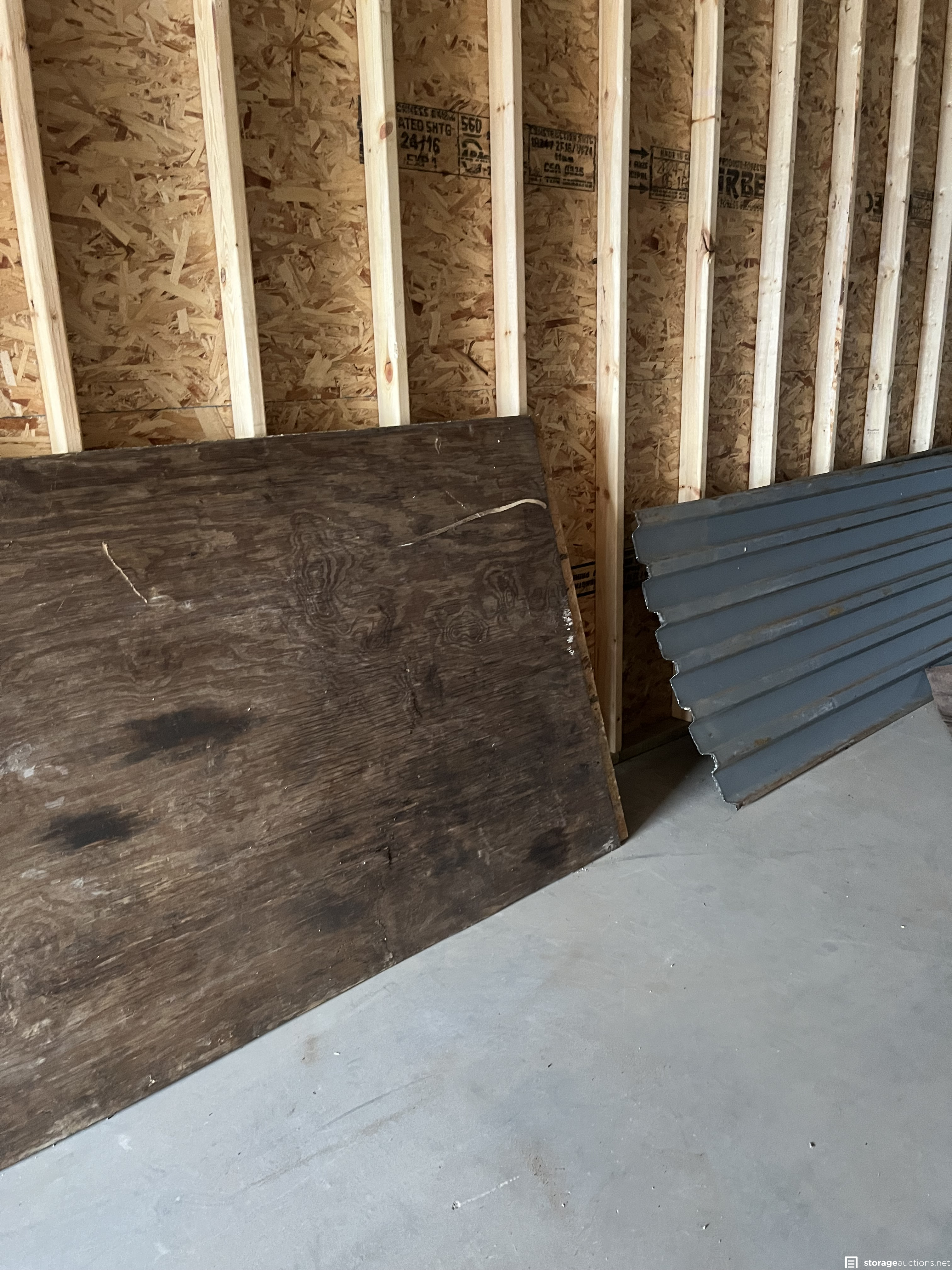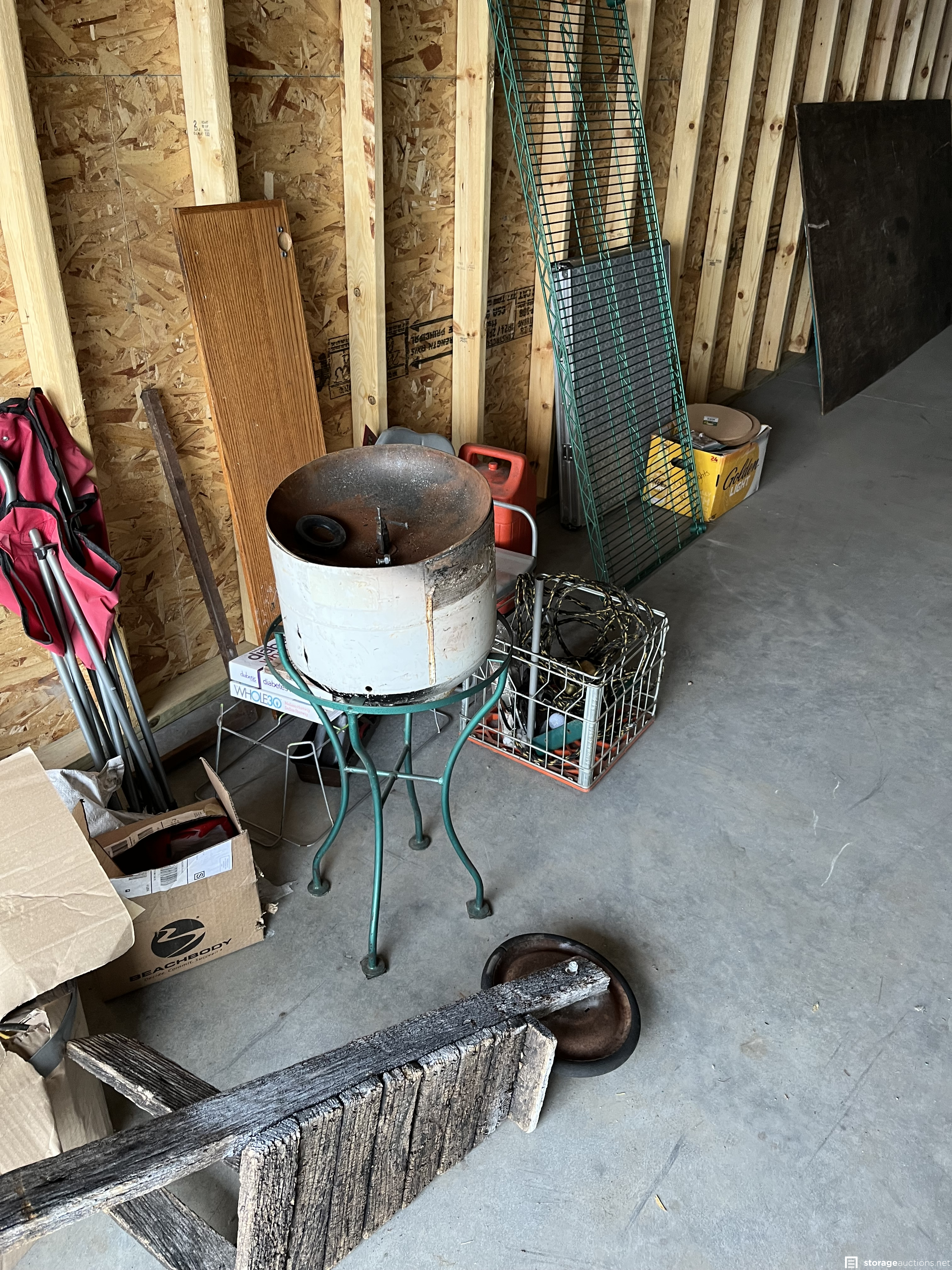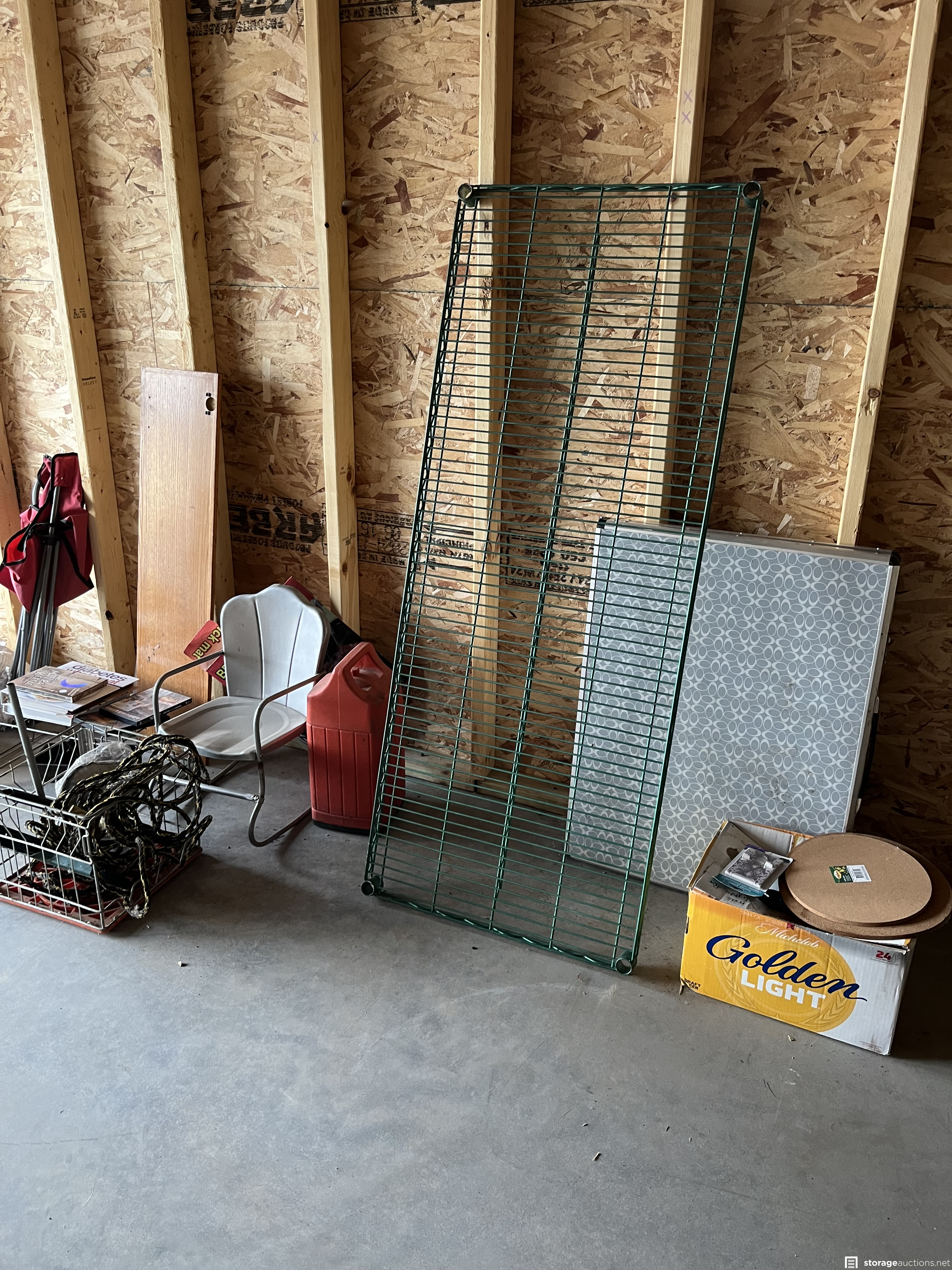 This unit appears to contain steel sheets, plywood, chipboard, wire shelf, wood, side table, Christmas decor, kids chair, milk crate, wagon wheel, decor items, locker, motorcycle fenders, awning with poles and more