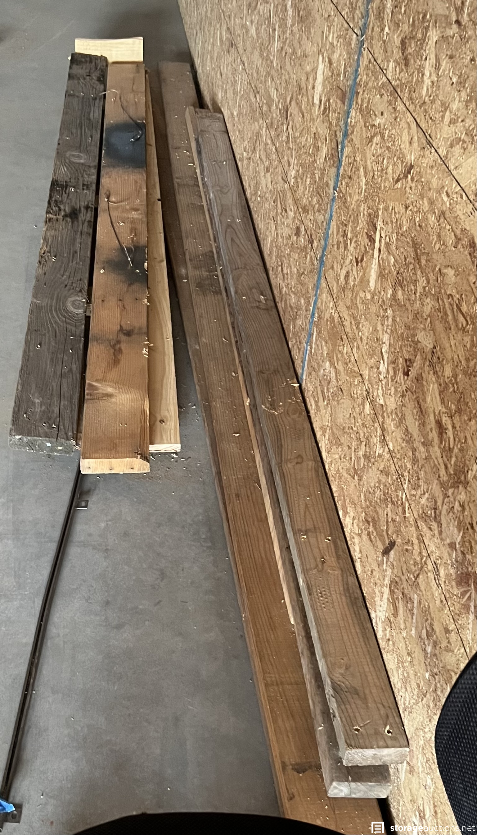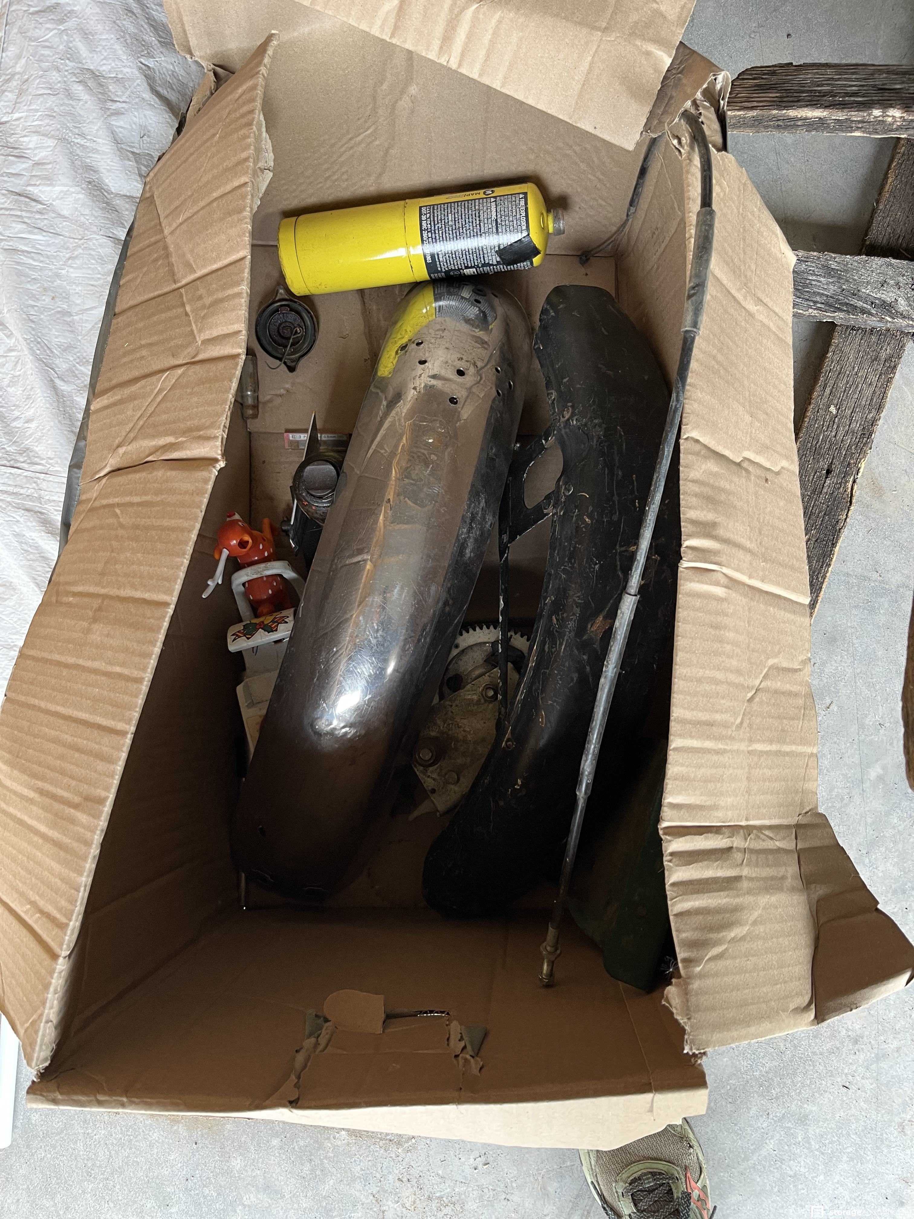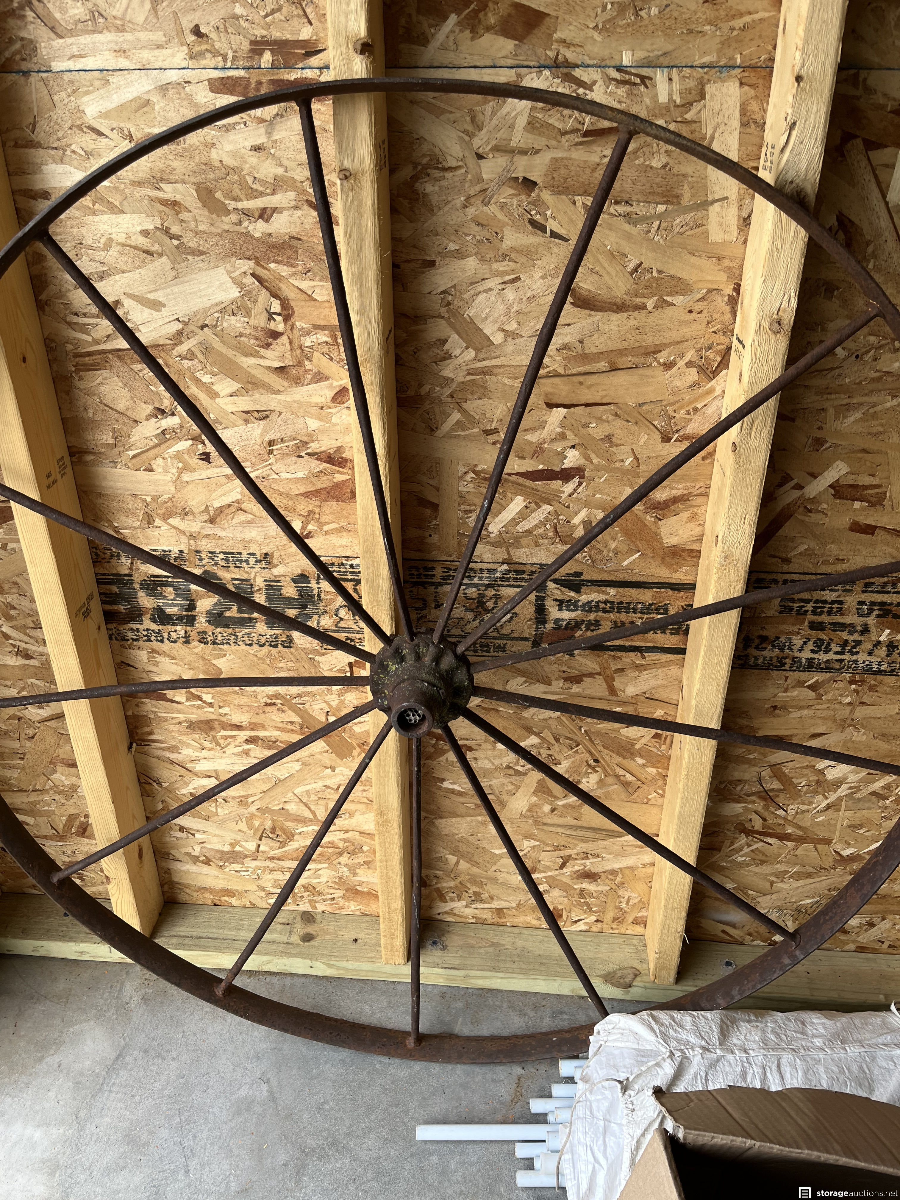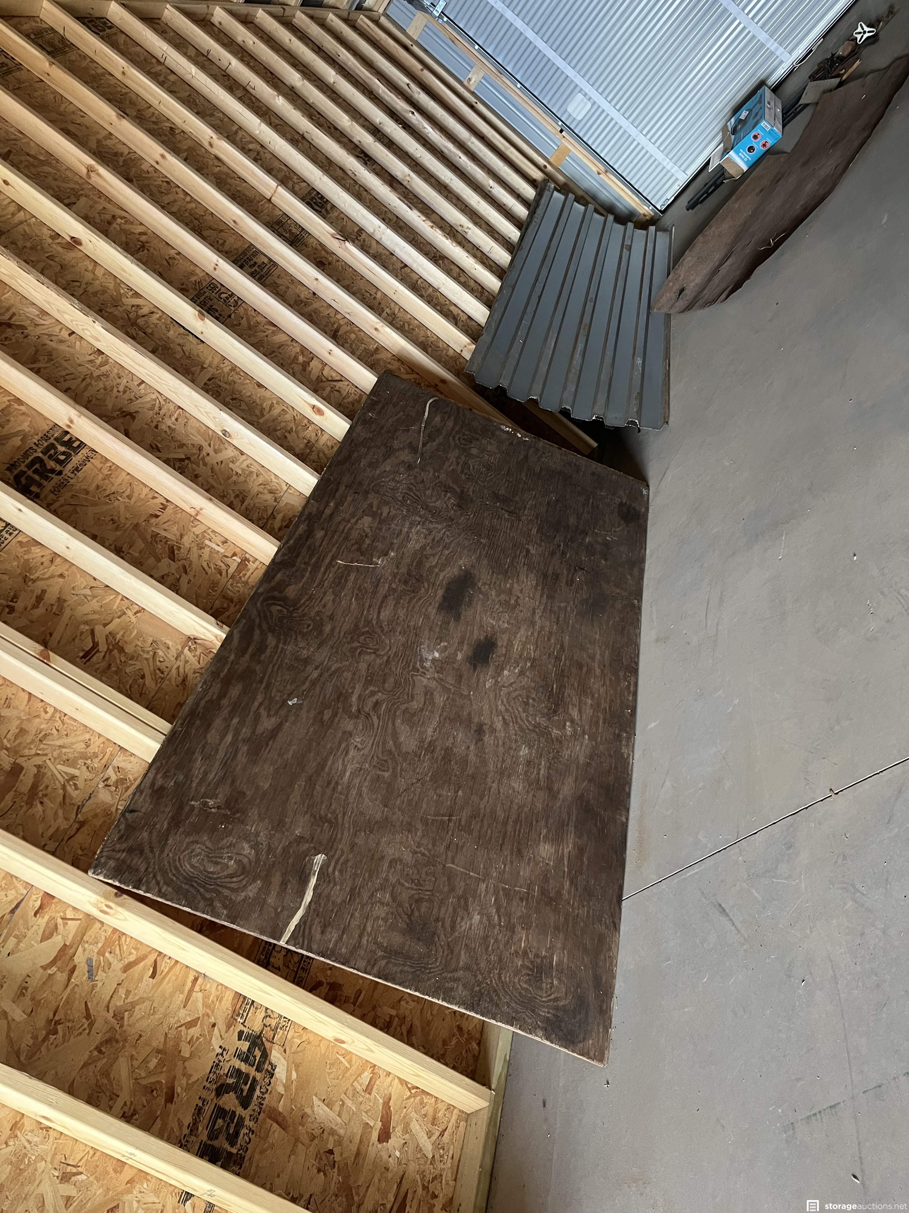 This unit appears to contain steel sheets, plywood, chipboard, wire shelf, wood, side table, Christmas decor, kids chair, milk crate, wagon wheel, decor items, locker, motorcycle fenders, awning with poles and more