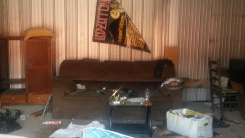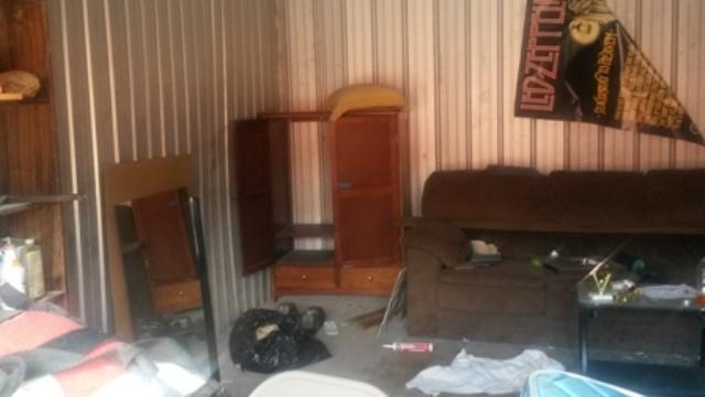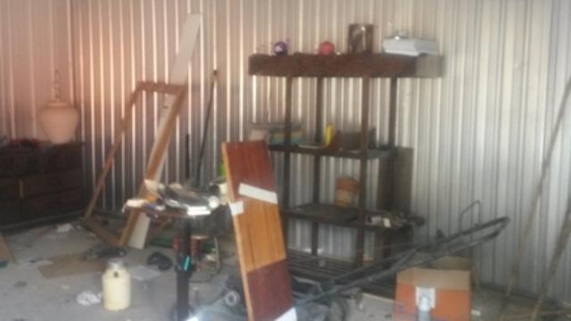 This unit appears to contain bed, couch, shelves, lawn mower and other household items