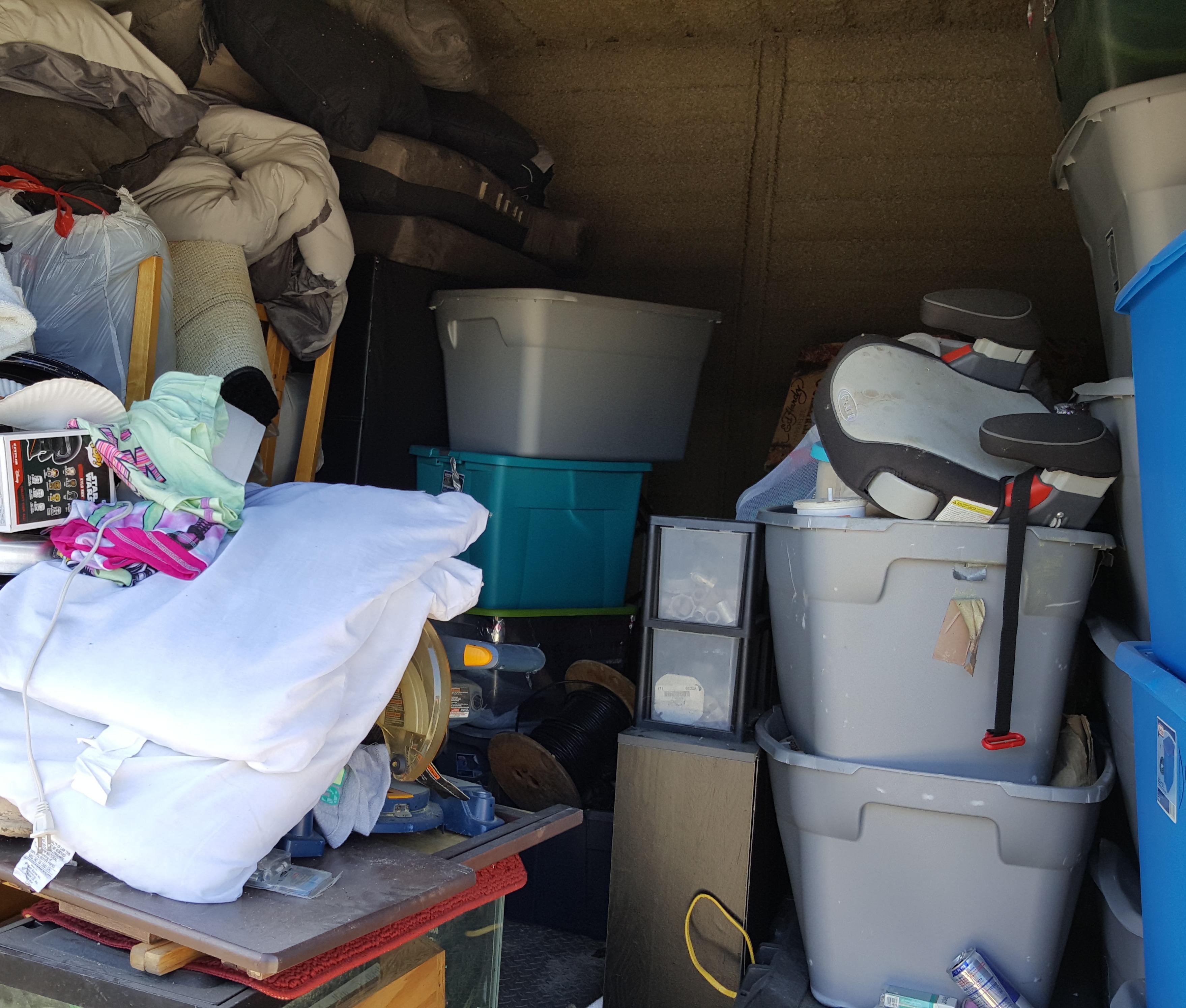 Many tubs, shelves, clothes, baby items, rugs, fish tank, tools, and misc. items