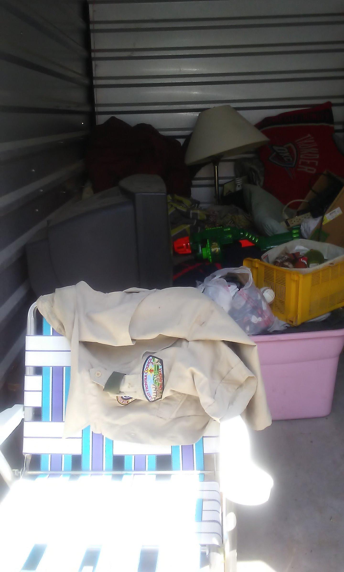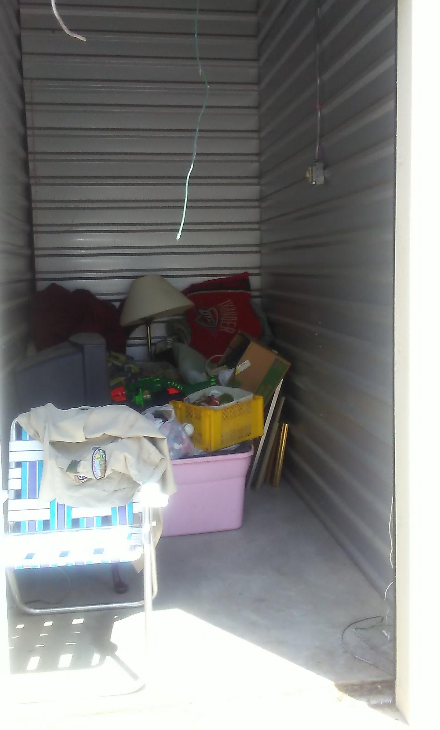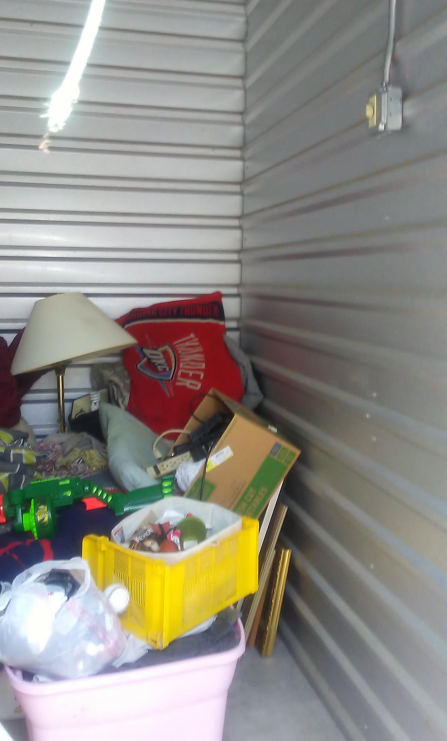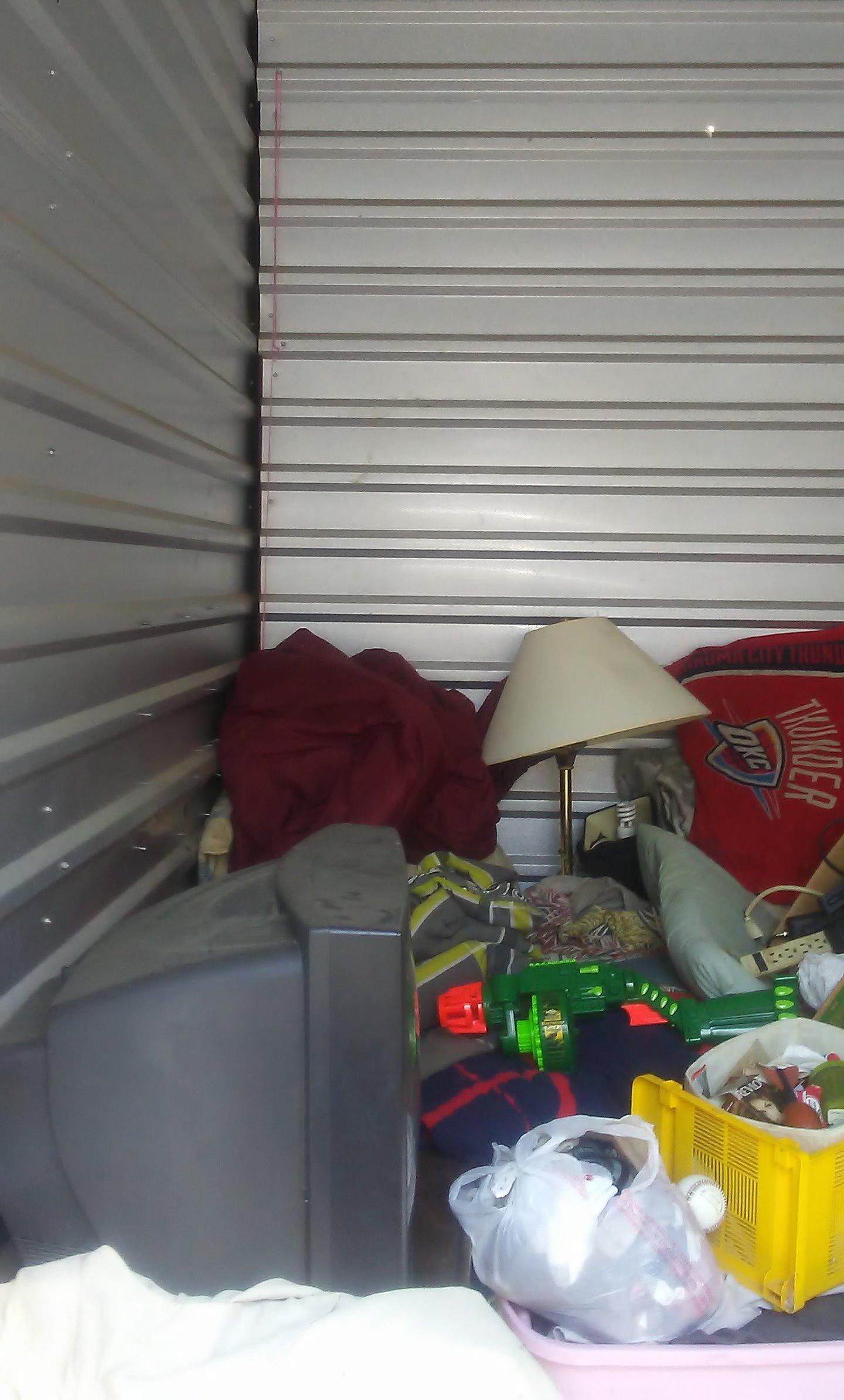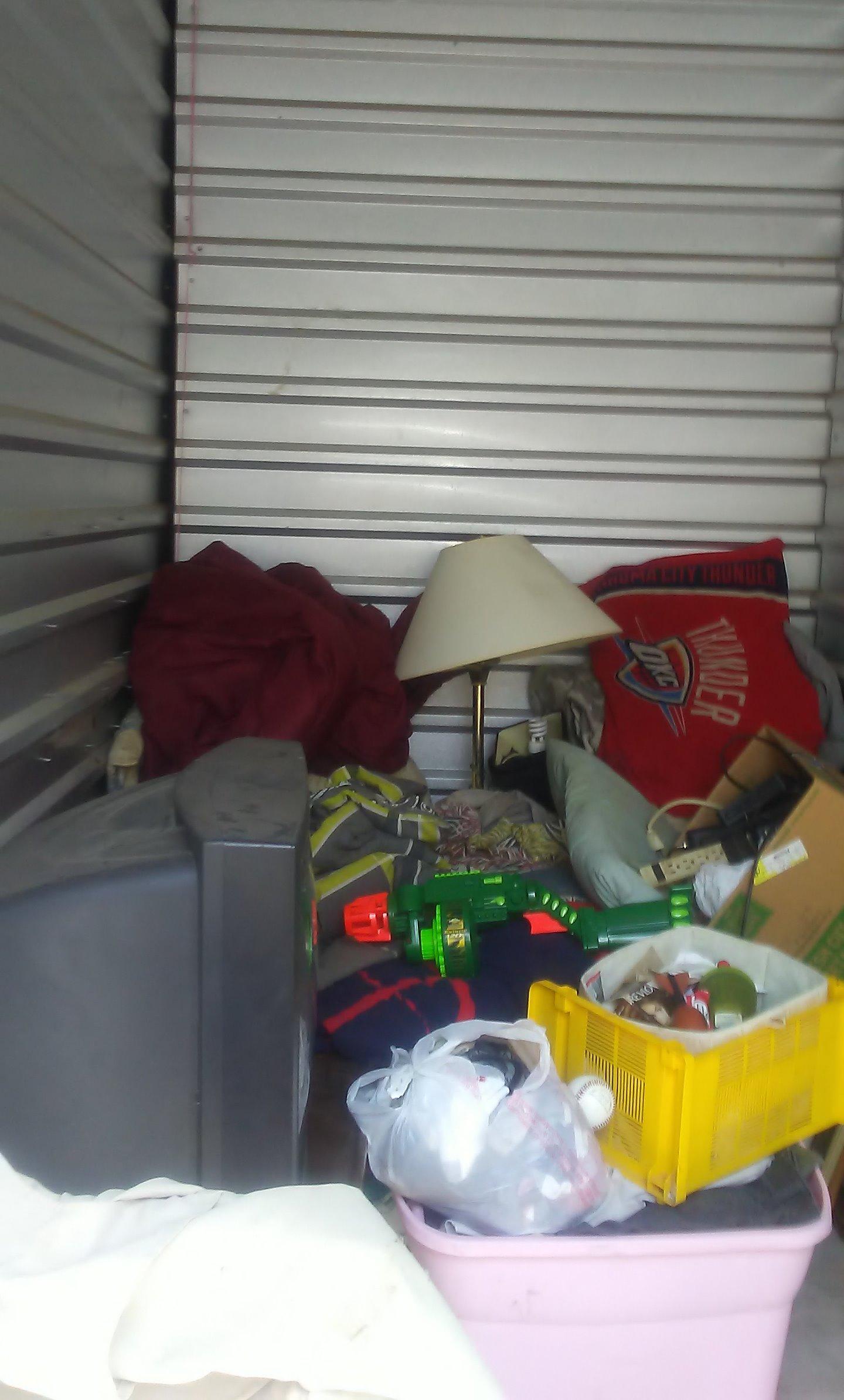 Unit seems to have: TV, coffee table, pictures, lamp, Nerf gun, pillows, blankets, lawn chair, tubs