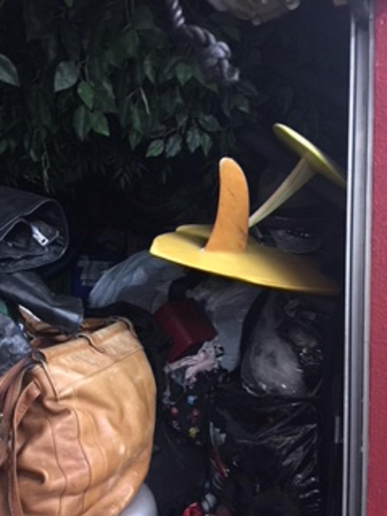 UNIT APPEARS TO HAVE: Surfboards, household items, clothing, bins, landscape/beach cart, Drum set, bicycles, camping gear