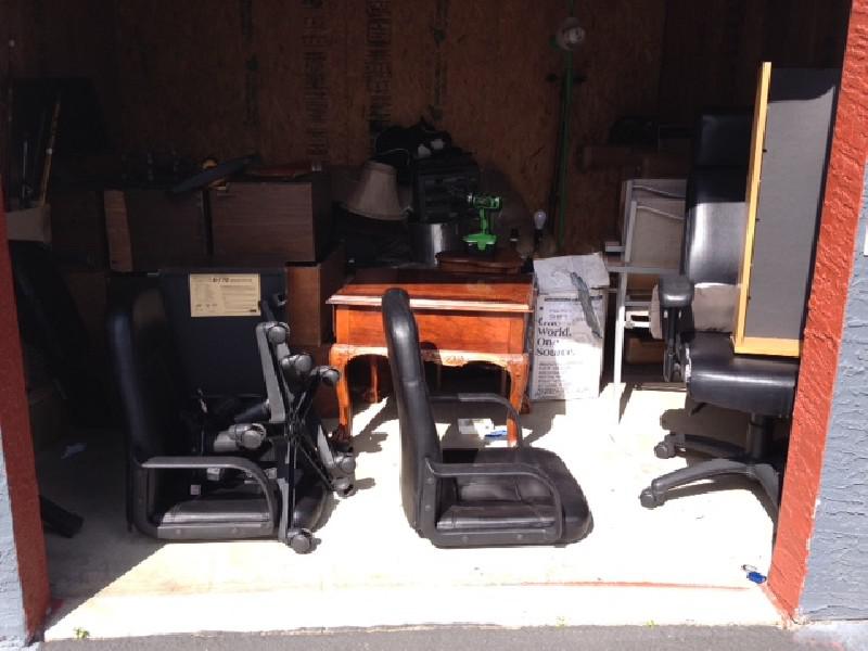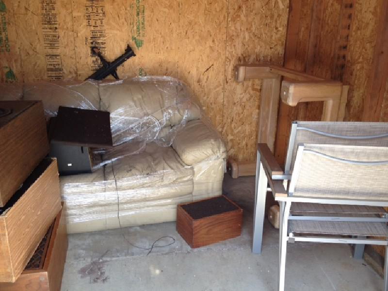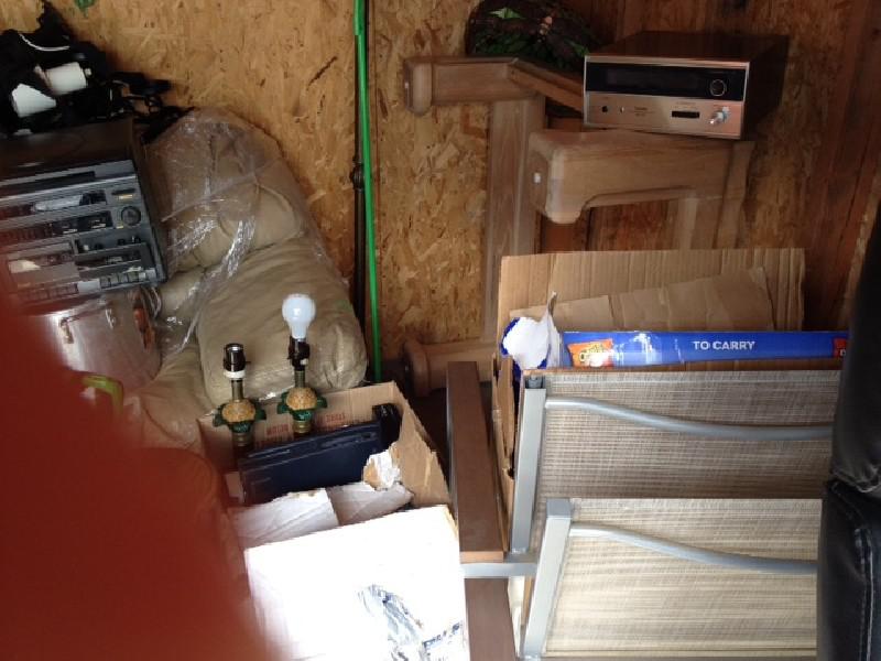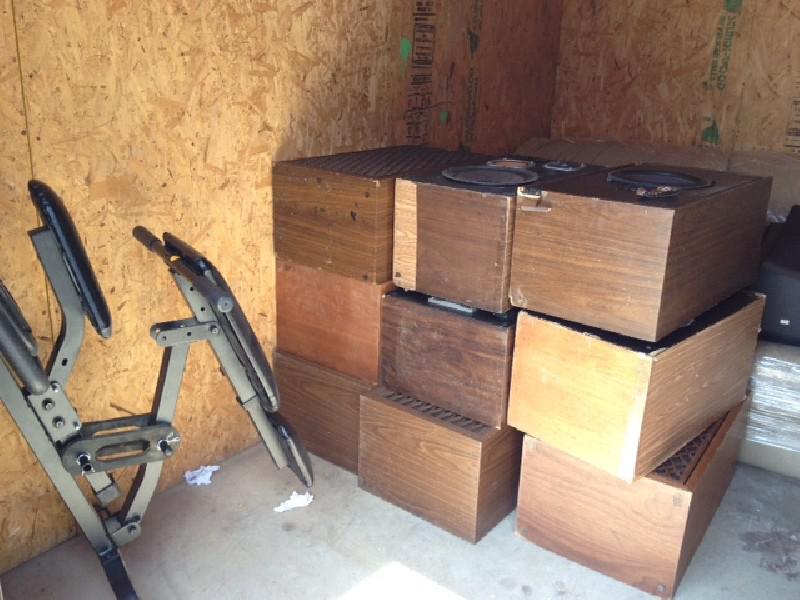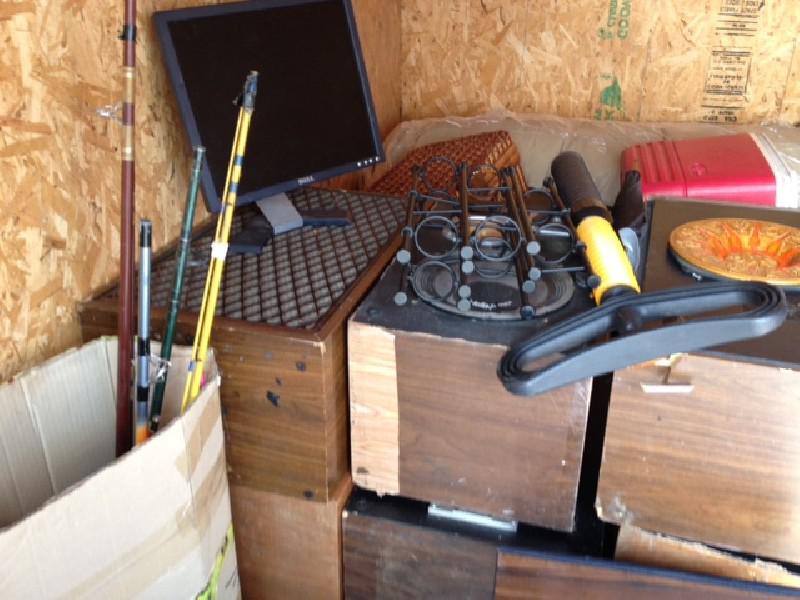 fishing poles speakers couch desk chairs coffee table stereo lamps Tiffany shade drill patio table and chairs picnic basket